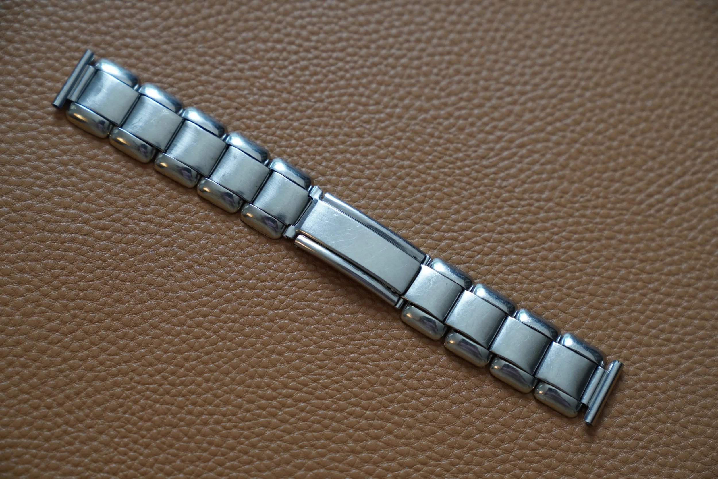 This steel Gay Frères is an incredibly comfortable and classic bracelet from the 1940s It features the classic rivet style bracelet with a stretch feature. The straight end links measure 16mm in width. It measures approximately 6.3 inches in length.