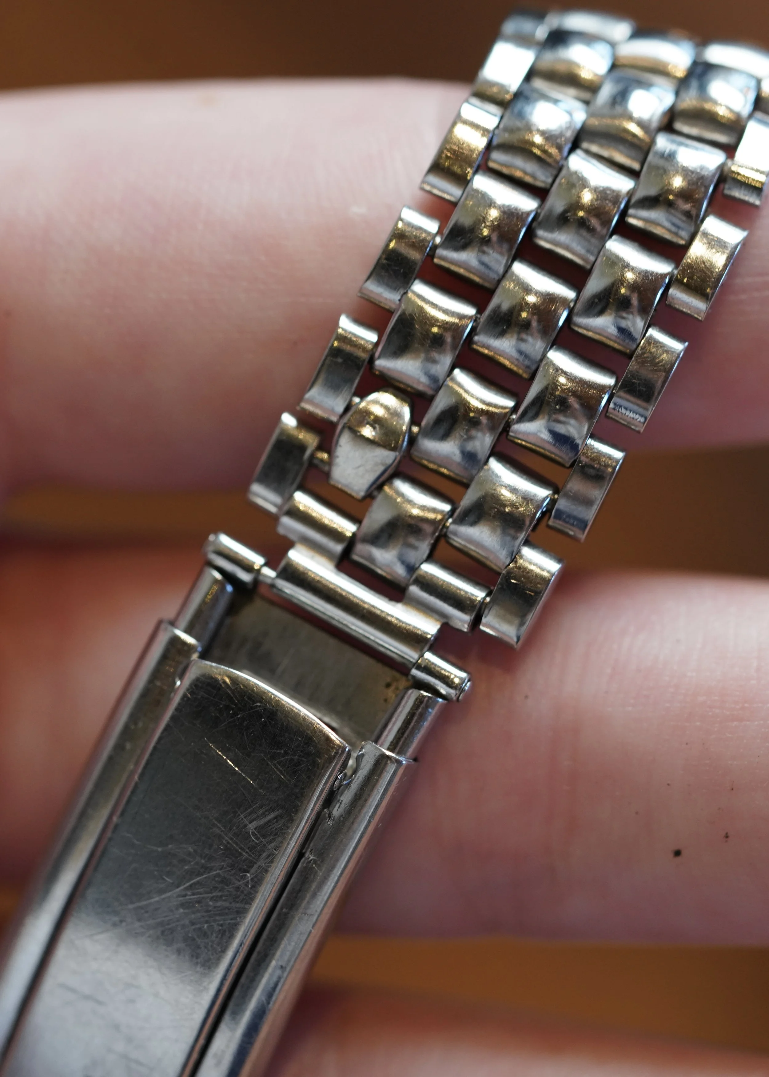 This steel bracelet is very cool Gladiator style. It was produced by Gay Frères. It features 17.5mm ends which are a bit rough. It measures approximately 6 inches in length at longest. It dates to the 1940s.