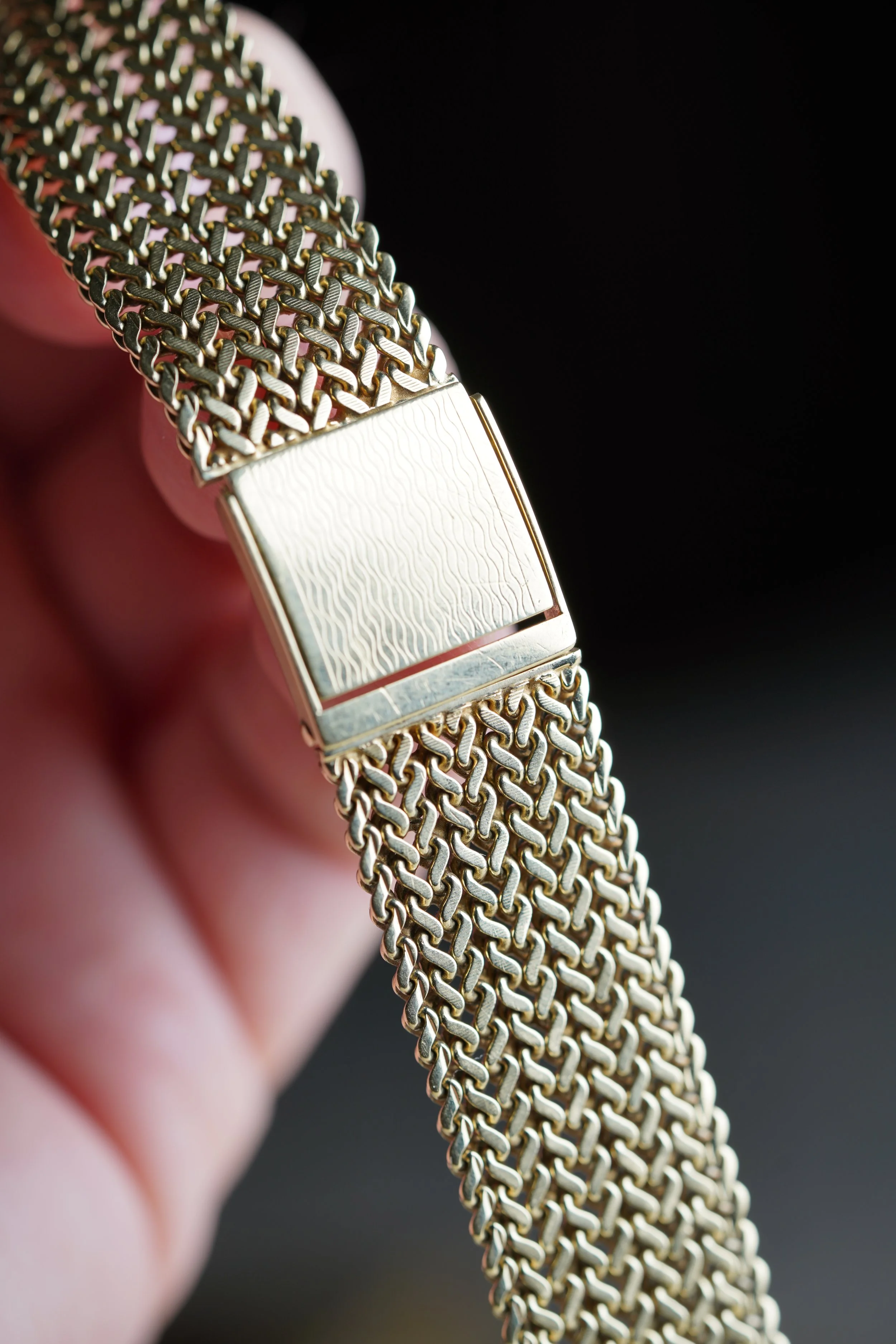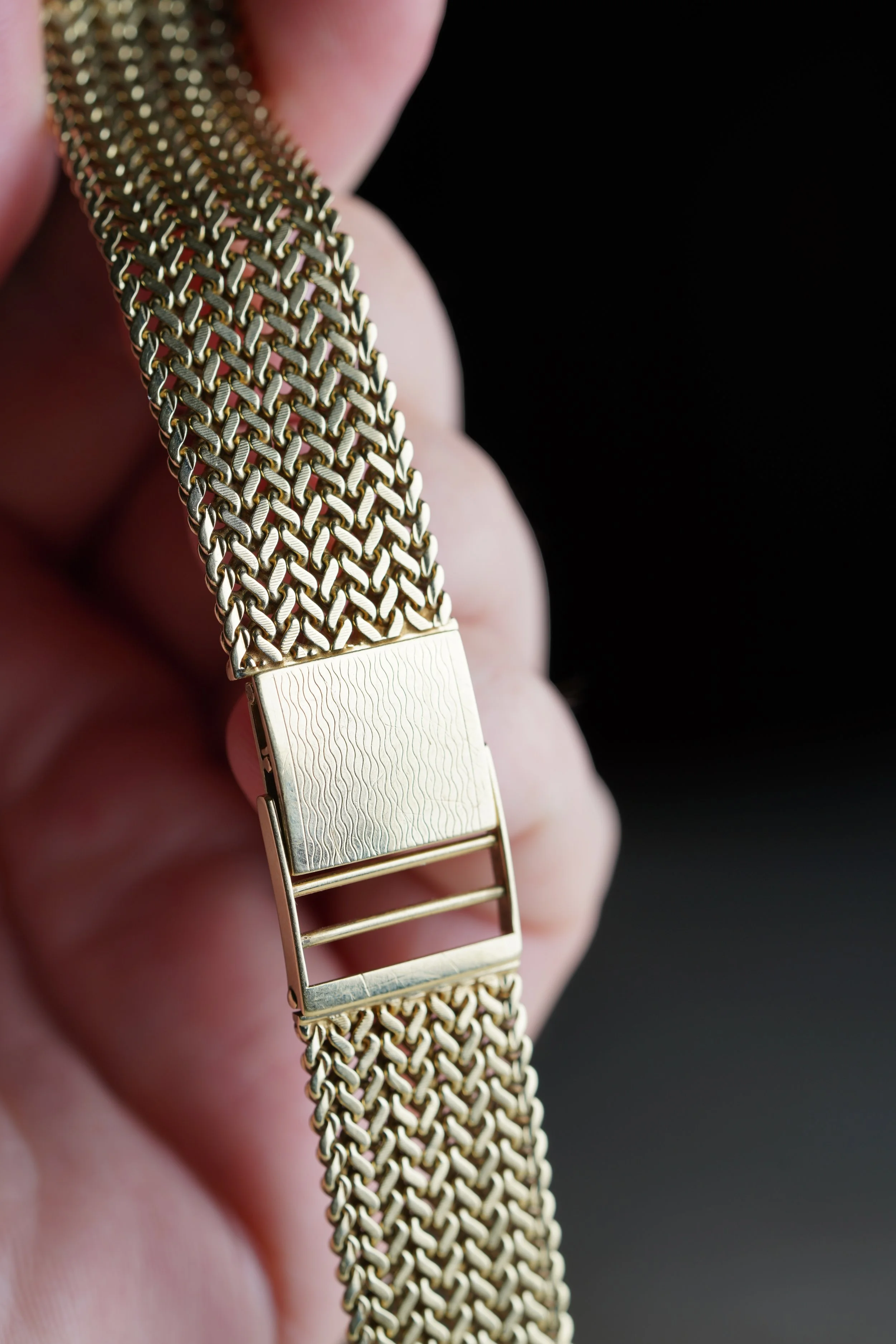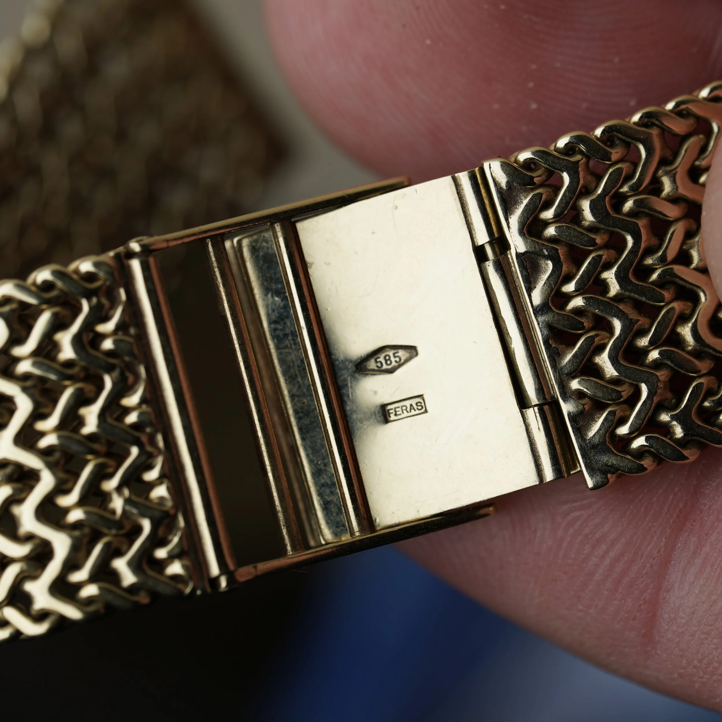 This yellow gold woven bracelet is very sophisticated creation by Feras. It features 17mm end links. It measures approximately 6.35 inches in length.