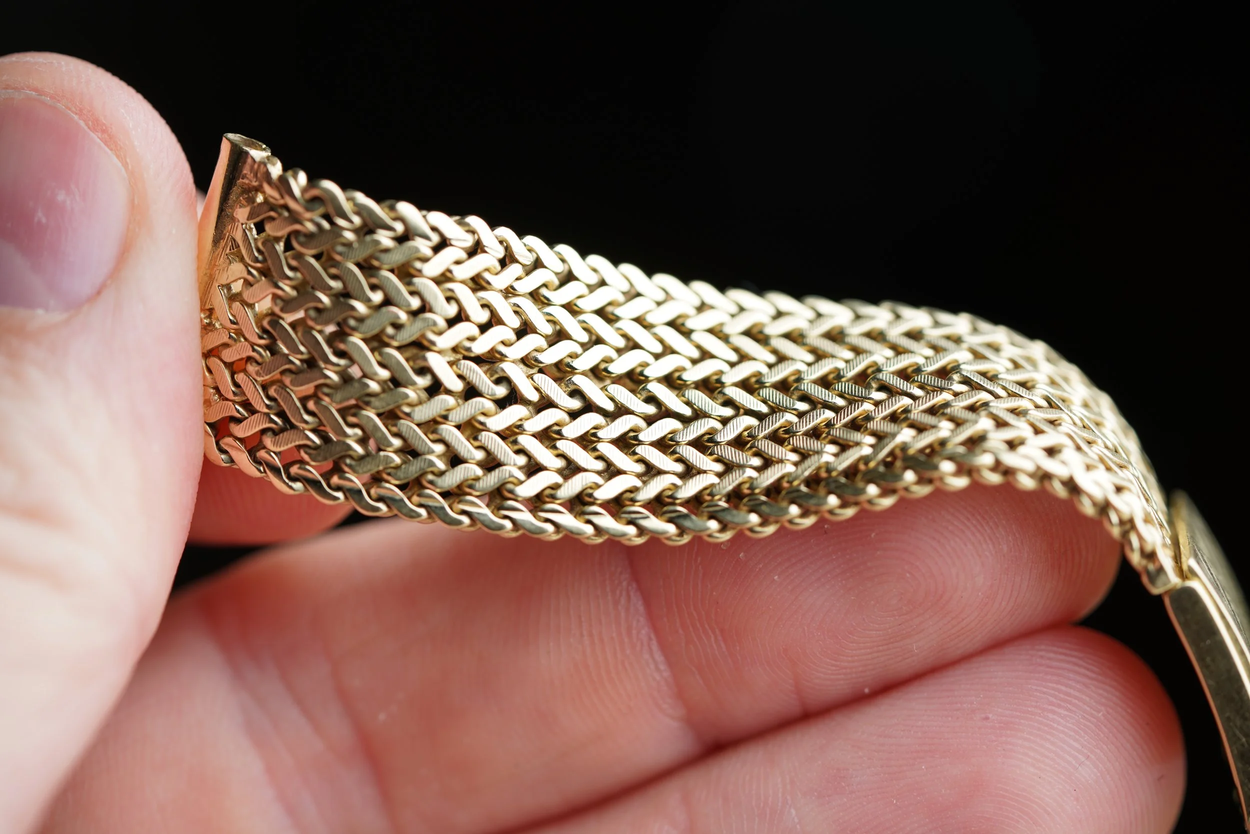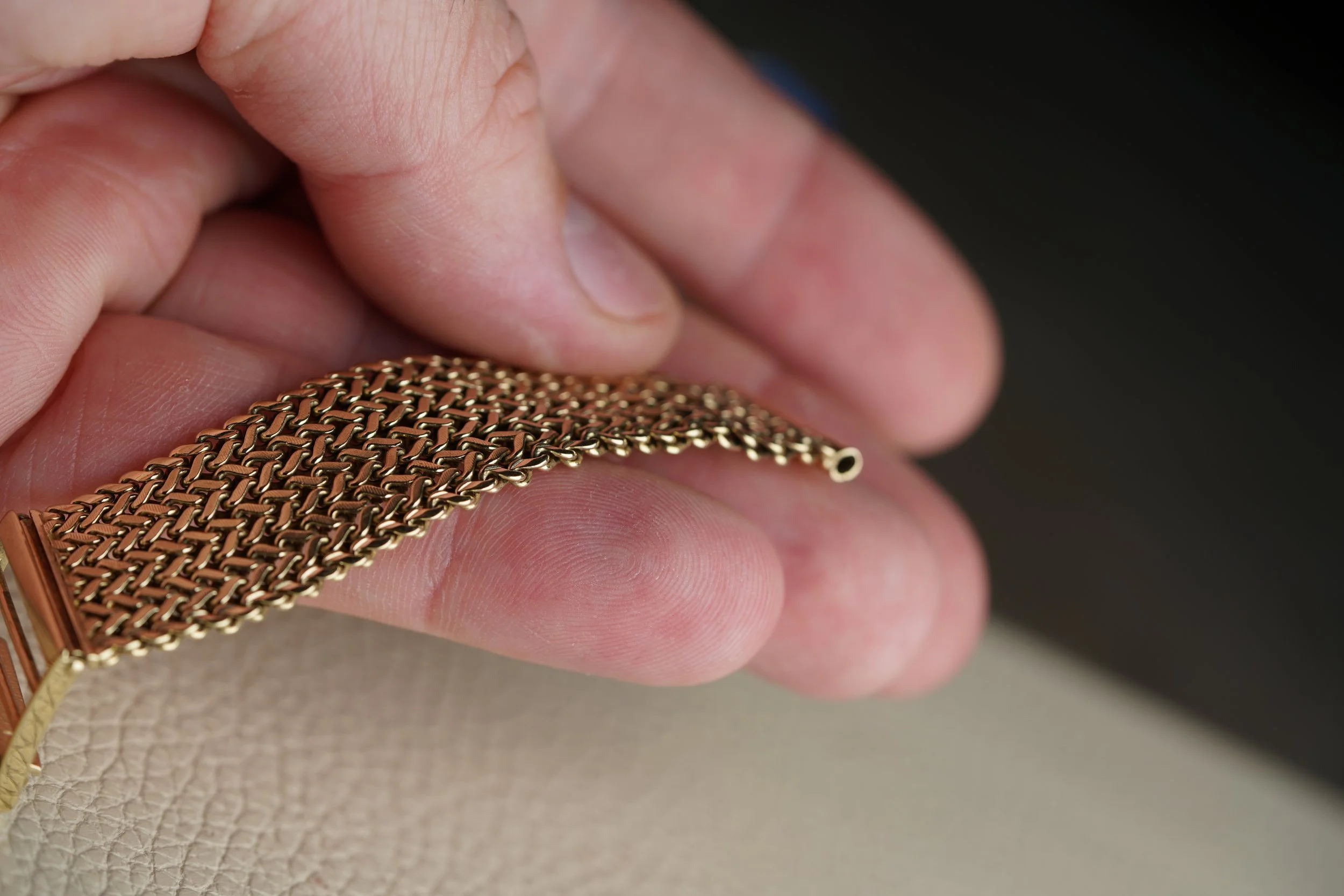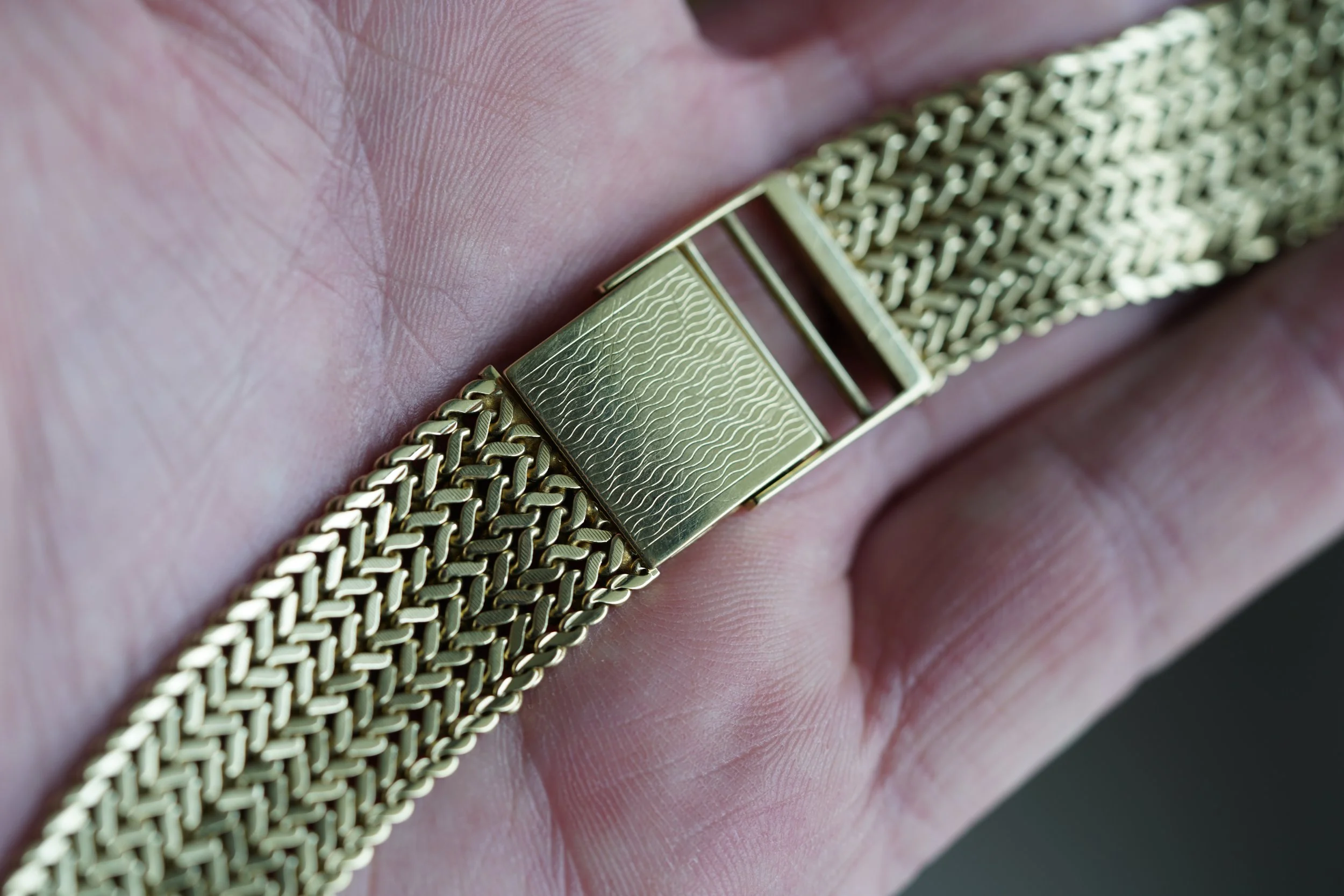 This yellow gold woven bracelet is very sophisticated creation by Feras. It features 17mm end links. It measures approximately 6.35 inches in length.