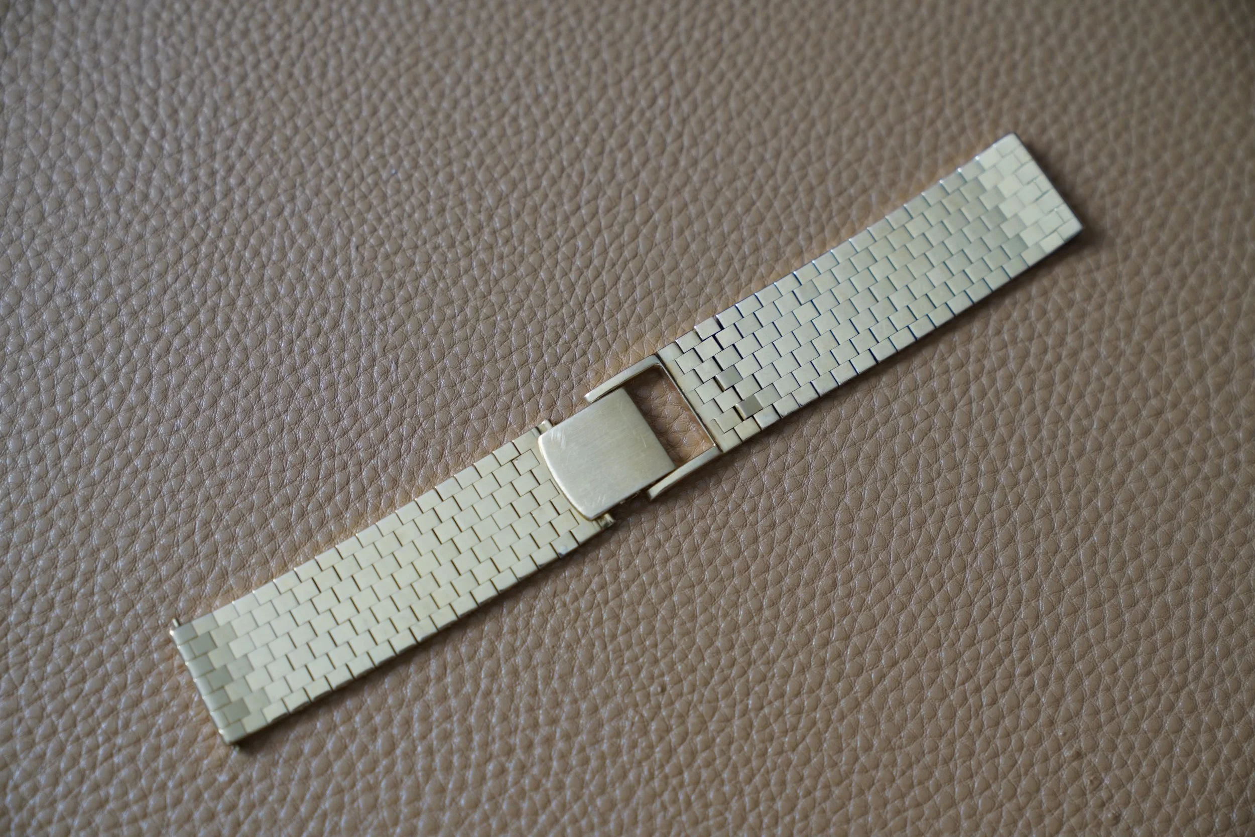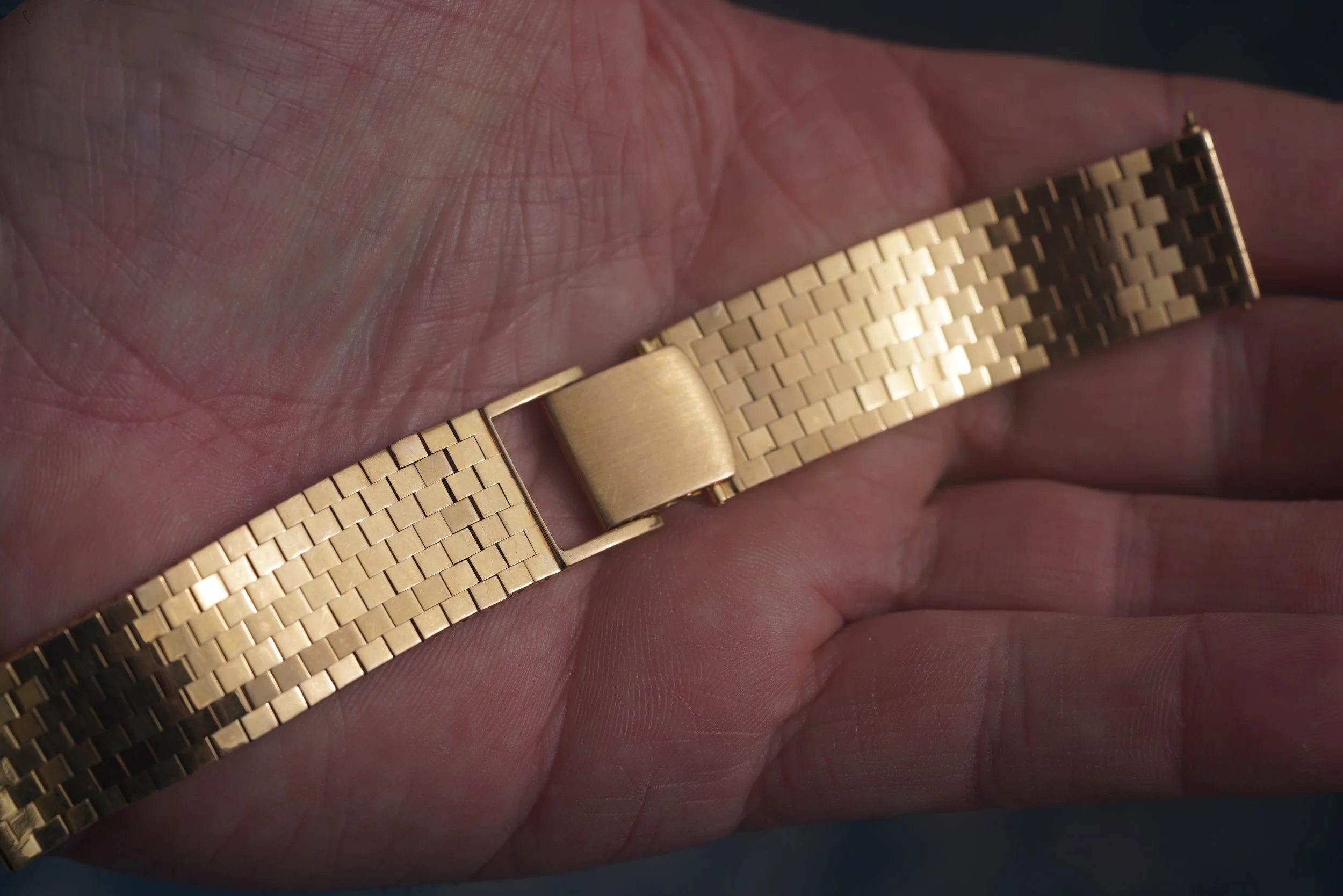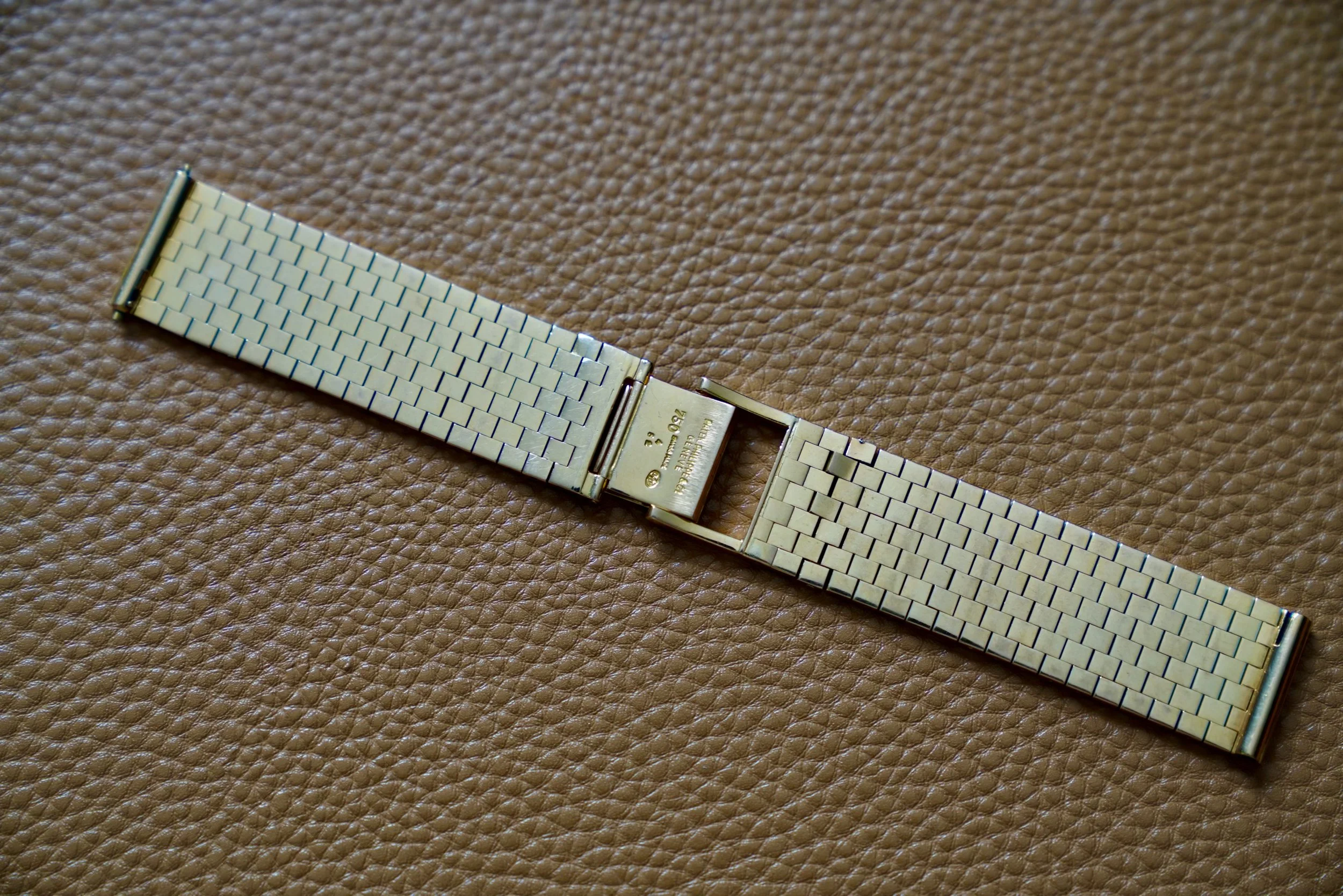 This rose gold bracelet is very sophisticated brick-style example made by Gay Frères. It features 18mm end links. The bracelet is able to fit flush when the buckle is closed closer in. It measures approximately 5.5 inches in length. It dates to the fourth quarter of 1962. The bracelet appears to be yellow in some of the photos, but the images of it in natural light and in person convey the rose gold color.