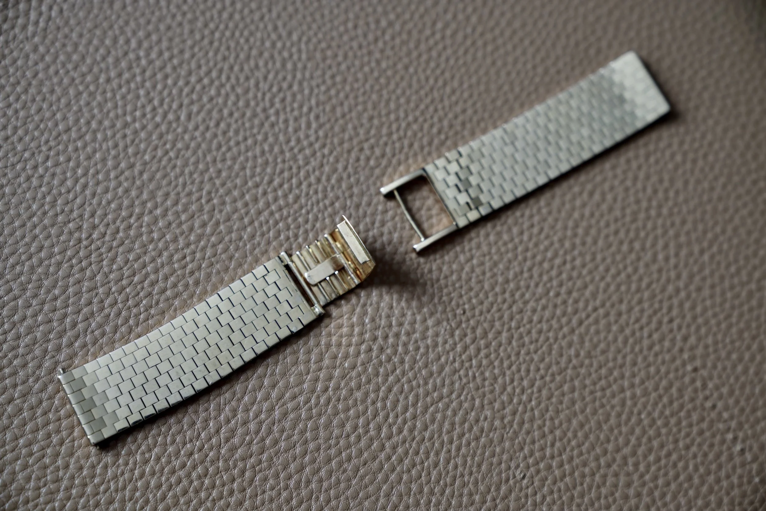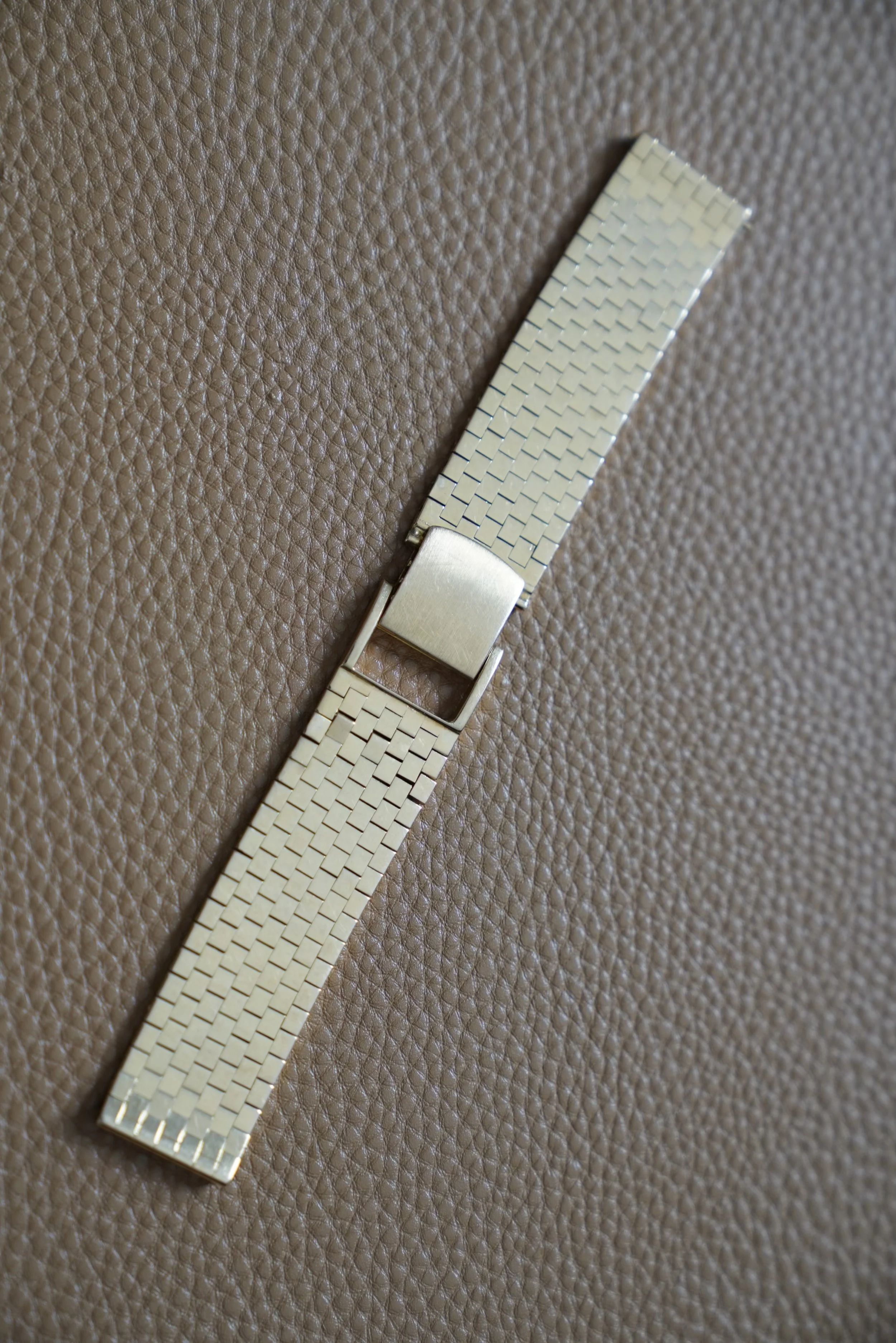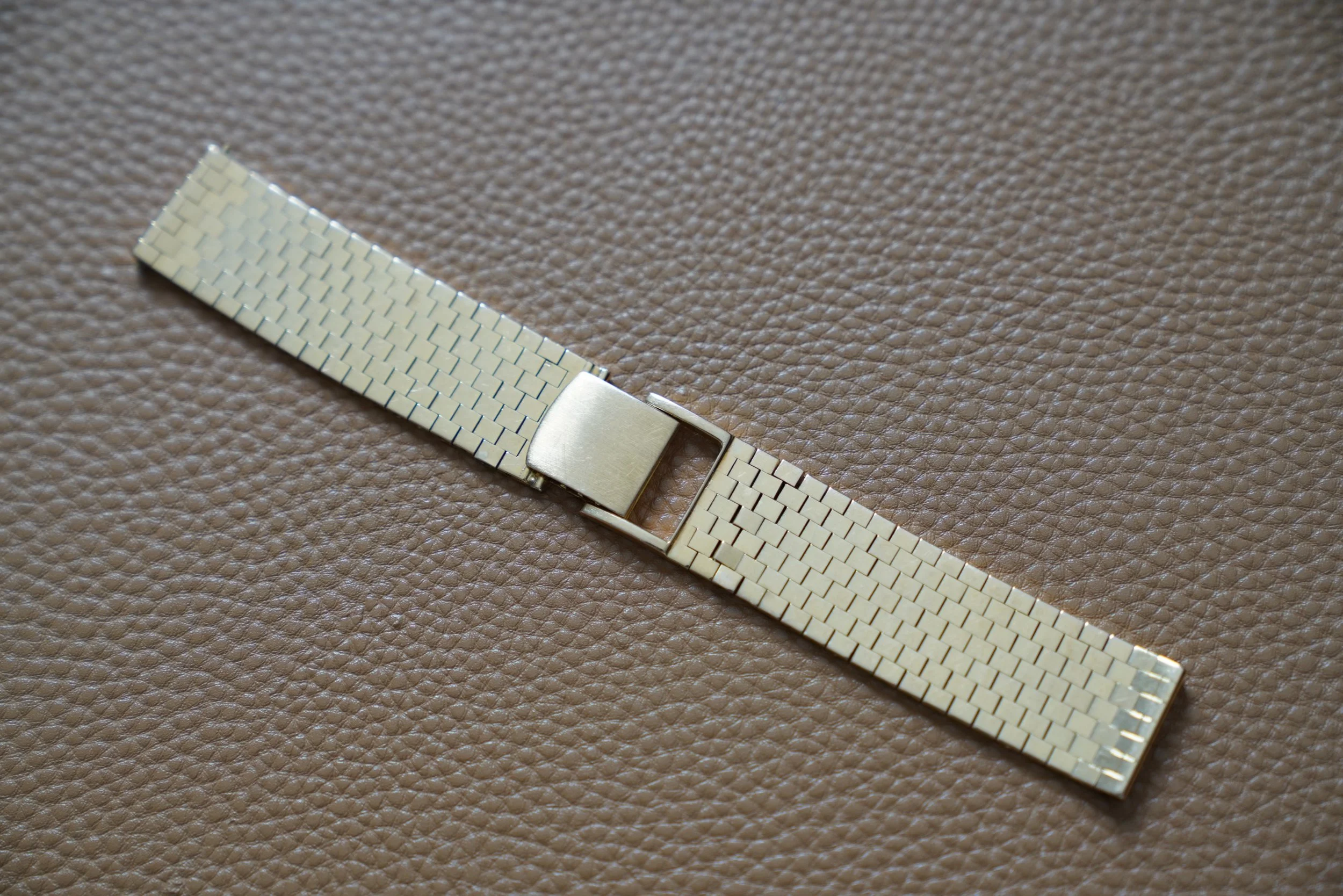 This rose gold bracelet is very sophisticated brick-style example made by Gay Frères. It features 18mm end links. The bracelet is able to fit flush when the buckle is closed closer in. It measures approximately 5.5 inches in length. It dates to the fourth quarter of 1962. The bracelet appears to be yellow in some of the photos, but the images of it in natural light and in person convey the rose gold color.