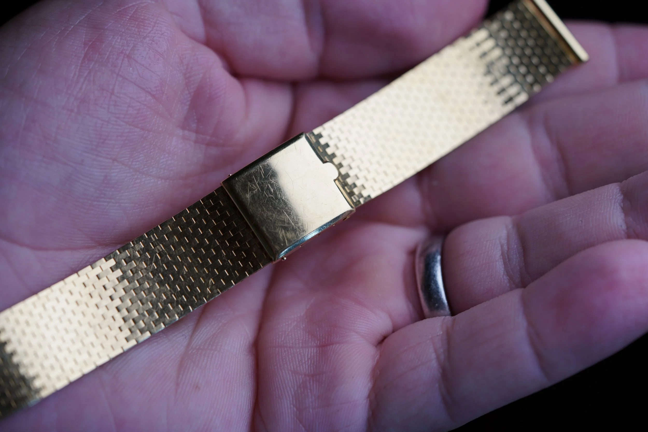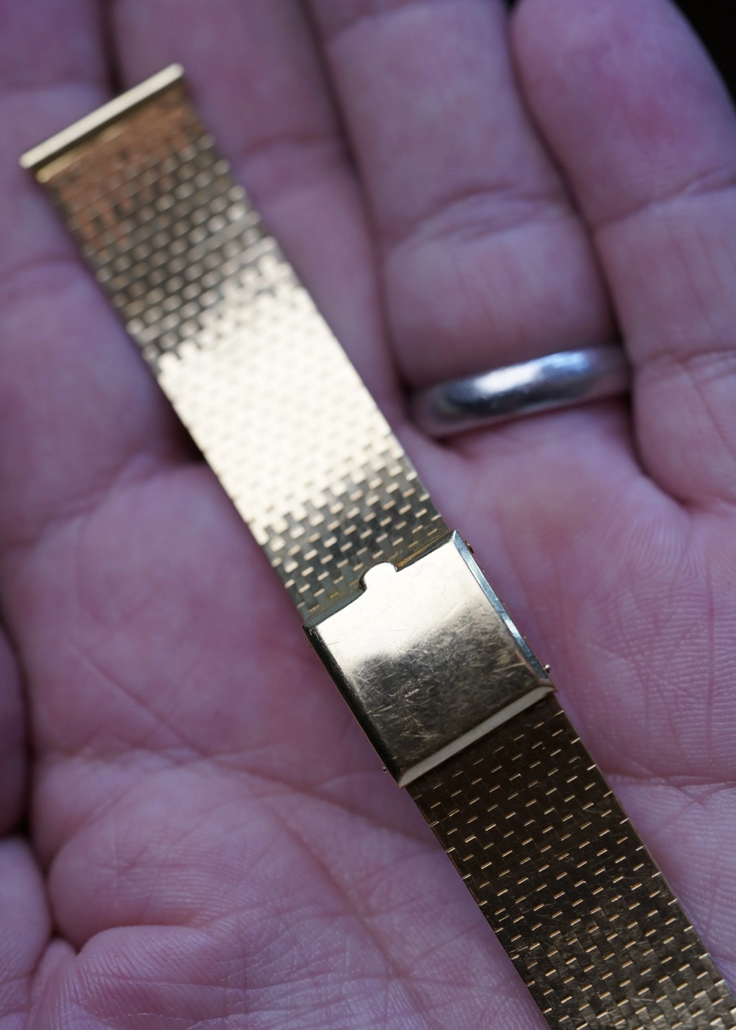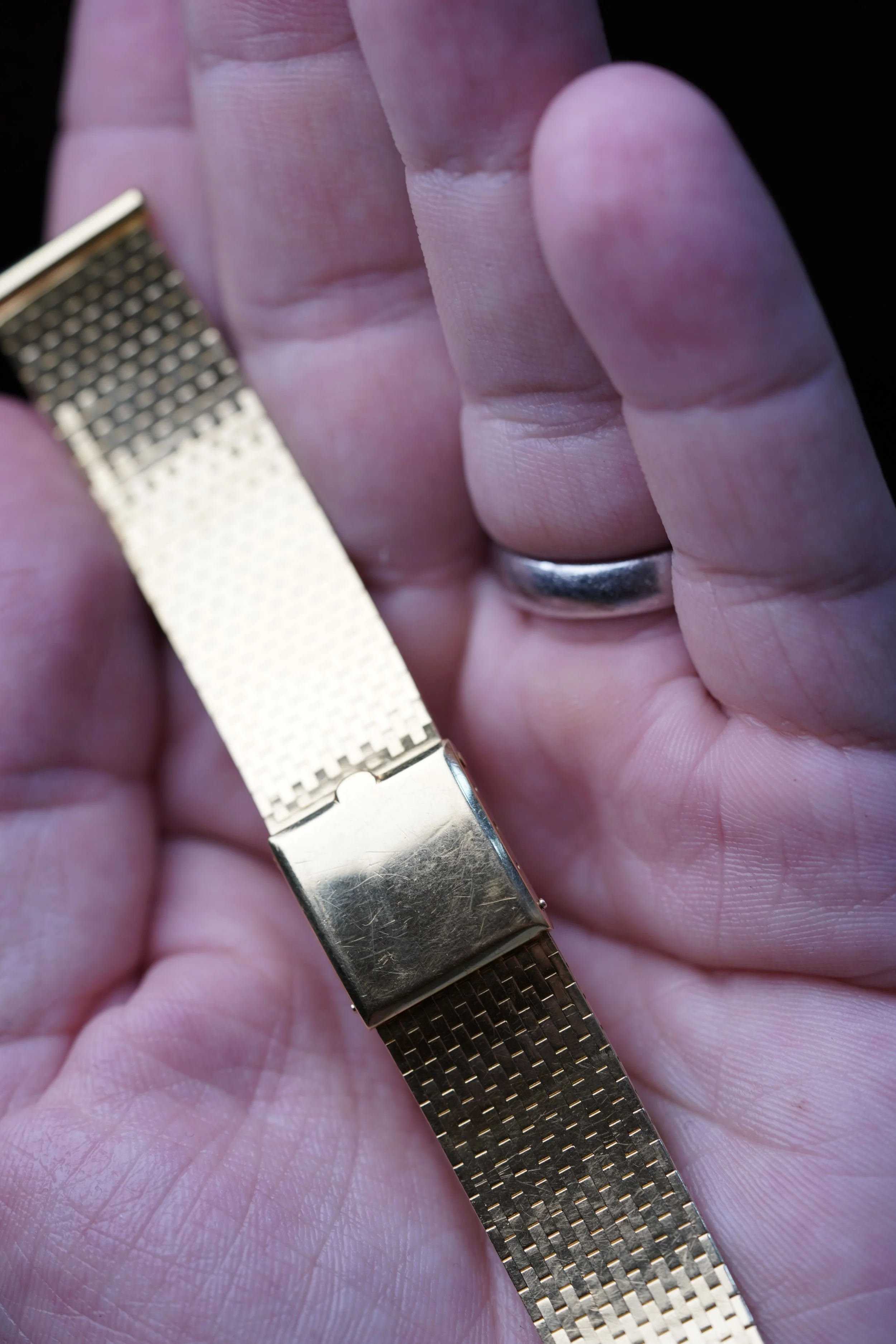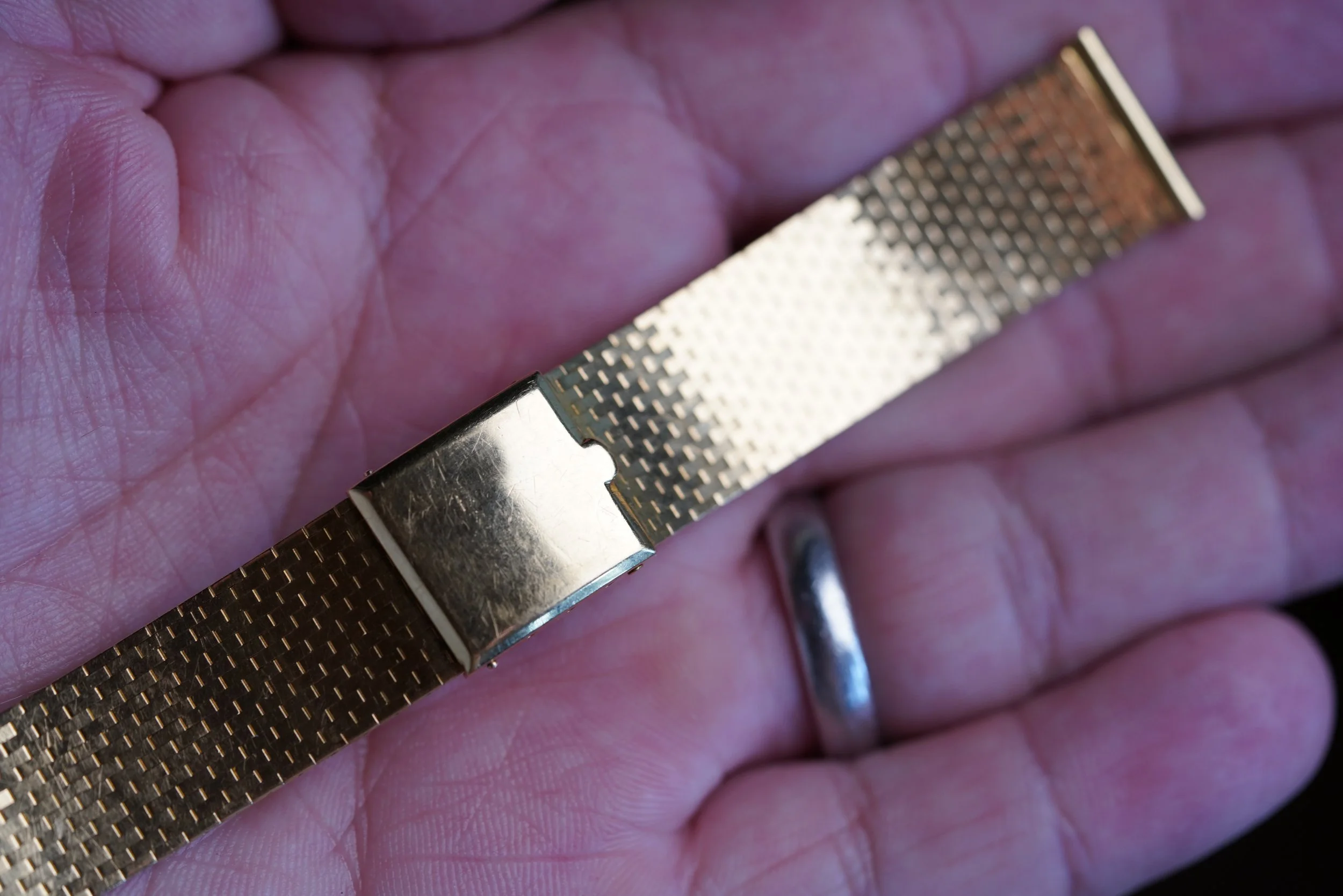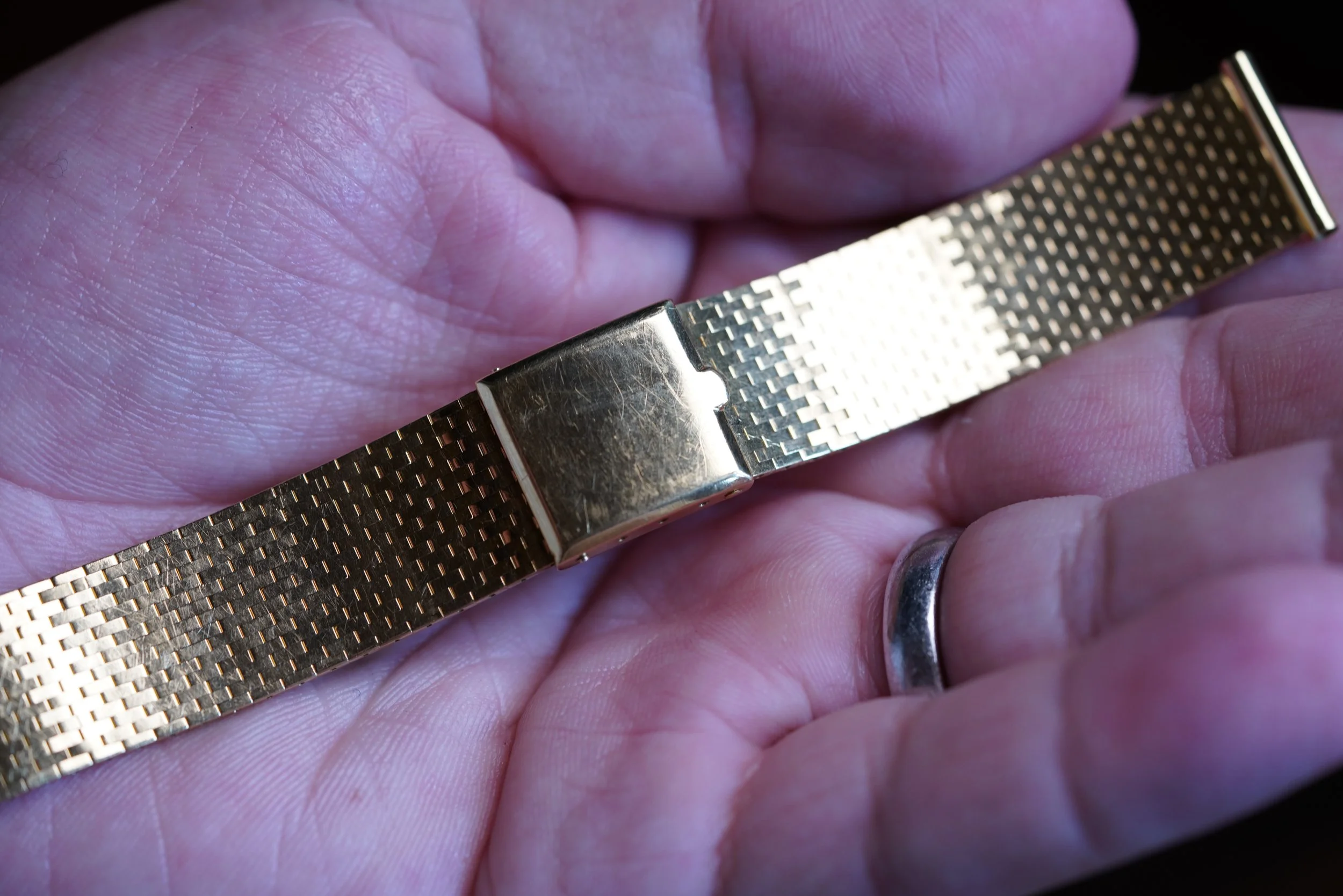This is an incredible 18K yellow gold brick bracelet made by C+B. The bracelet dates to the 1960s and these were sold on timepieces at Cartier and Tiffany & Co. New York. It measures approximately 6 inches. It would look incredible on a Patek Philippe Reference 3940 or gold dress model. It weighs 46 grams.