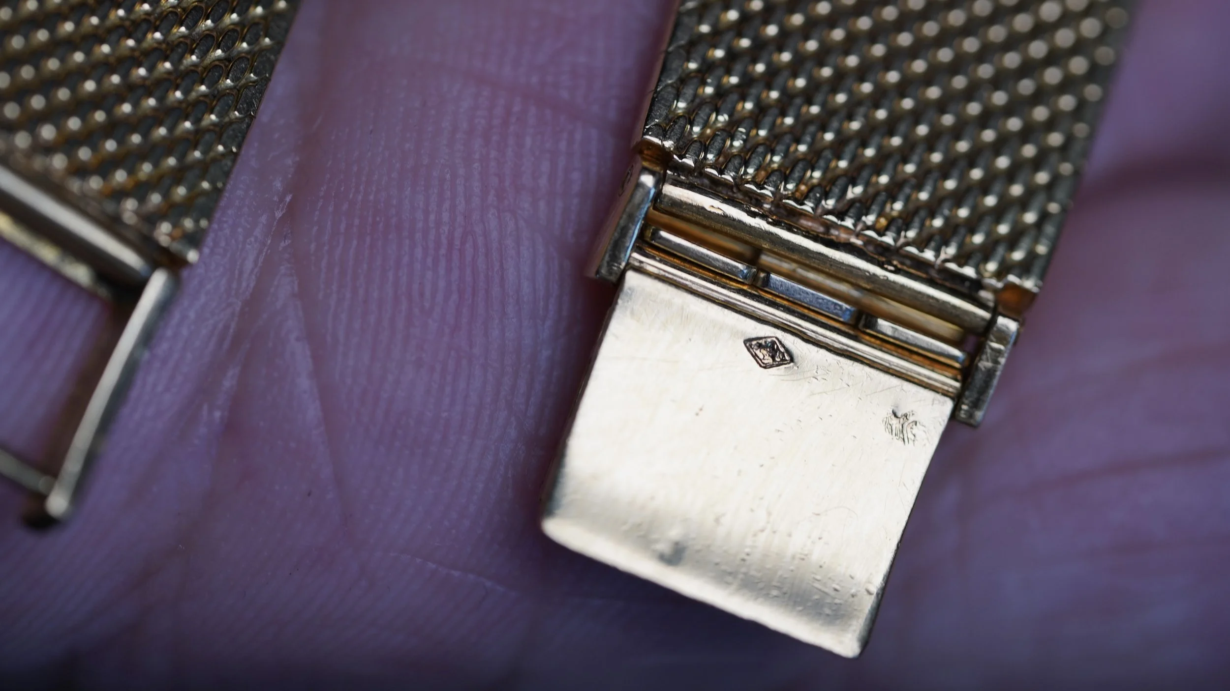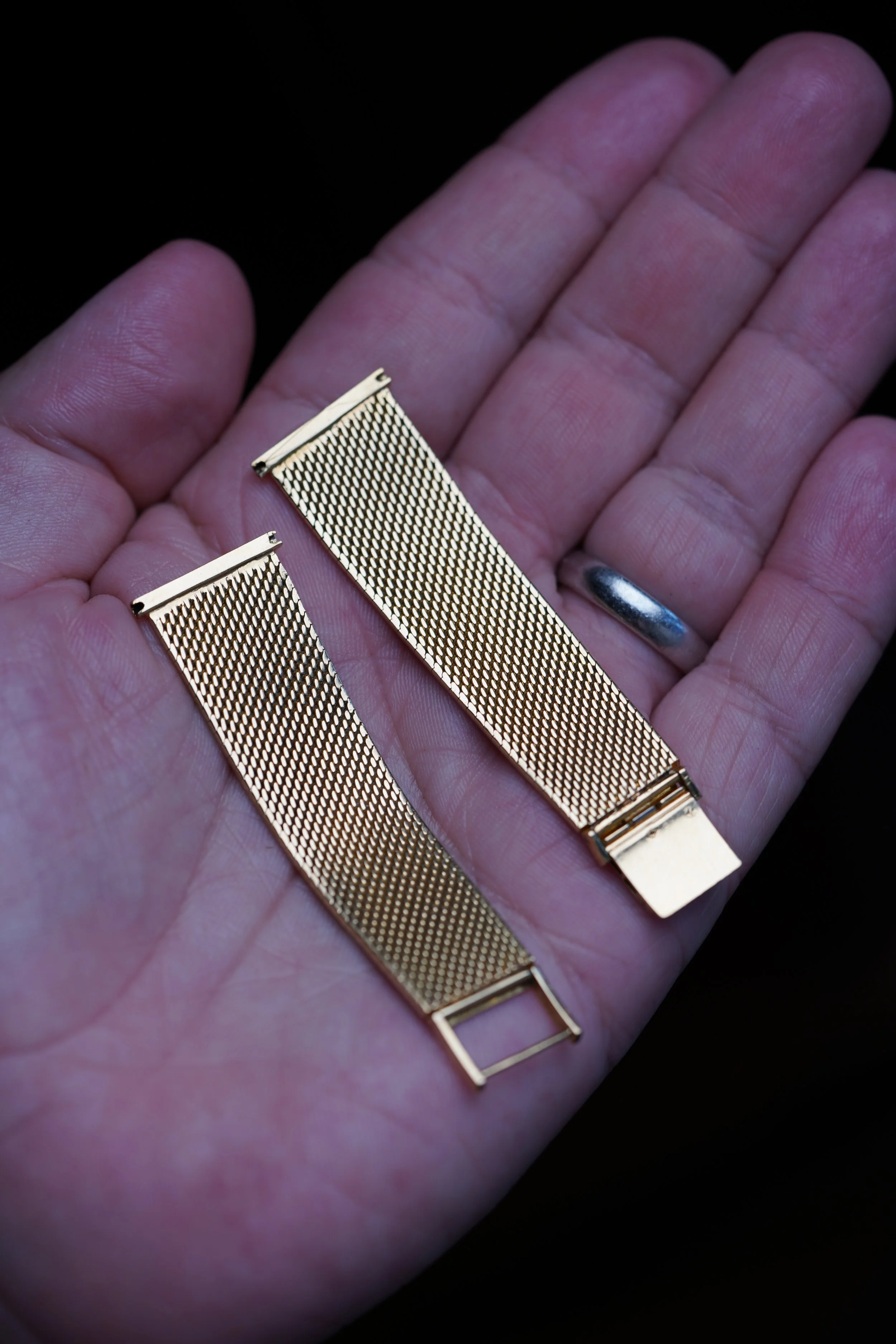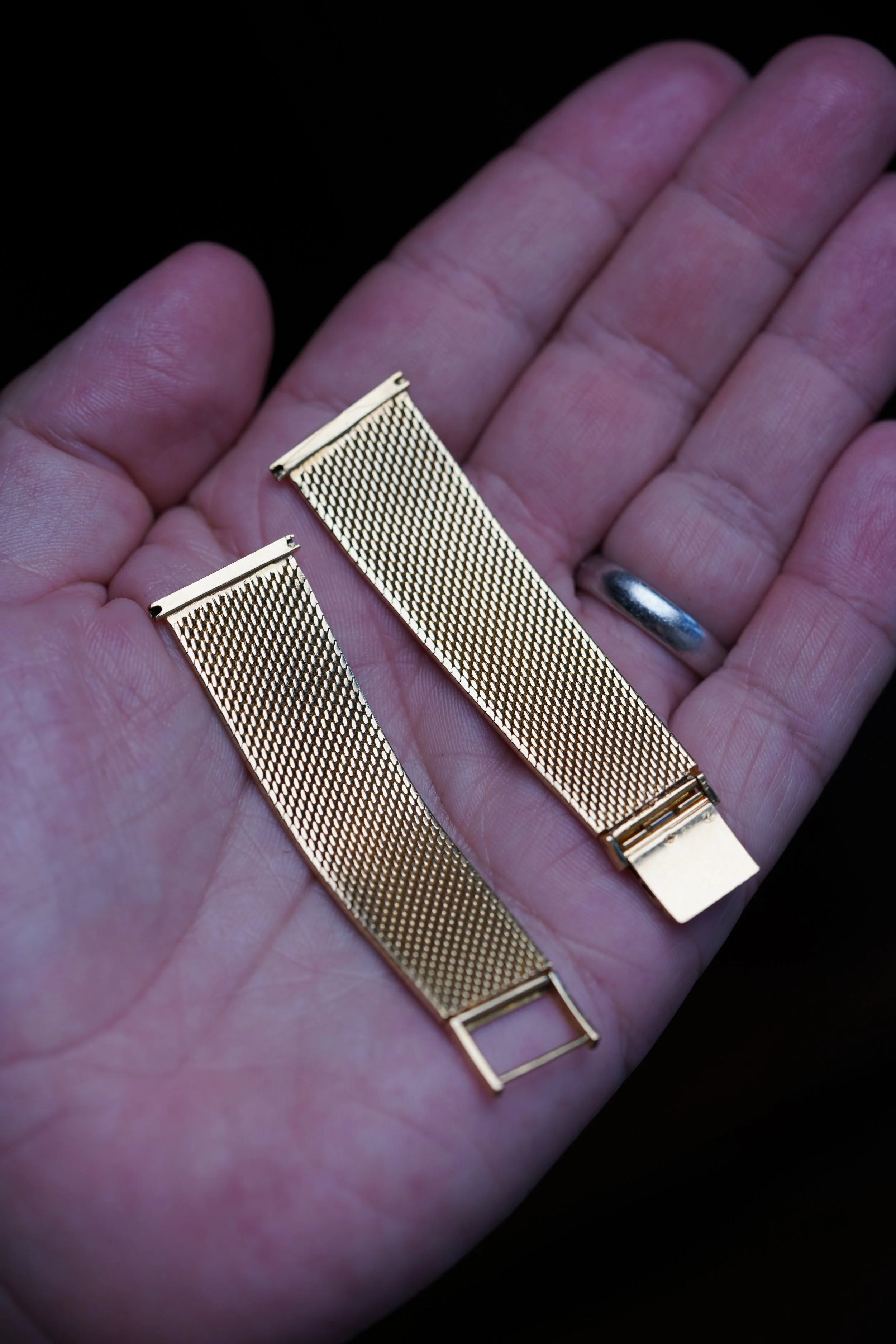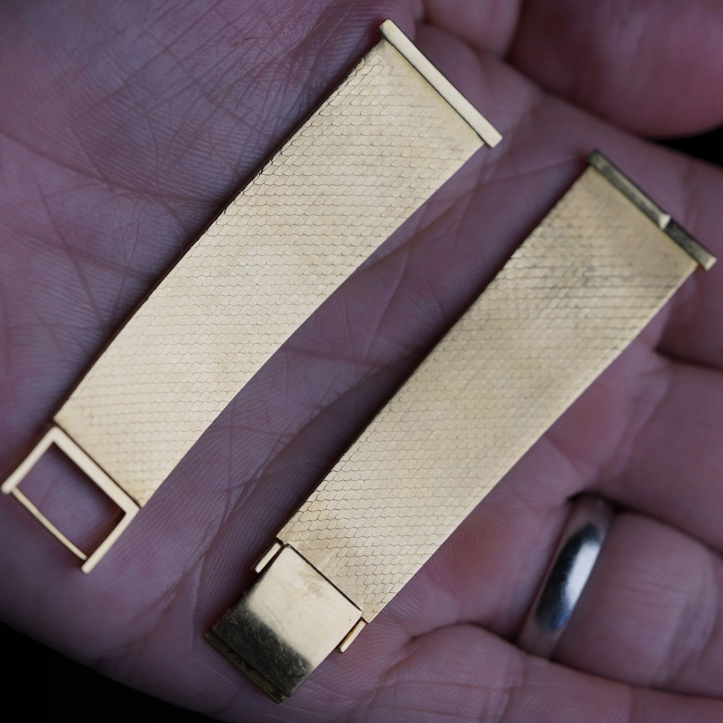 This 18K yellow gold bracelet is a spectacular and very rare bracelet. It was produced by Gay Frères The links a woven mesh milanese “snakeskin” design. The straight end links are approximately 20.5mm and it measures approximately 5.75 inches in length on the longer setting. This would look incredibly on any yellow gold Patek Philippe or mid century timepiece.