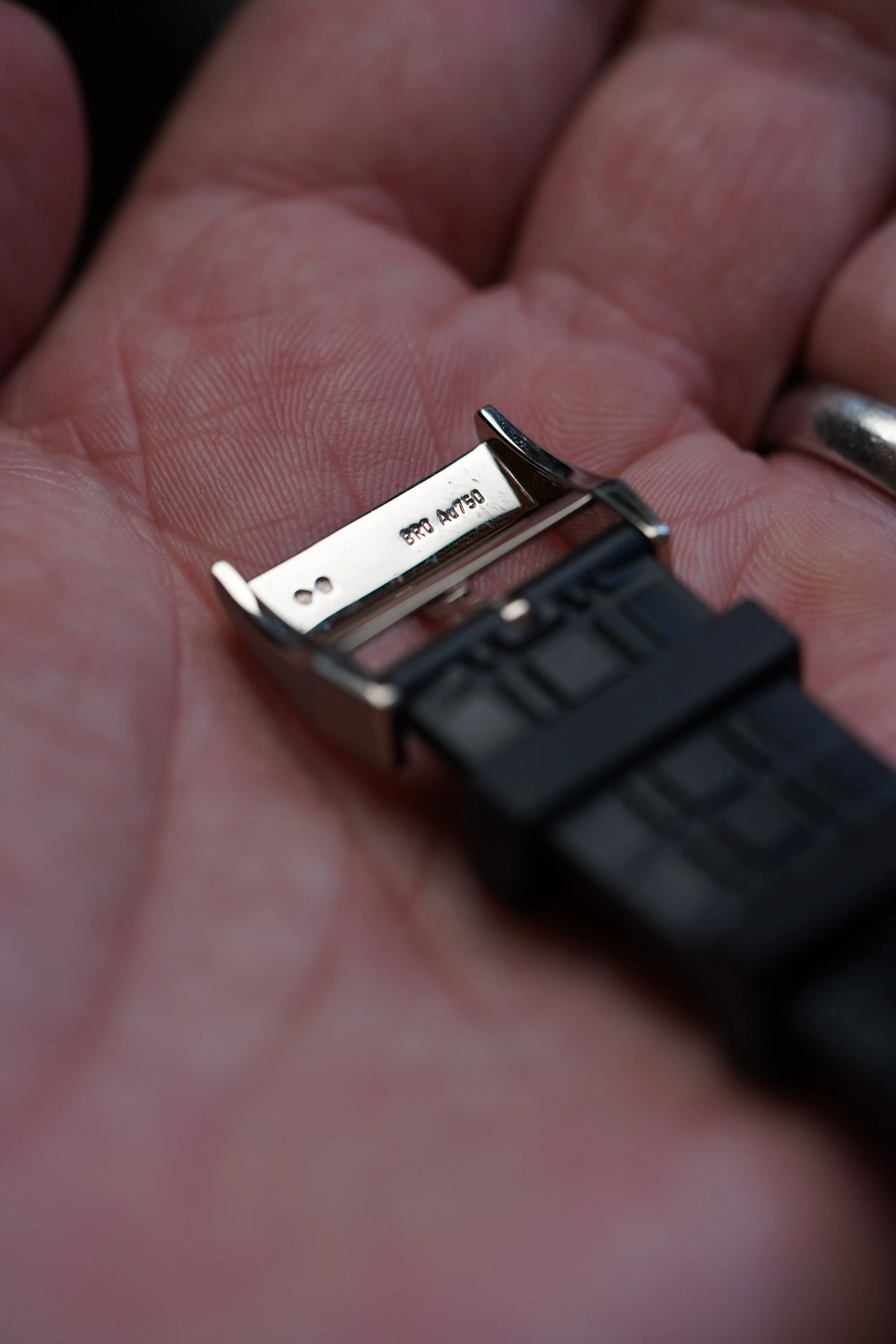 It is paired on an ALS rubber strap with white gold buckle. We do not know the production date, as the papers do not show this information. It was sold pre 2023.