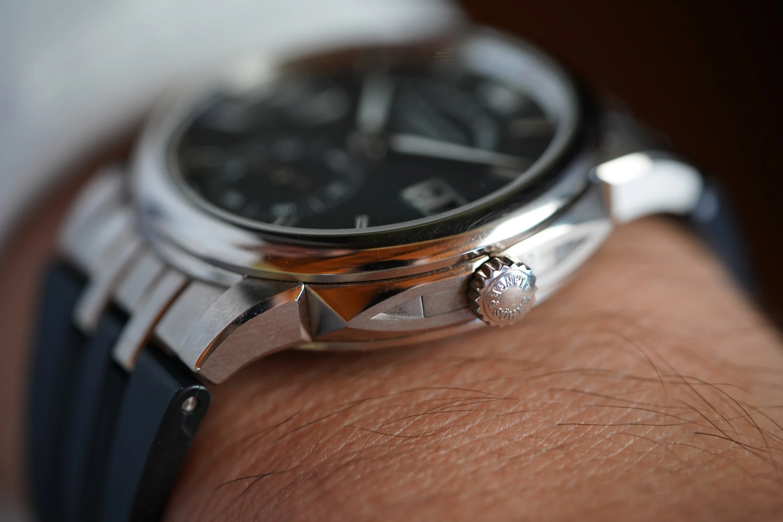 The case style was a very forward thinking design by Lange at the time of release. It is made of 18K white gold. The white gold case appears to be unpolished and measures 40.5mm in diameter and 11.1mm in height. It is powered by the calibre L155.1 with a 50 hour power reserve.