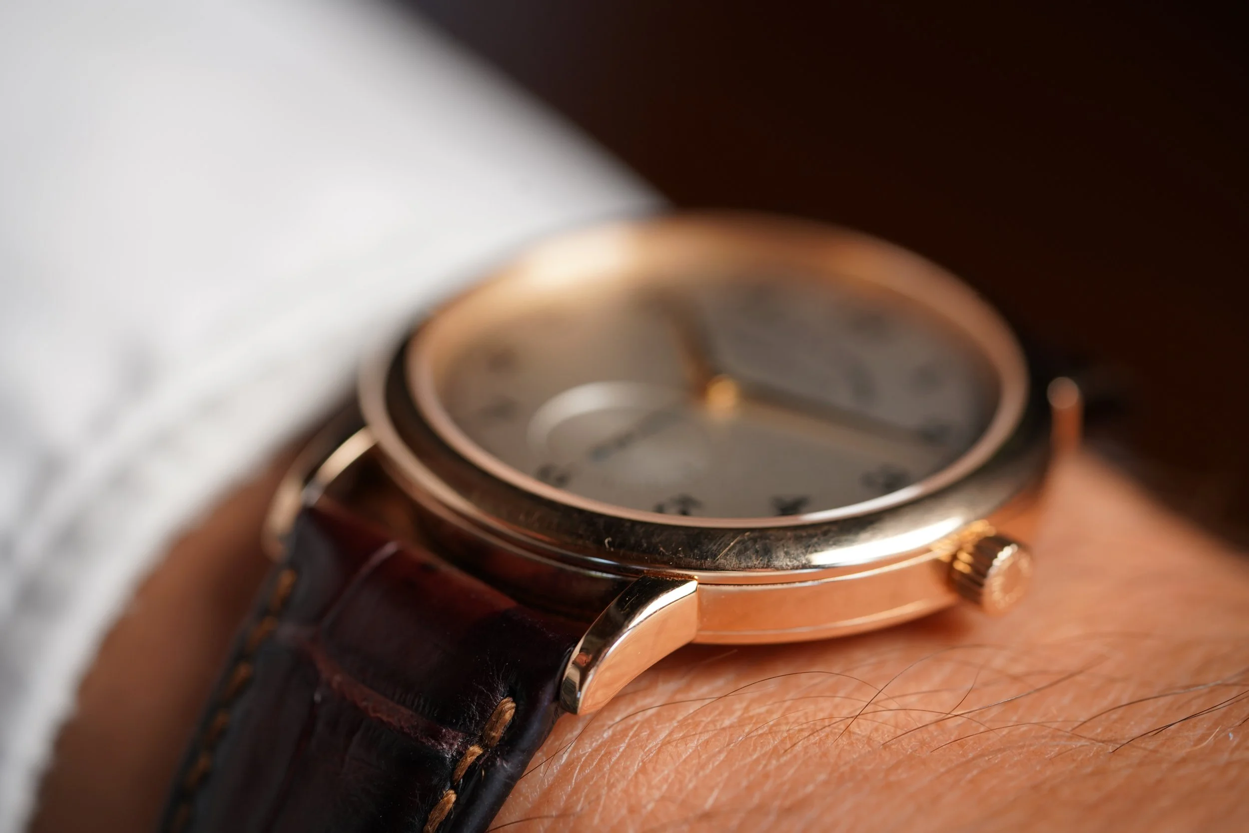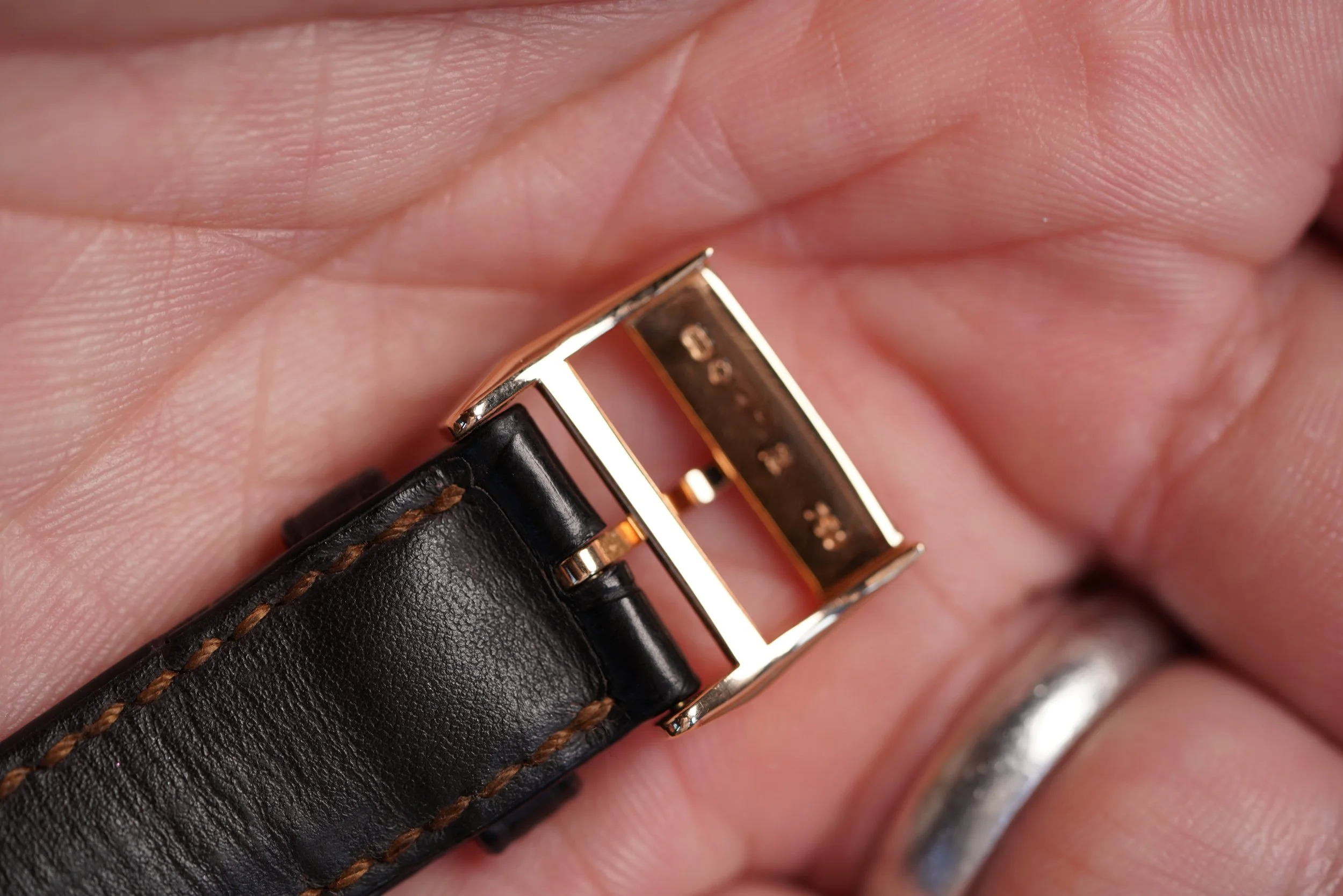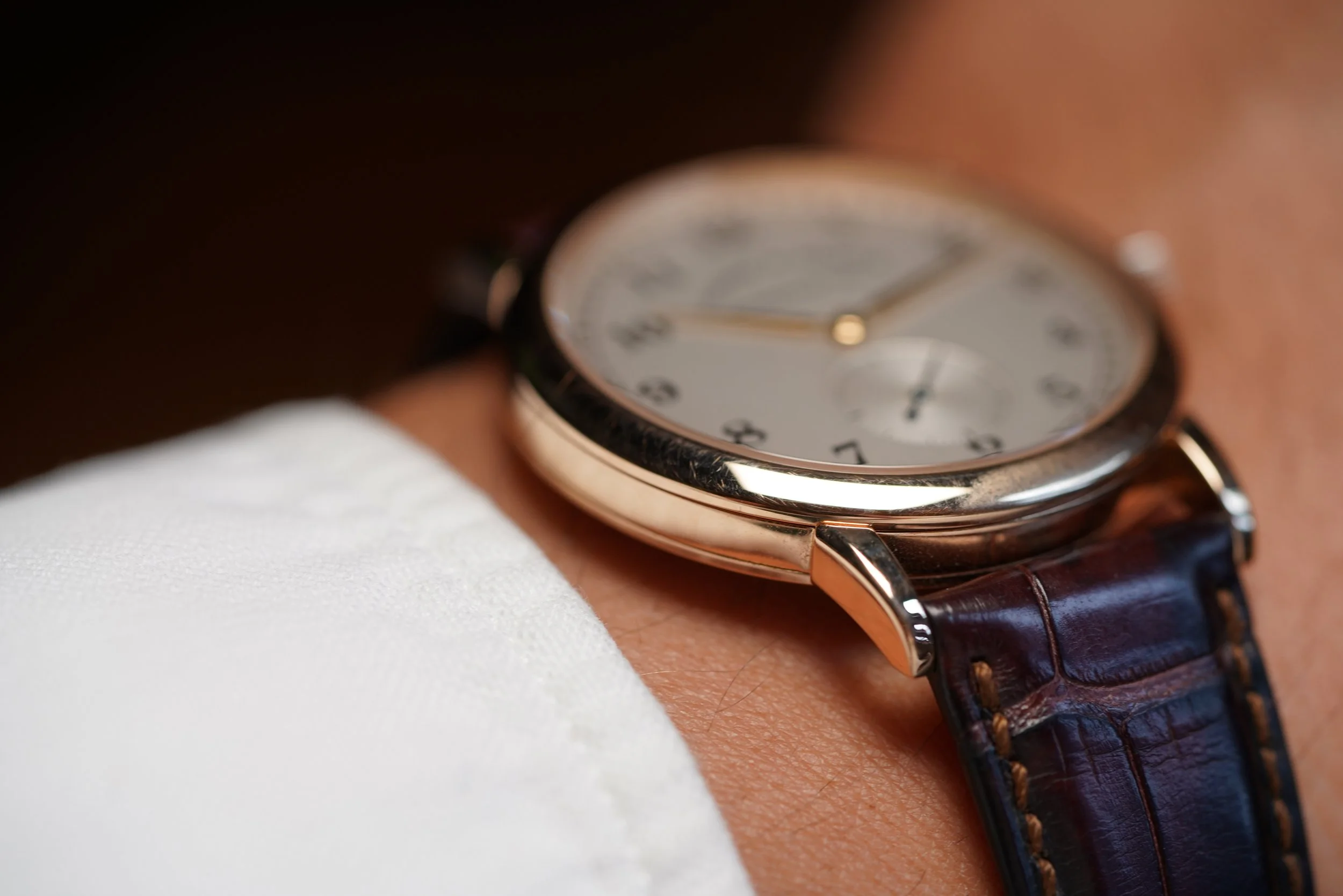 This A. Lange & Söhne Saxonia 1815 reference 206.032 is a great contemporary dress watch from the leading German watch manufacturers. The rose gold case has been lightly polished and measures 35.9mm in diameter. The watch is very slim, with a height of 7.5mm. It comes on the original strap and rose buckle.