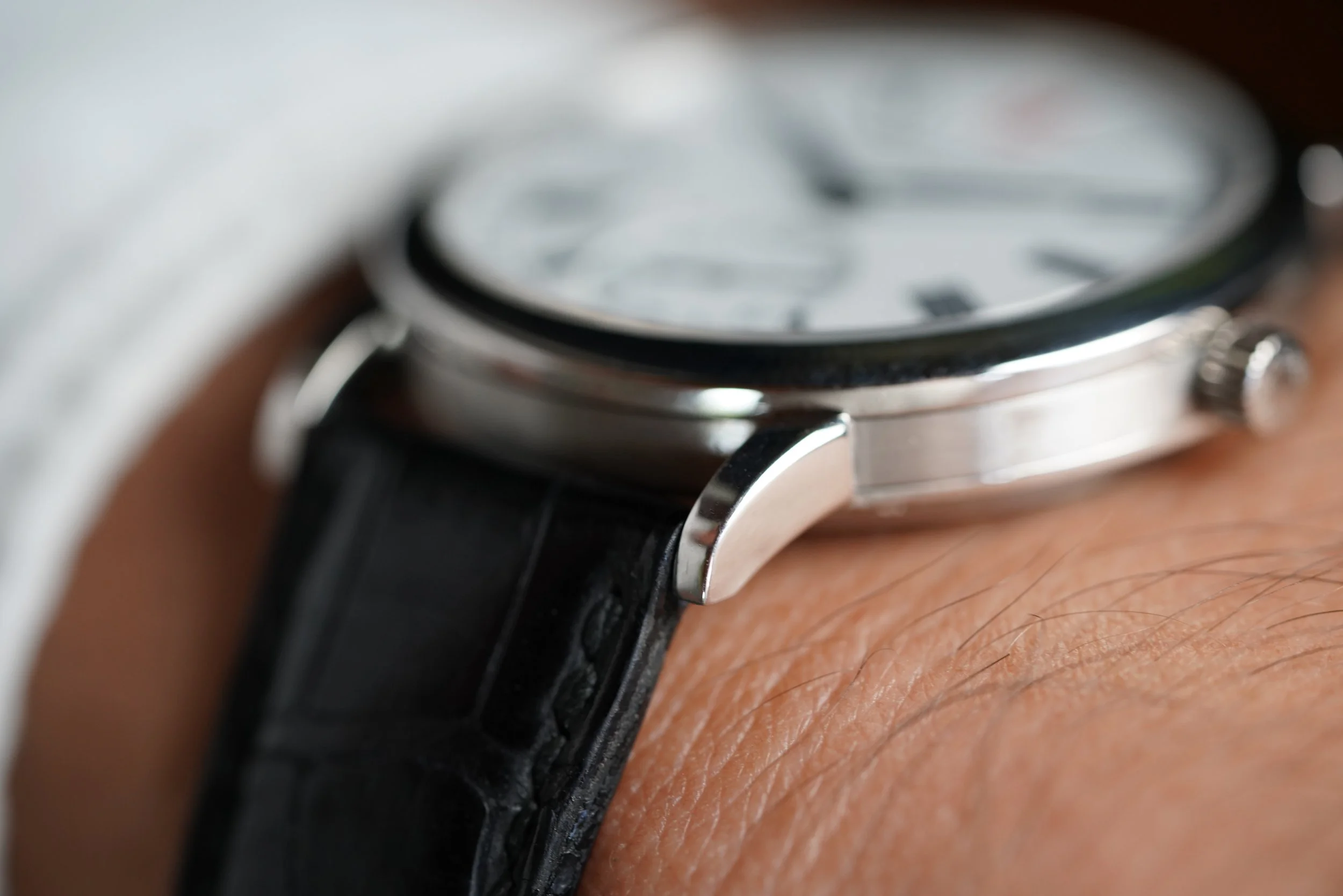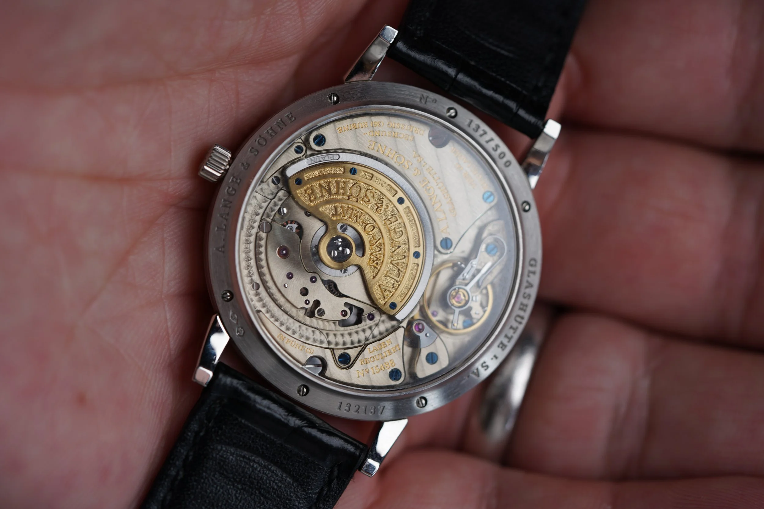 This A. Lange & Söhne Saxonia Jubiläums Langematik-Reference 302.025 is a stunning time only watch. The case is made of platinum, and measures approximately 37mm in diameter, 44mm lug to lug and is 8.5mm thick. It features an exhibition caseback displaying the caliber L921.7 movement. The watch was made in an anniversary series of 500 pieces.