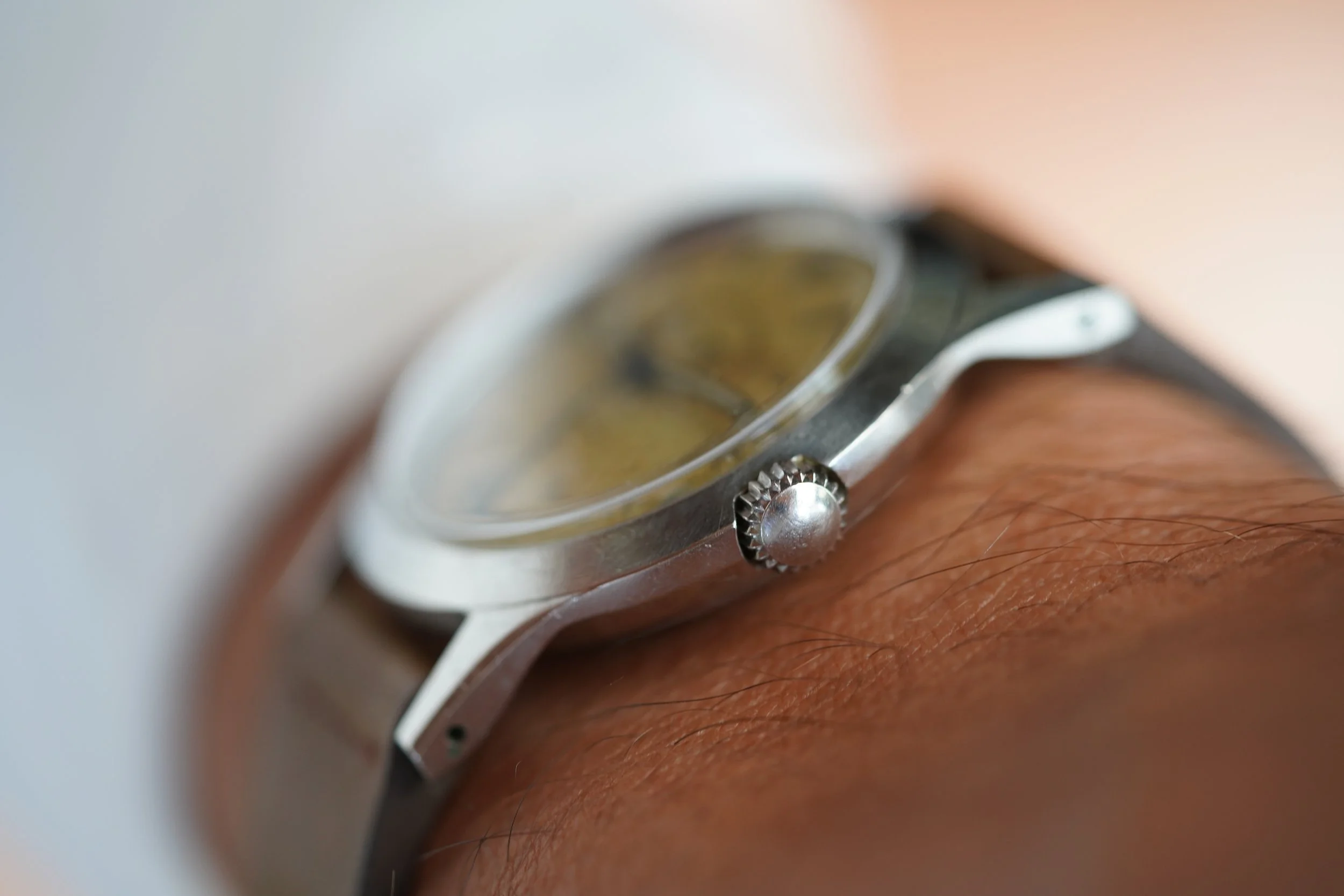 This Abercrombie & Fitch Auto-Mark Movado is a cool and highly interesting timepiece. The stainless steel case measures 35mm in diameter and approximately 43mm lug-to-lug. The features include radium luminous material and a warm-toned patina color. The case is unpolished.