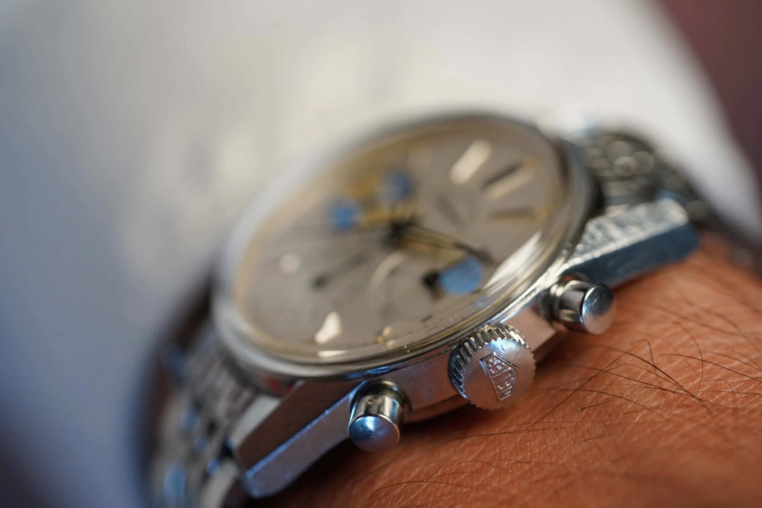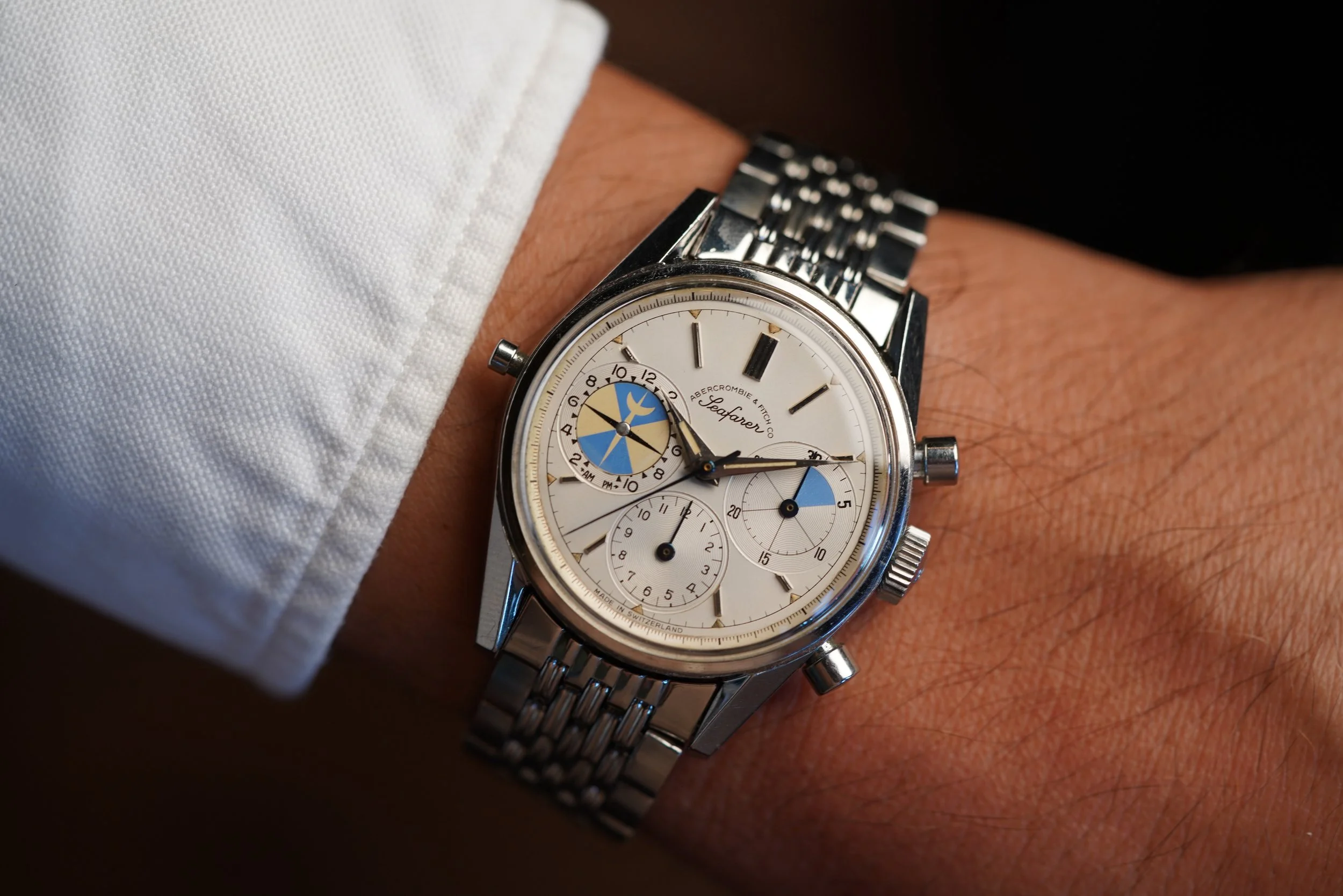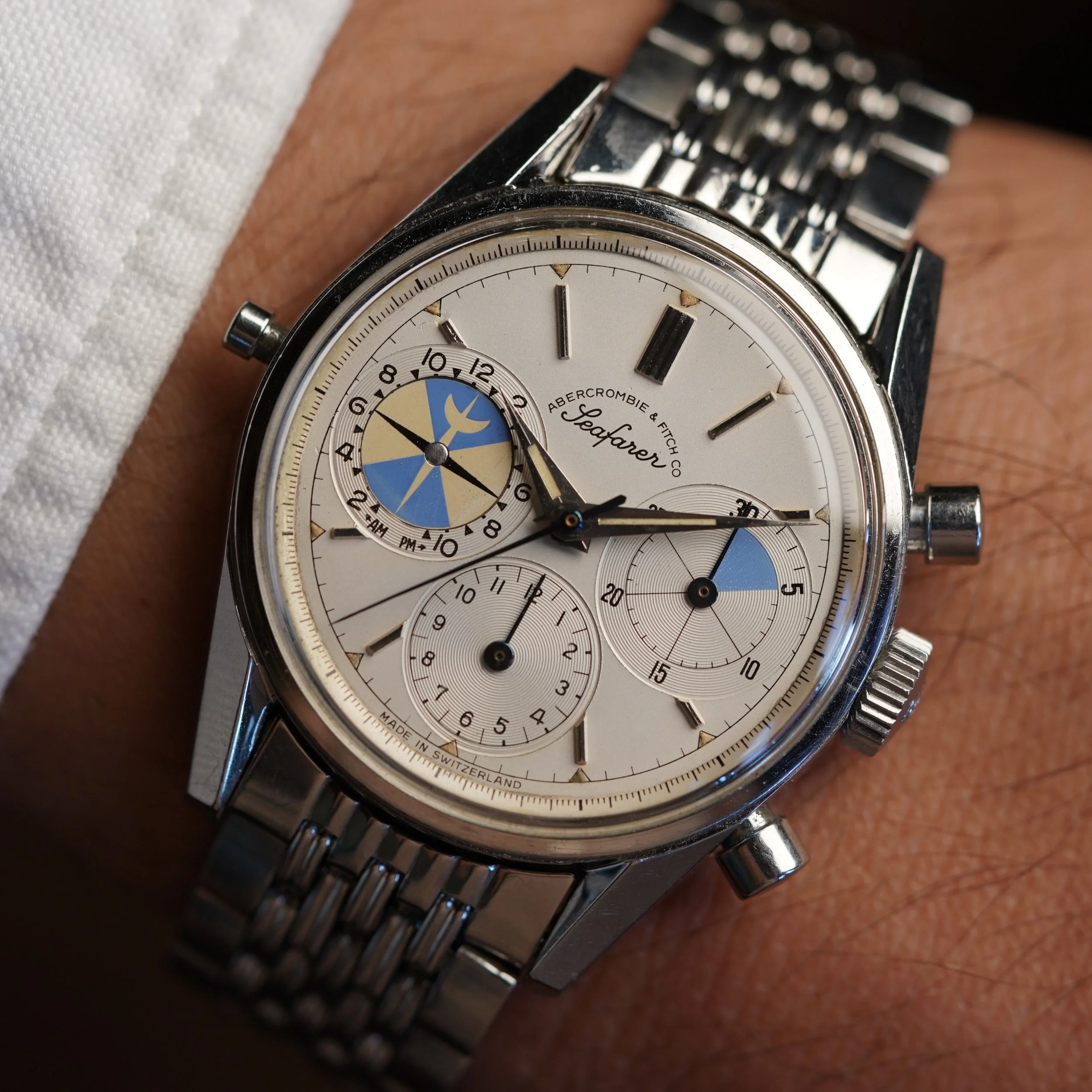 I’m thrilled to offer exceptional vintage watches that I personally would love to own. This Abercrombie & Fitch reference 2447SF is just out of this world. These watches are extremely rare, and only around 20 are known. It is a very early example dating to circa 1965 with a non T dial. It is paired on a later Gay Frères bracelet for Heuer which looks brilliant. The case is unpolished and in incredible condition.