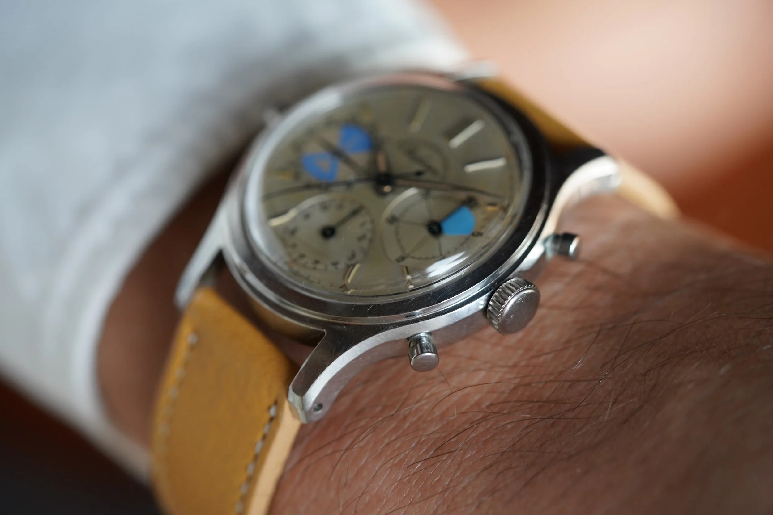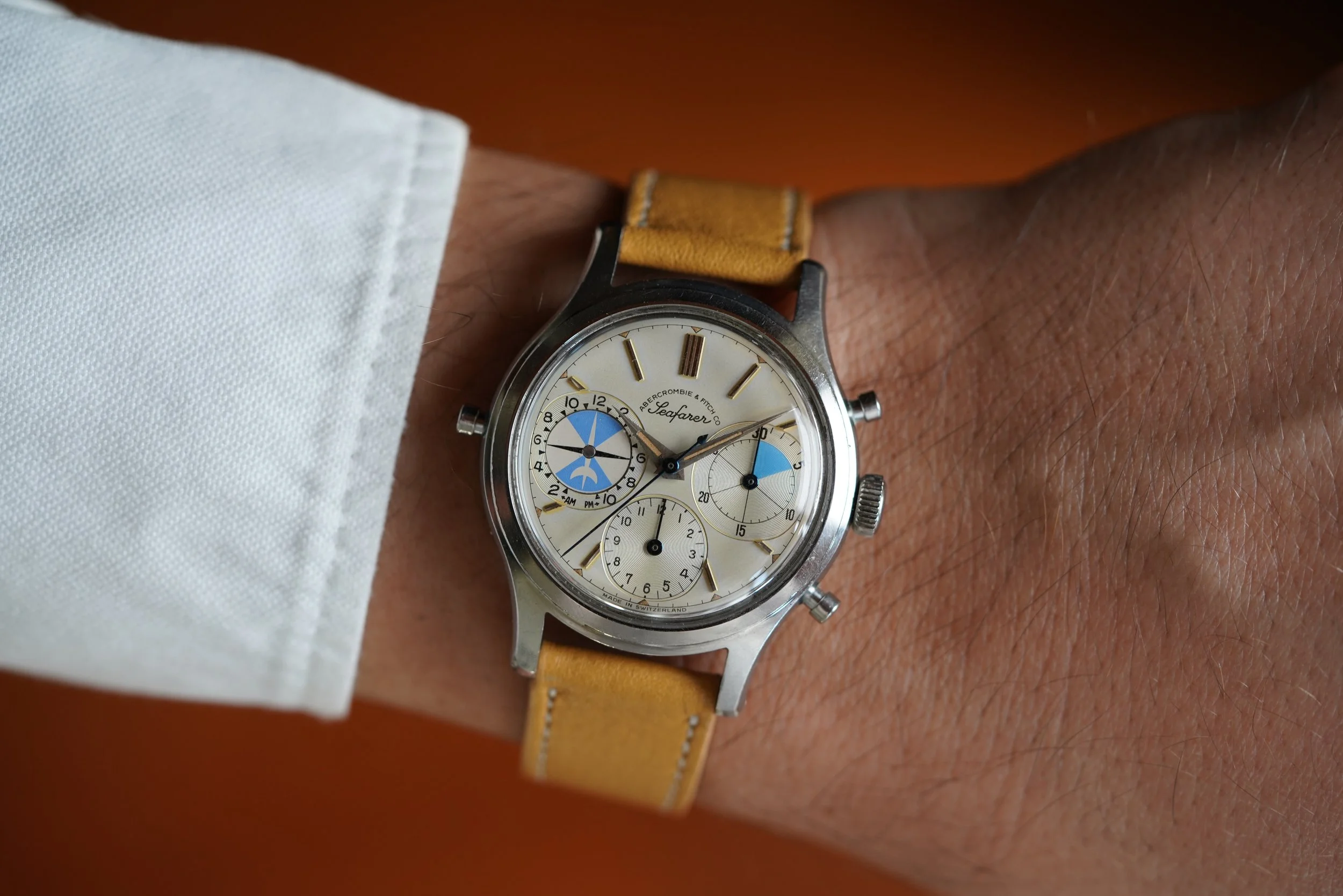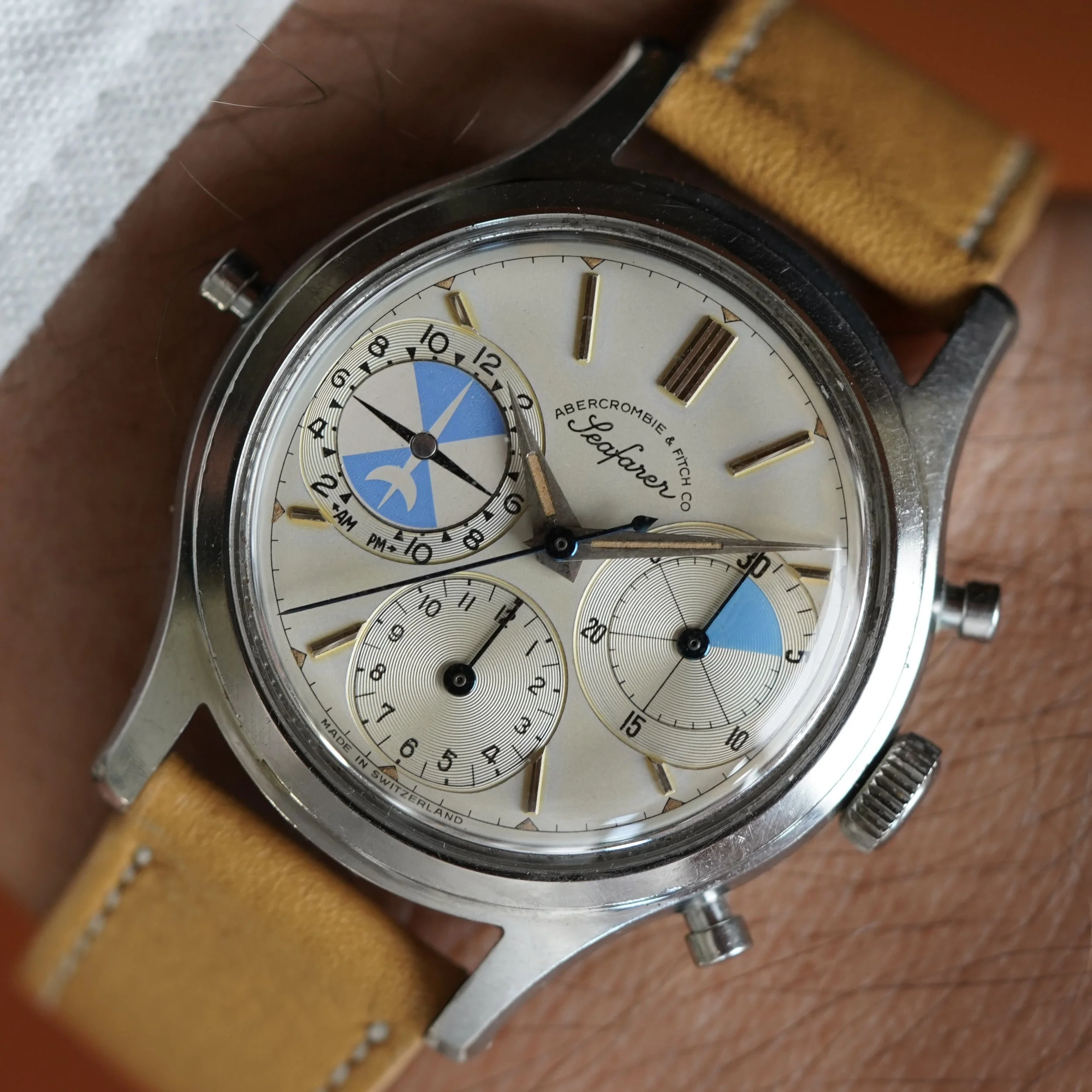 The Abercrombie & Fitch Seafarer is essentially the same watch as the Heuer Mareographe reference 2444 but instead with the incredible retailer dial! This example features beautiful warm colored lume, with excellent blue accents in the registers. The minute register is designated for timing yacht races. The case appears to be unpolished. It measures approximately 35mm in diameter by 45mm lug to lug. The watch dates to the early 1960s.
