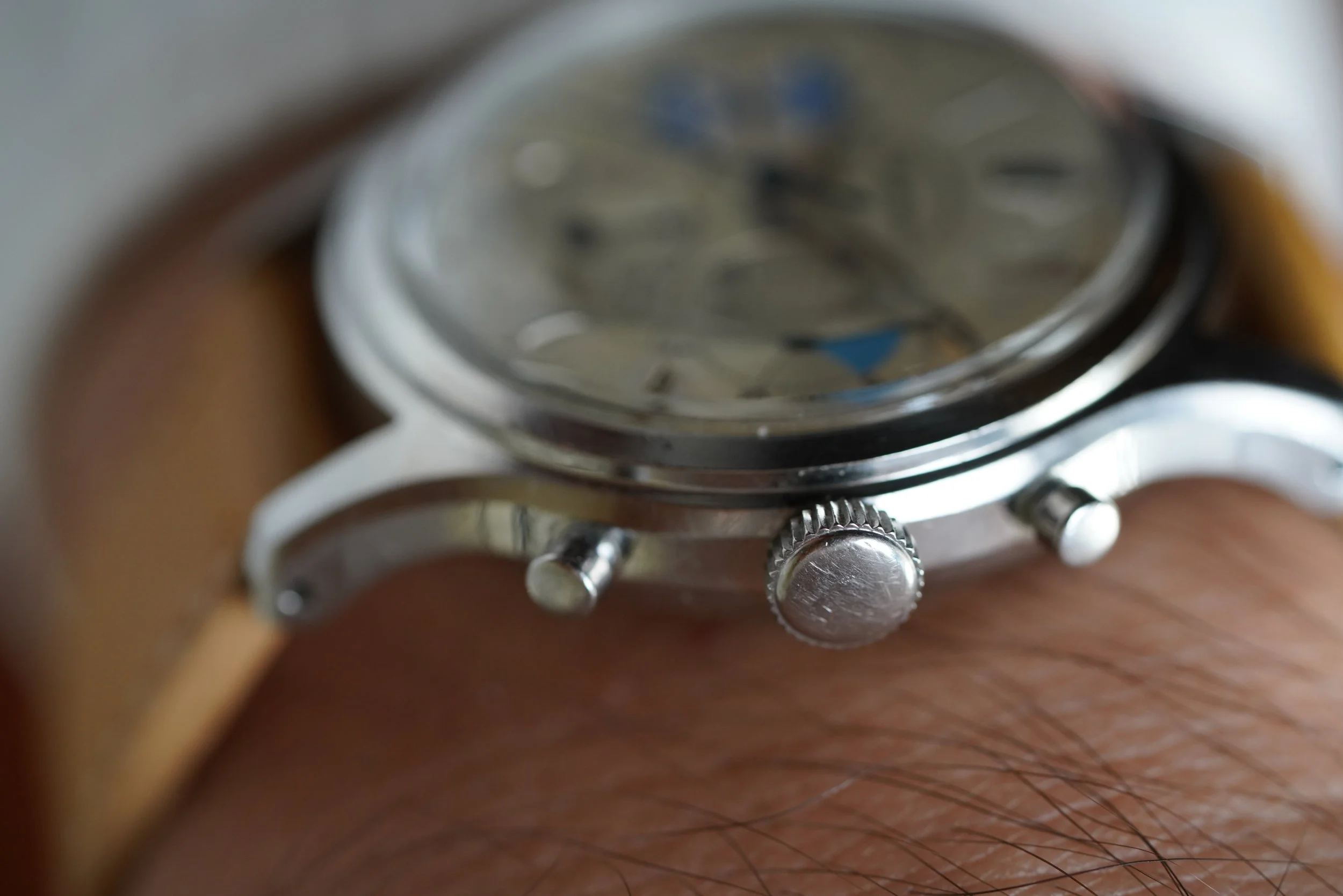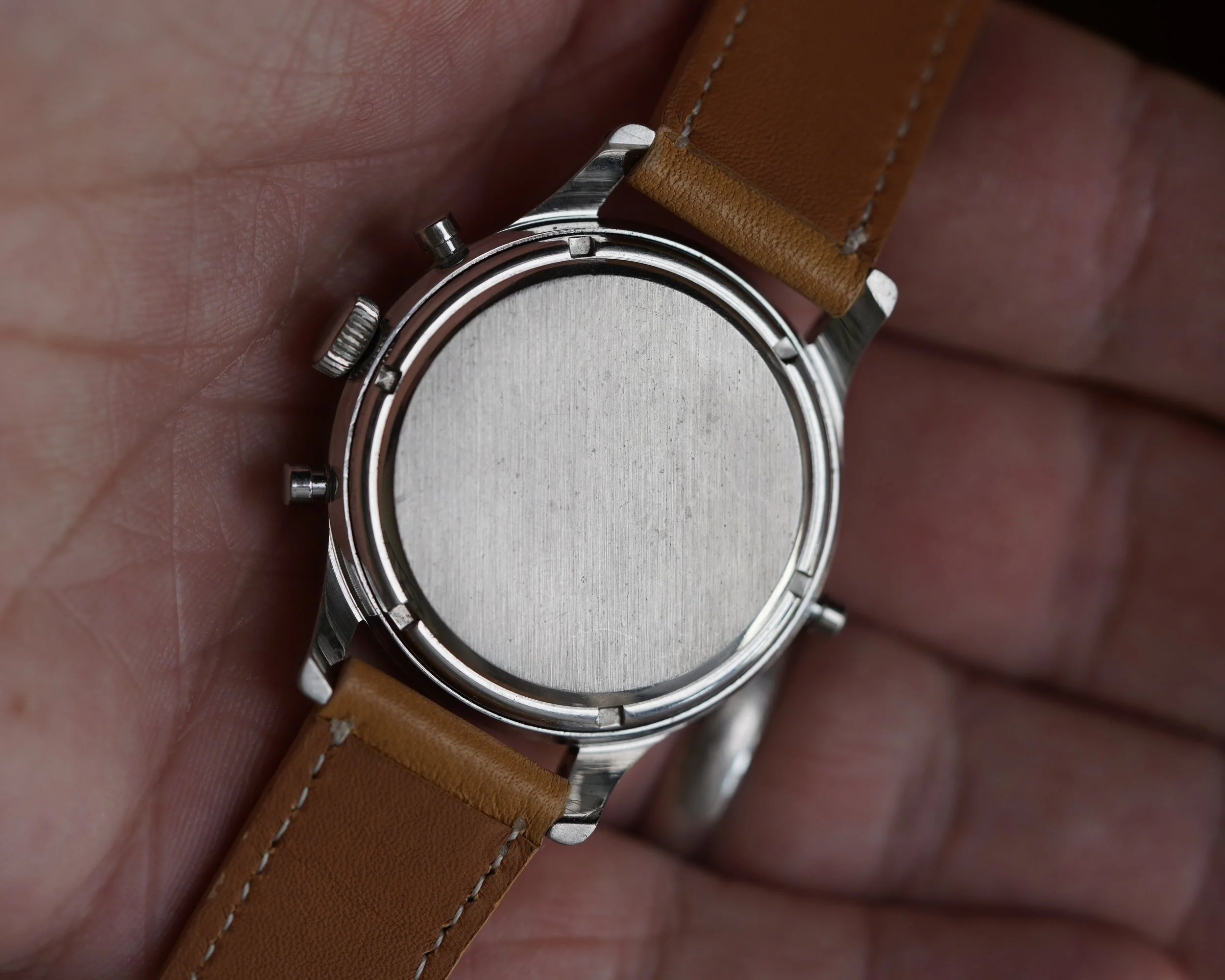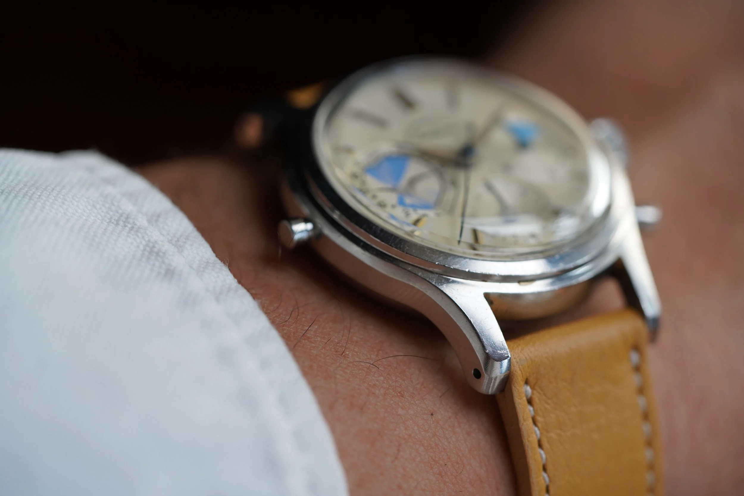 The Abercrombie & Fitch Seafarer is essentially the same watch as the Heuer Mareographe reference 2444 but instead with the incredible retailer dial! This example features beautiful warm colored lume, with excellent blue accents in the registers. The minute register is designated for timing yacht races. The case appears to be unpolished. It measures approximately 35mm in diameter by 45mm lug to lug. The watch dates to the early 1960s.