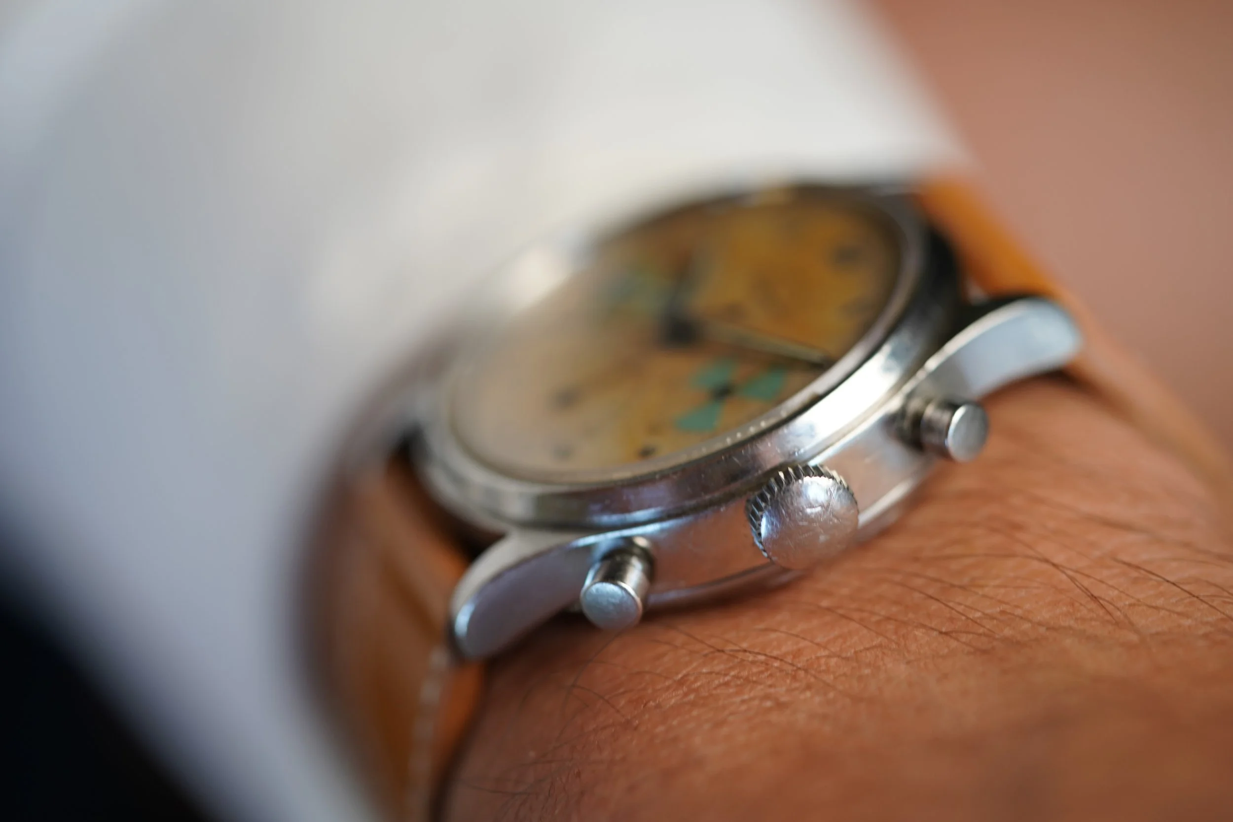 The watch features a Valjoux 71 movement which was modified to incorporate a tide complication. The case has been polished. It measures in at 37.5mm wide (44mm lug-to-lug). The lug width is 20mm and the height is 14.5mm (including the crystal).
