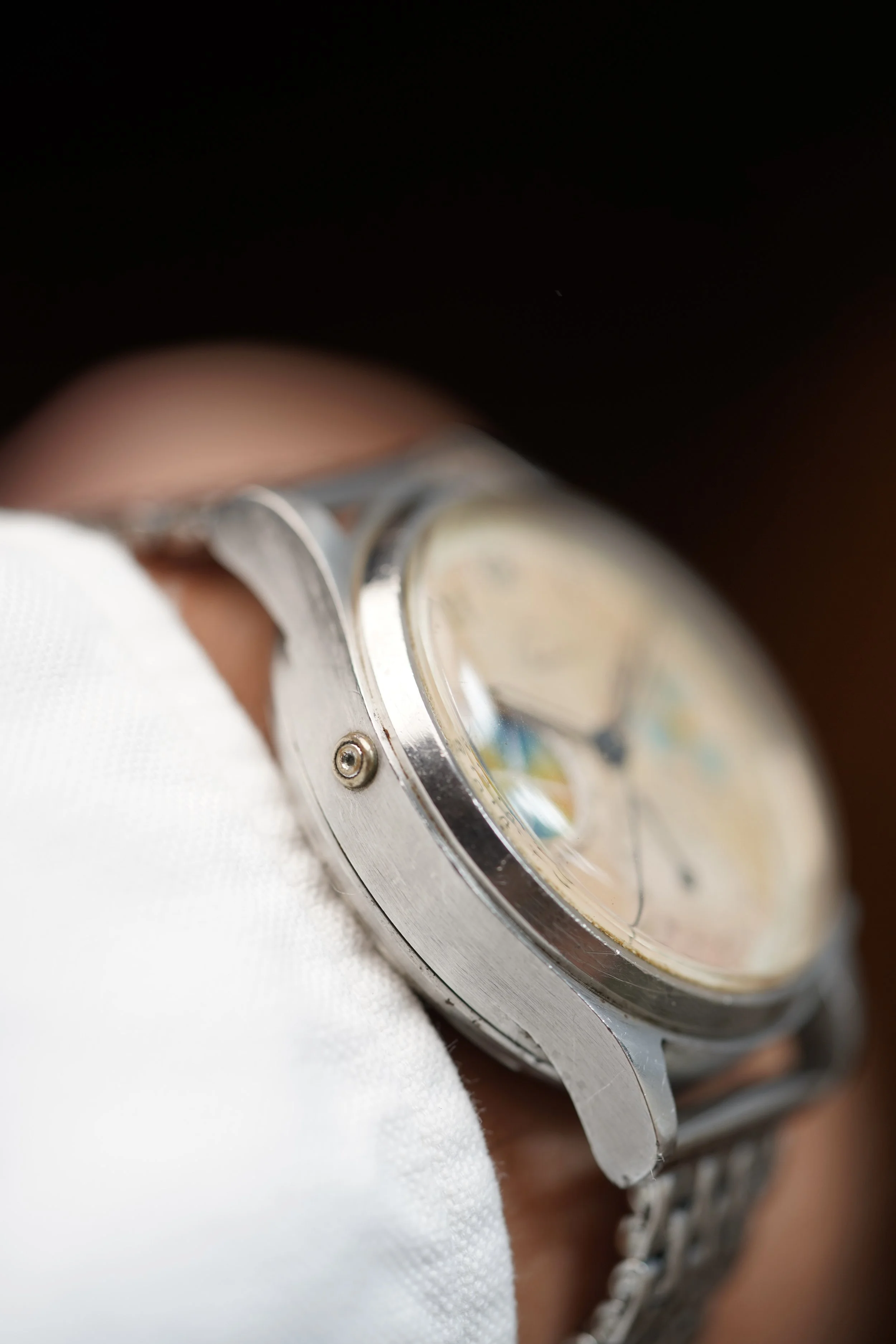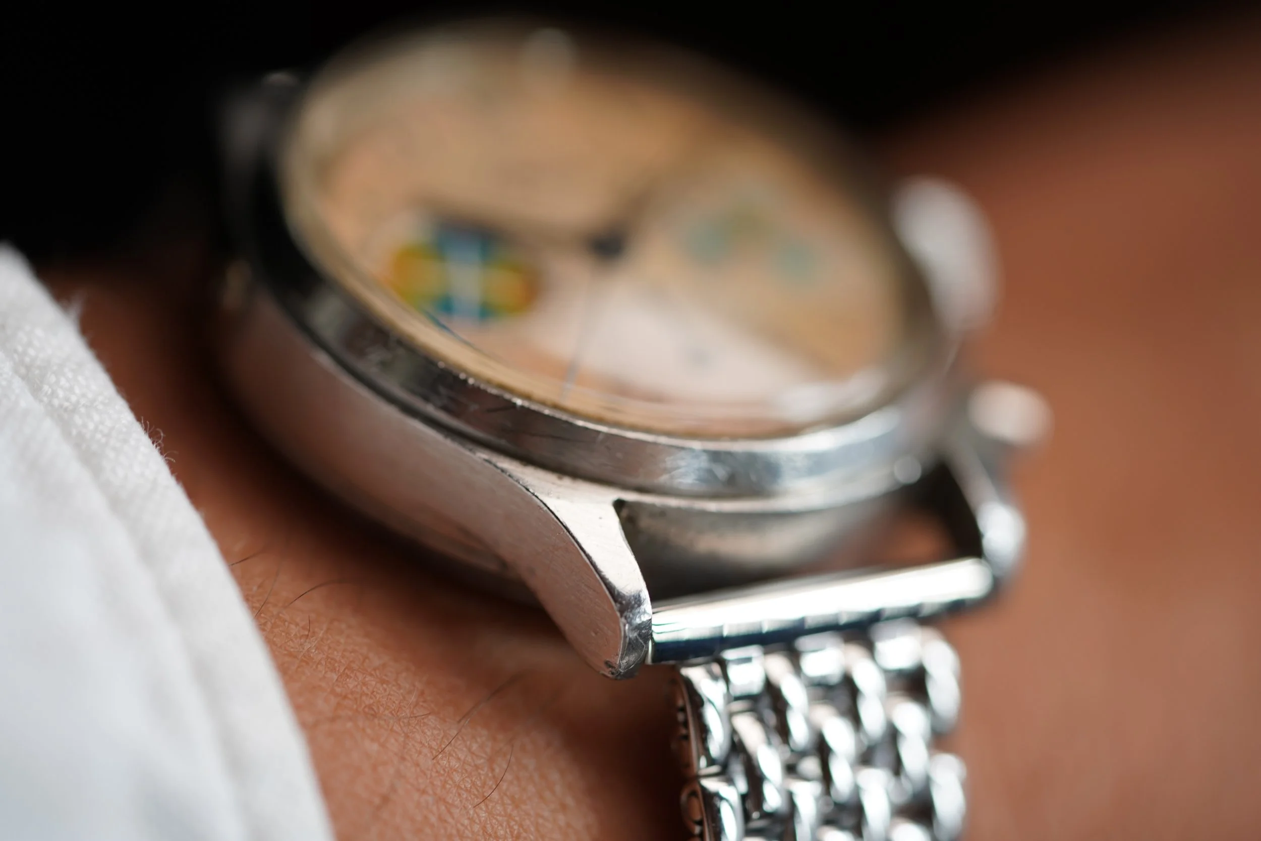 The watch features a Valjoux 71 movement which was modified to incorporate a tide complication. The case is unpolished. It measures in at 37.5mm wide (44mm lug-to-lug). The lug width is 20mm and the height is 14.5mm (including the crystal). The watch is paired on a contemporary beads of rice bracelet.
