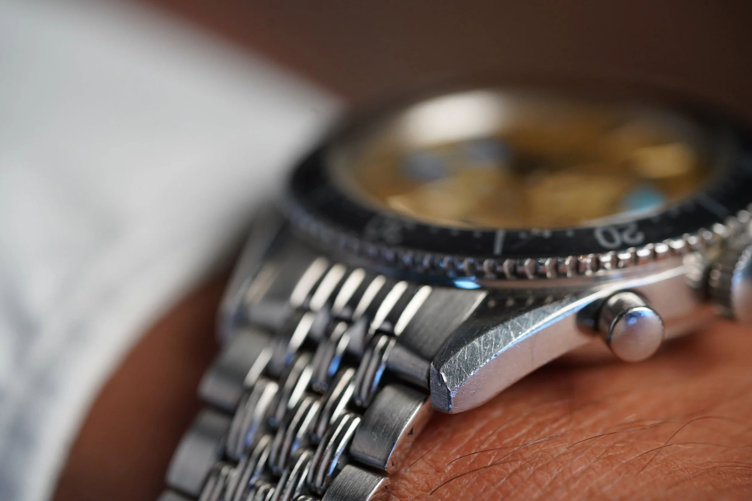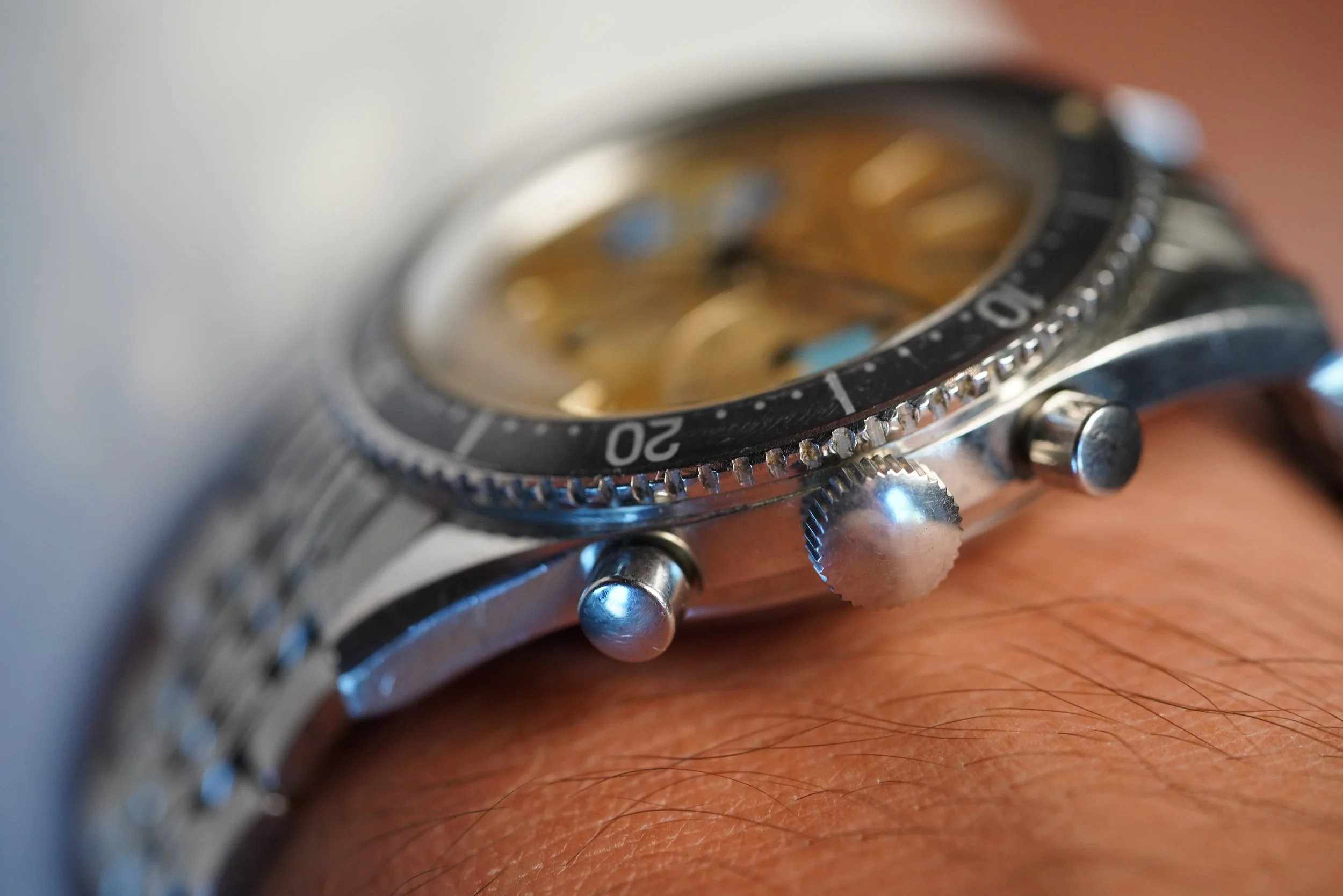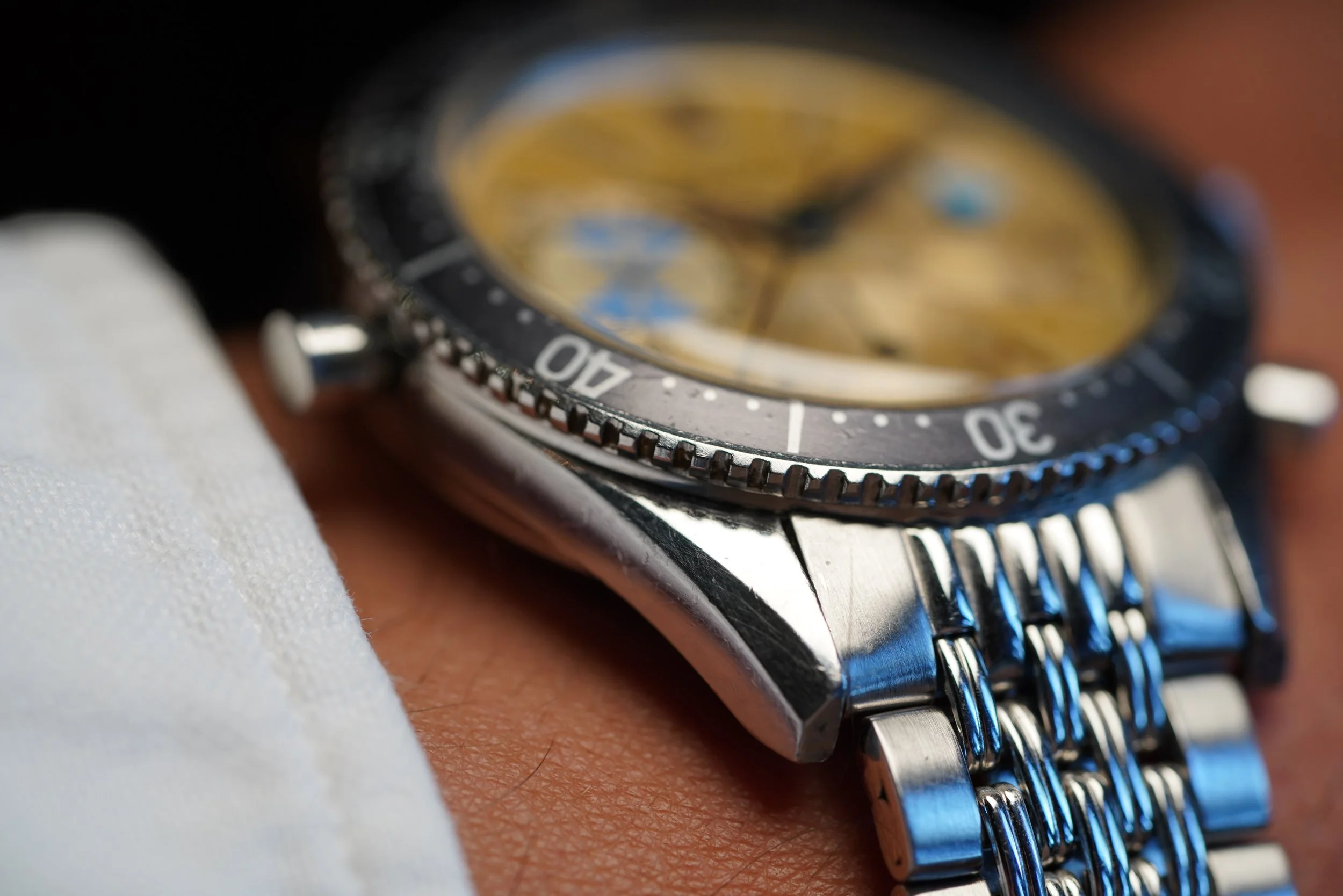 The case appears to be unpolished. It features a Heuer Gay Frères bracelet which was added later and looks fantastic. It was designed for the Heuer Autavia reference 2446. The dial features an incredible warm patina.