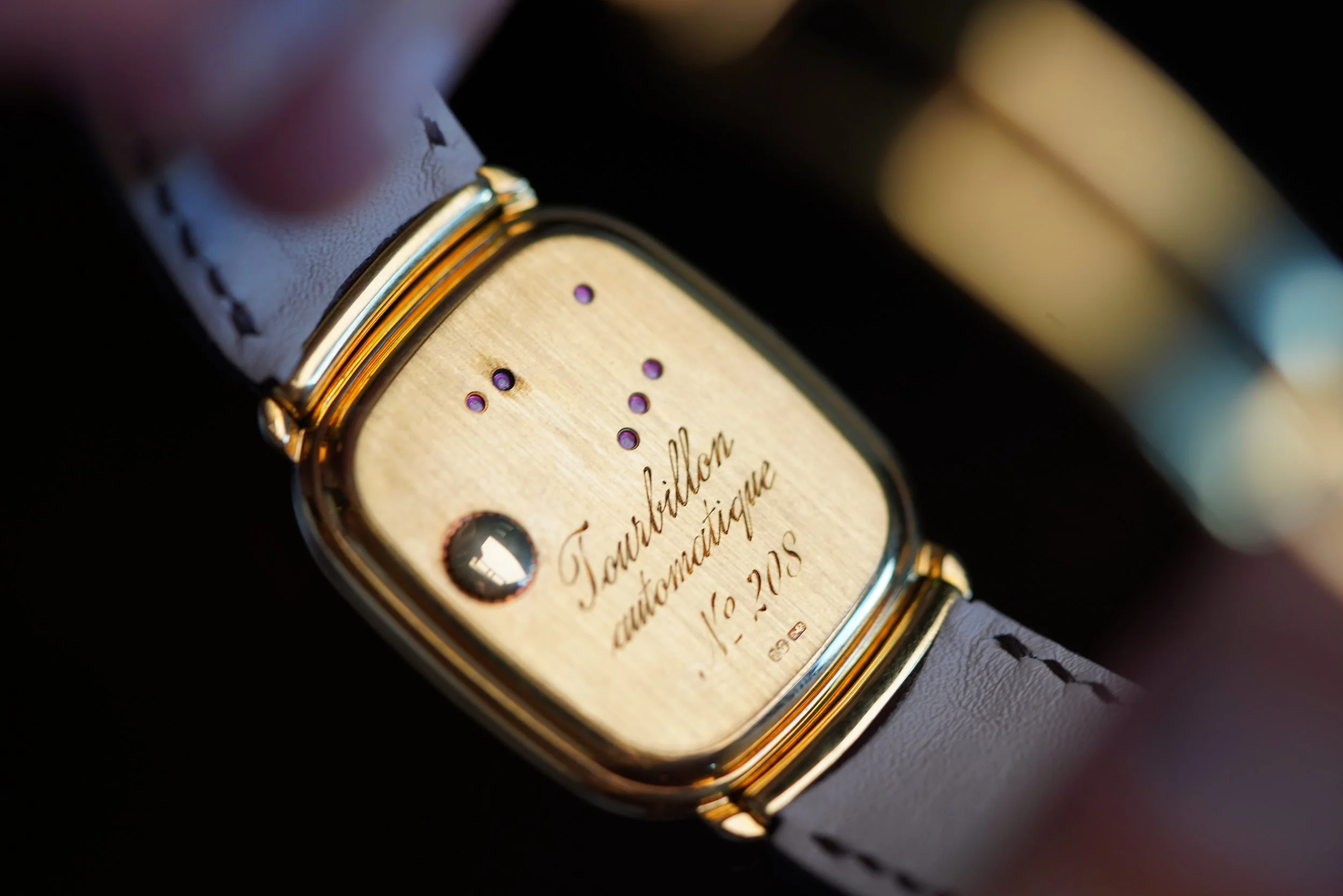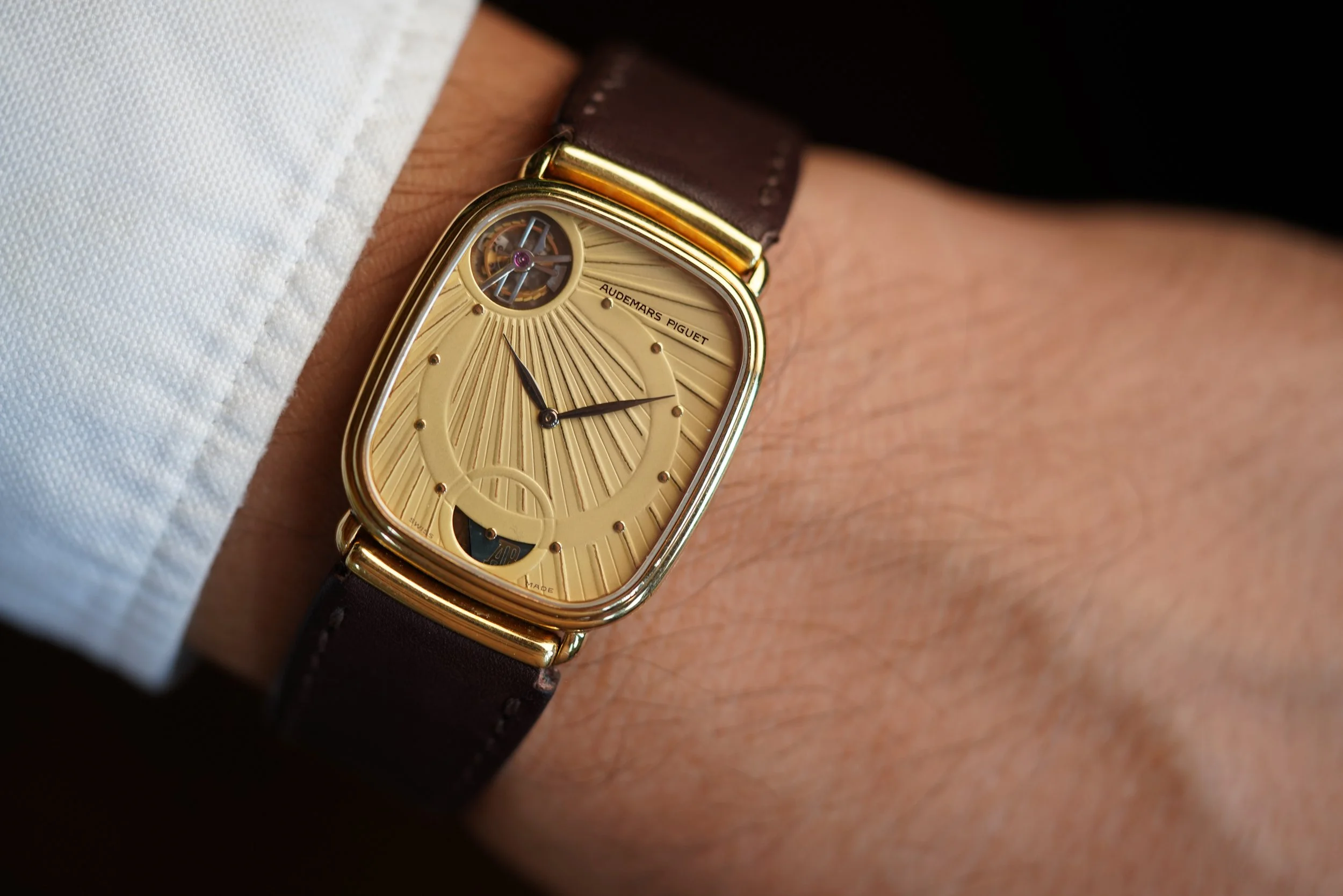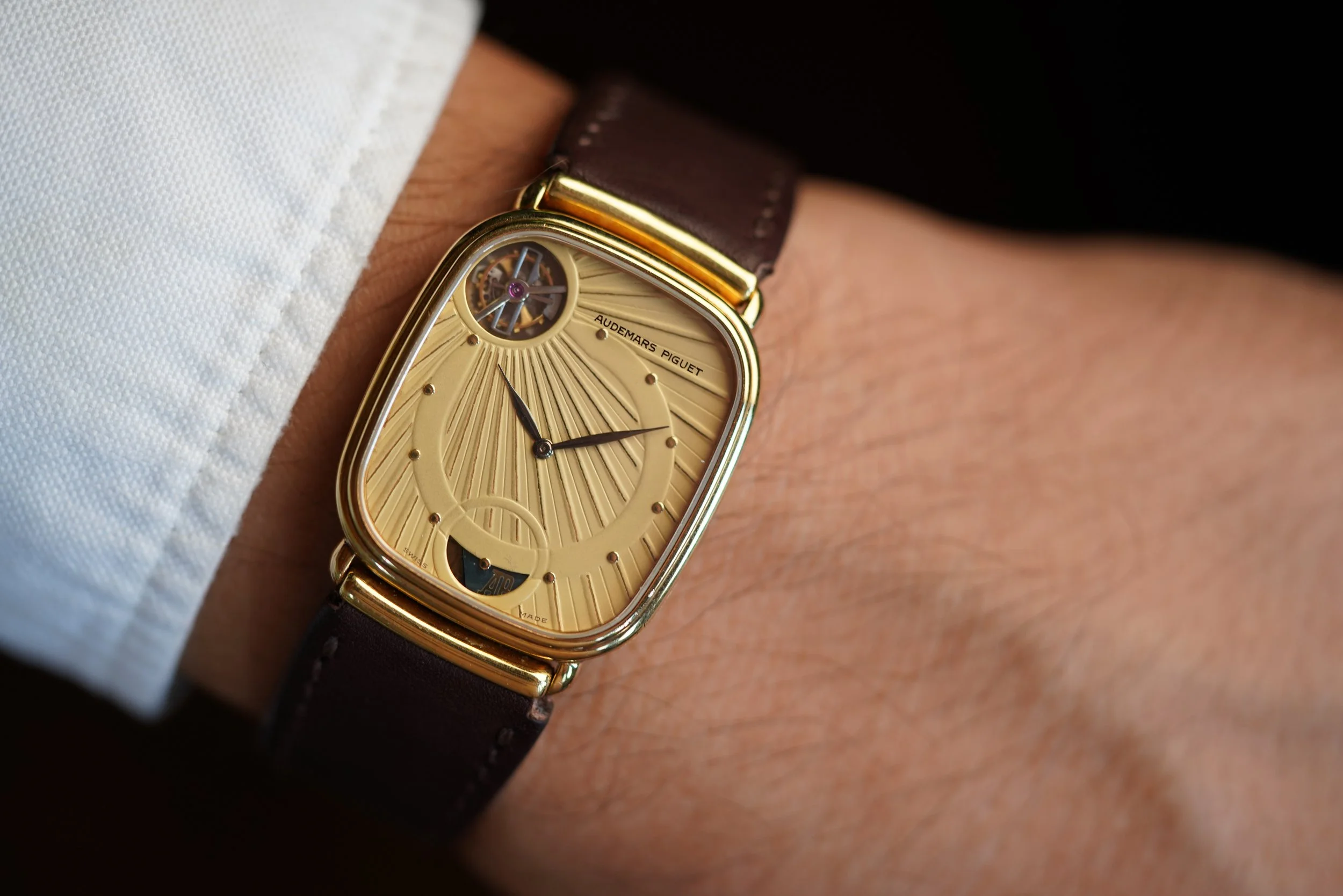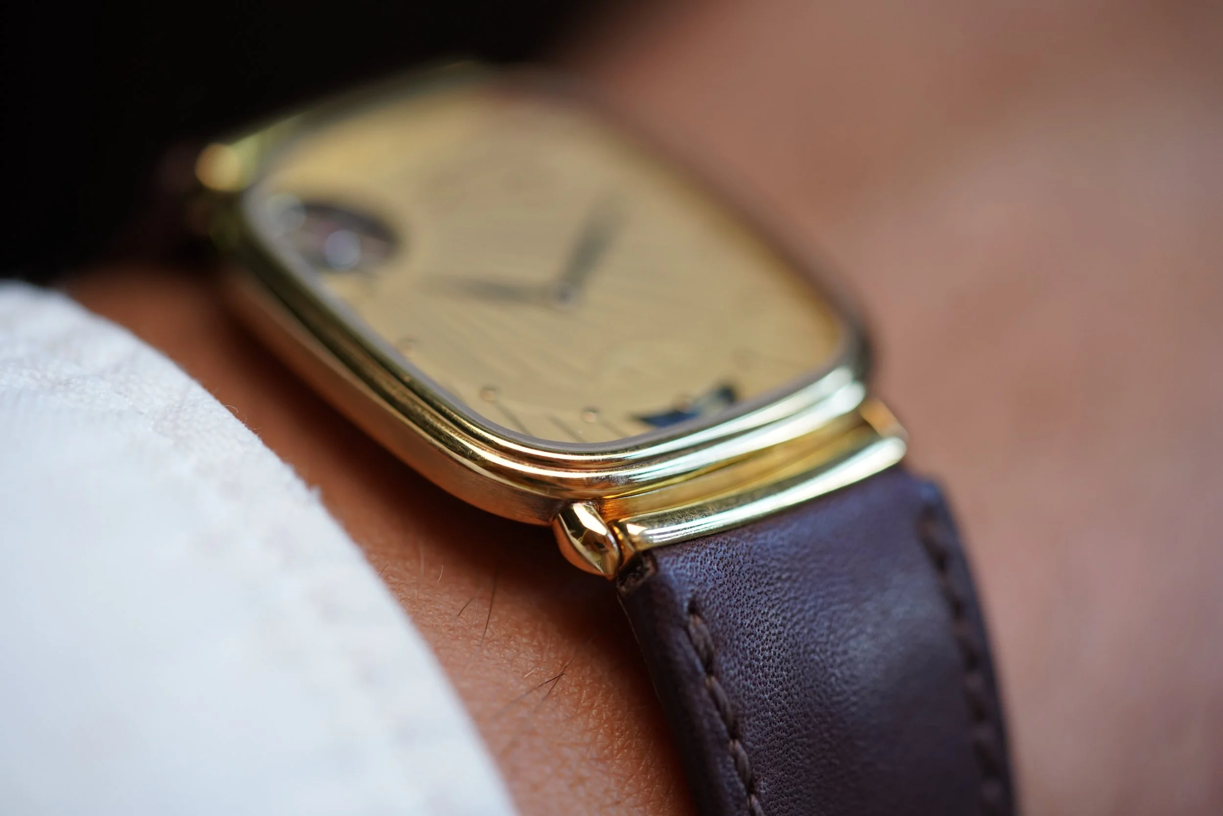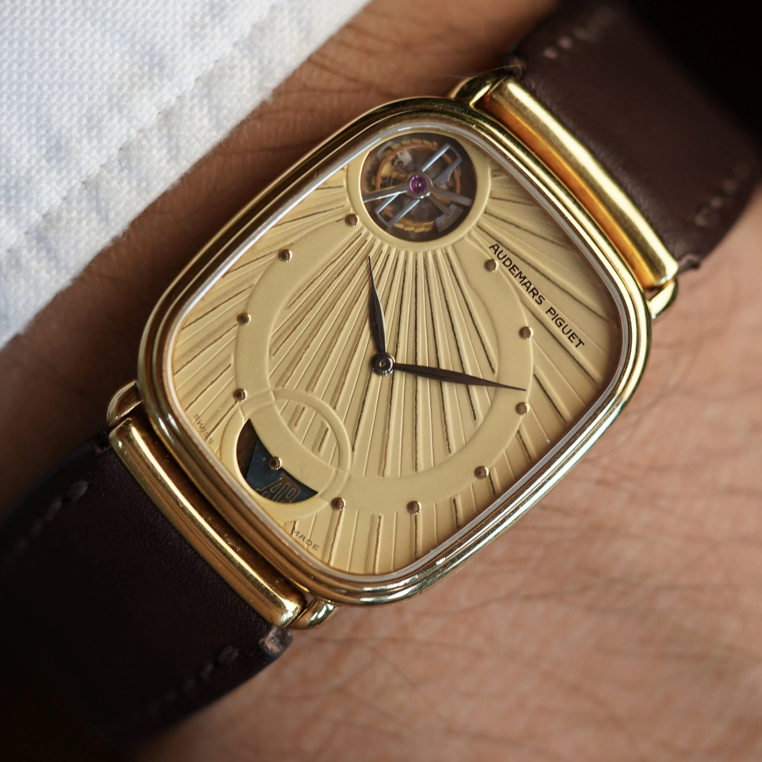 This Audemars Piguet Automatic reference 25643BA is an interesting tourbillon wristwatch in 18k yellow gold. The watch dates to circa 1988 and measures 29x33mm. It is powered by the calibre 2870. It features a guilloché dial layout, with apertures for the tourbillon and automatic oscillating rotor. It is paired on a leather strap, with an 18k yellow gold Audemars Piguet signed buckle. The caseback engraving is numbered 208.
