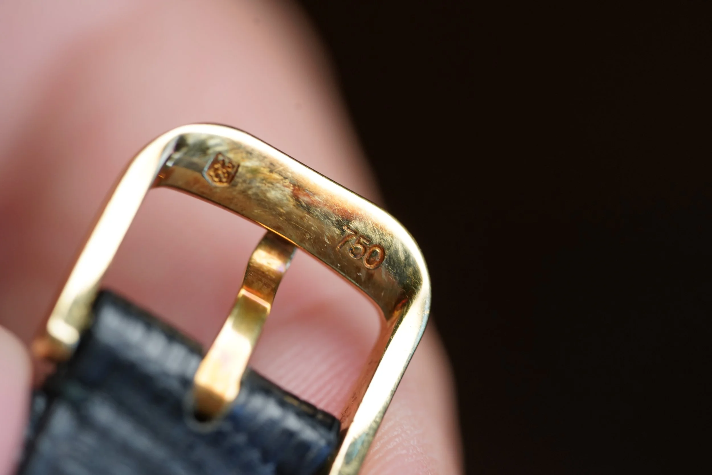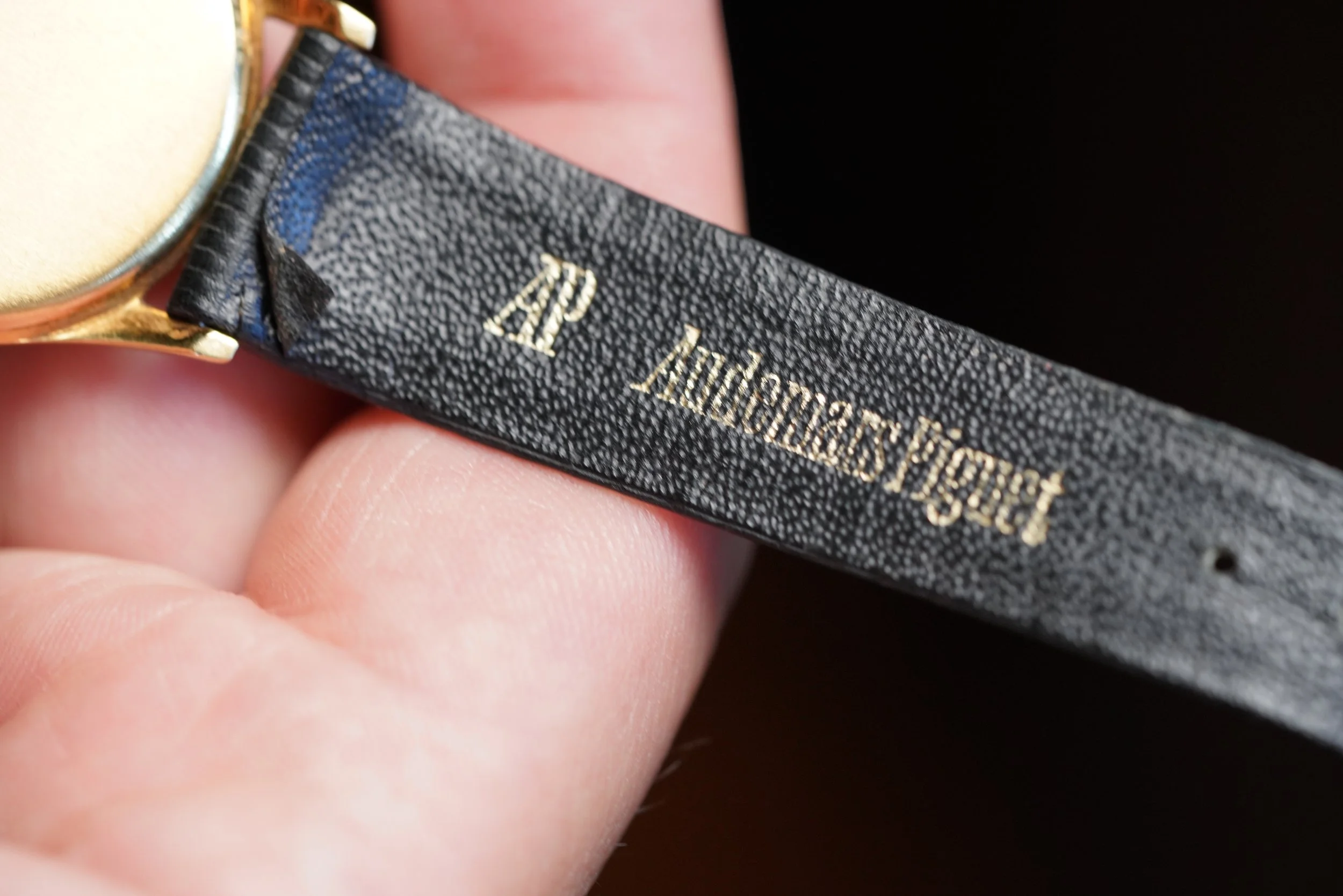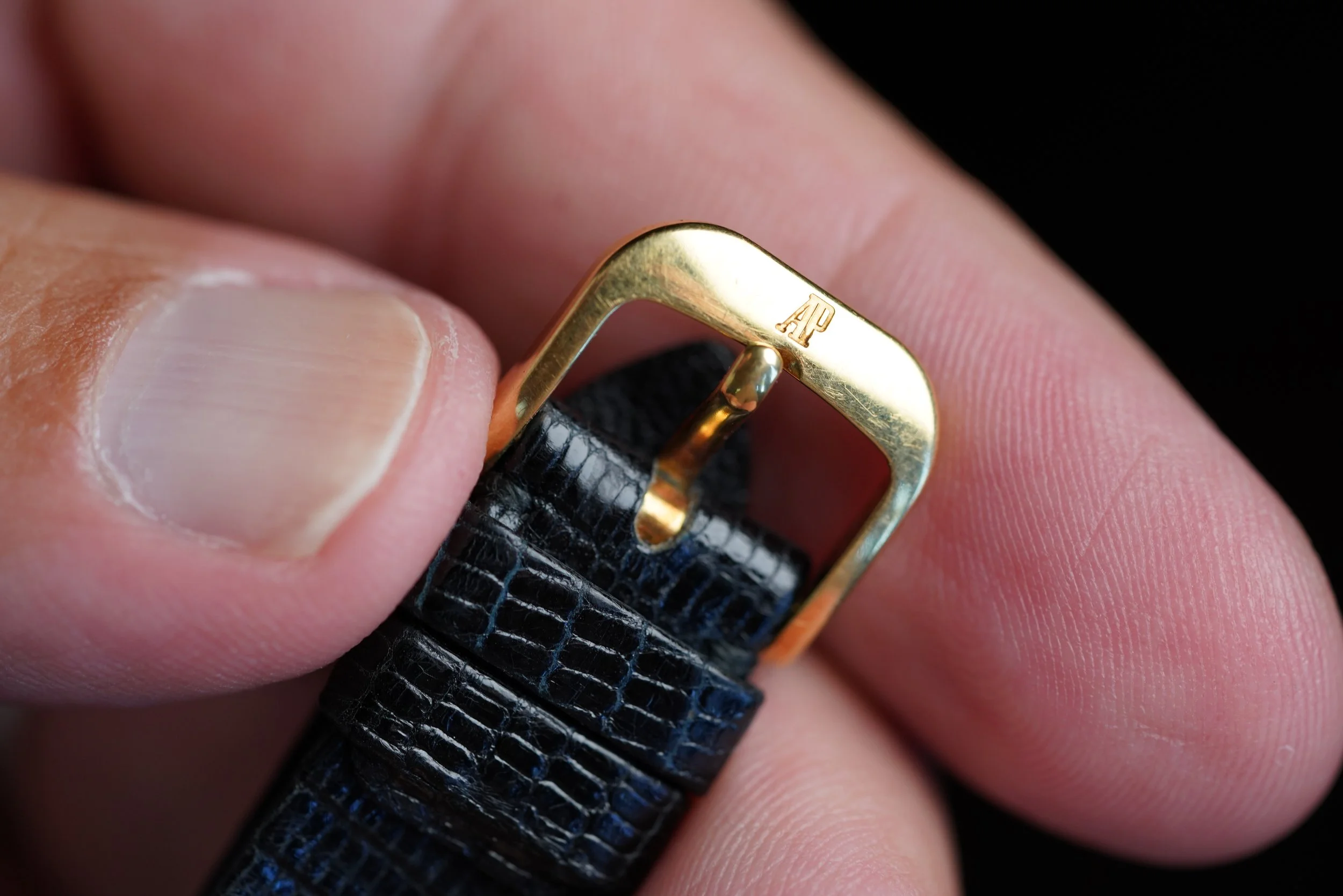 The watch does not come with box and papers. We do not know the service history, but it is running well. It is paired on an AP strap and AP gold buckle.