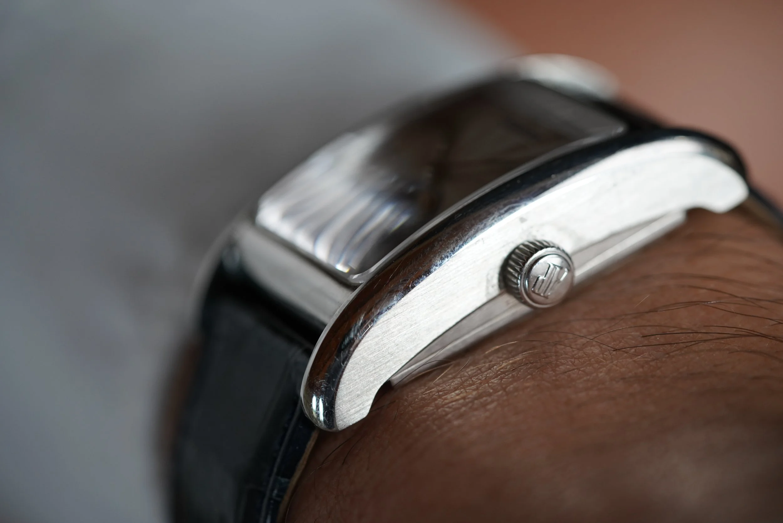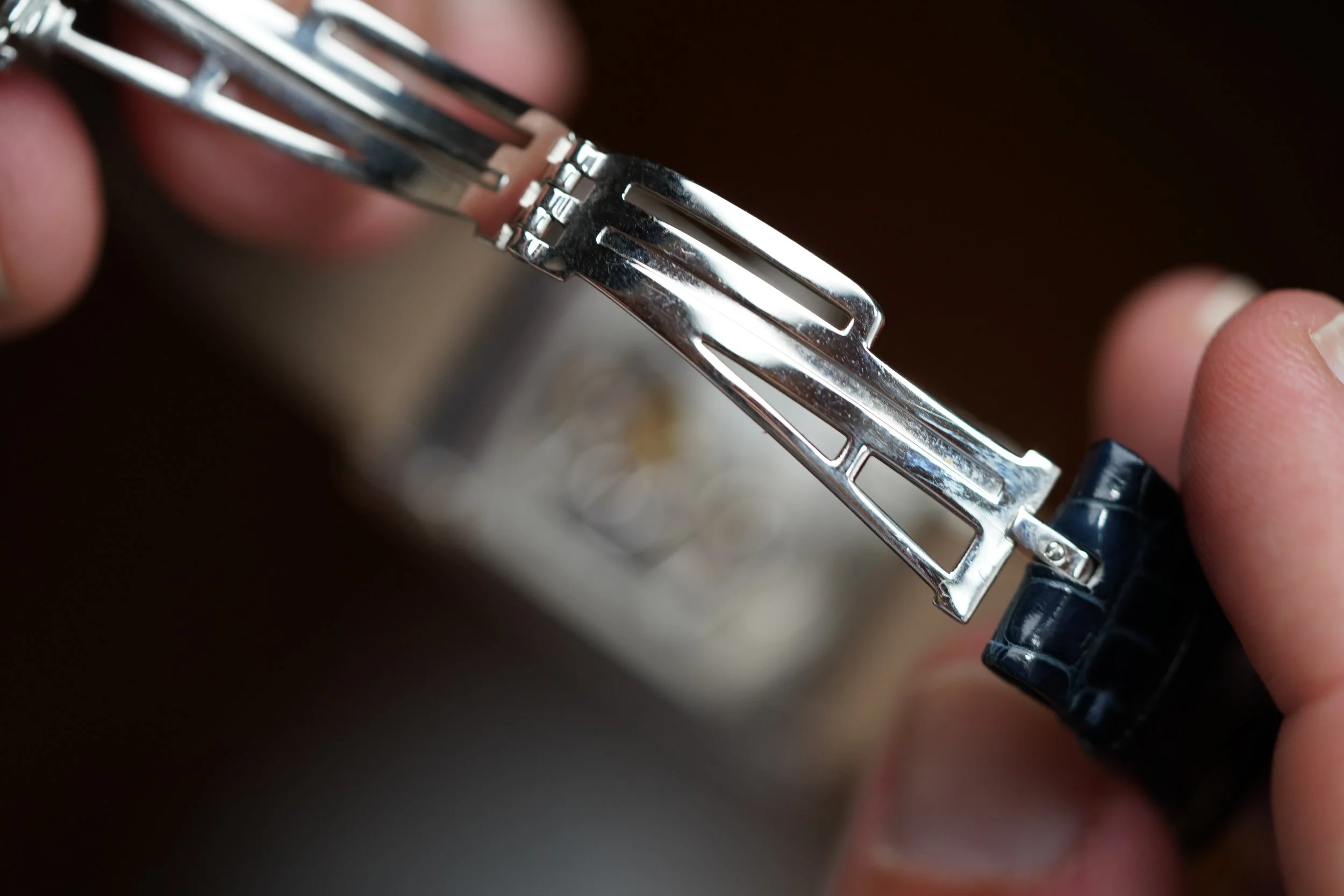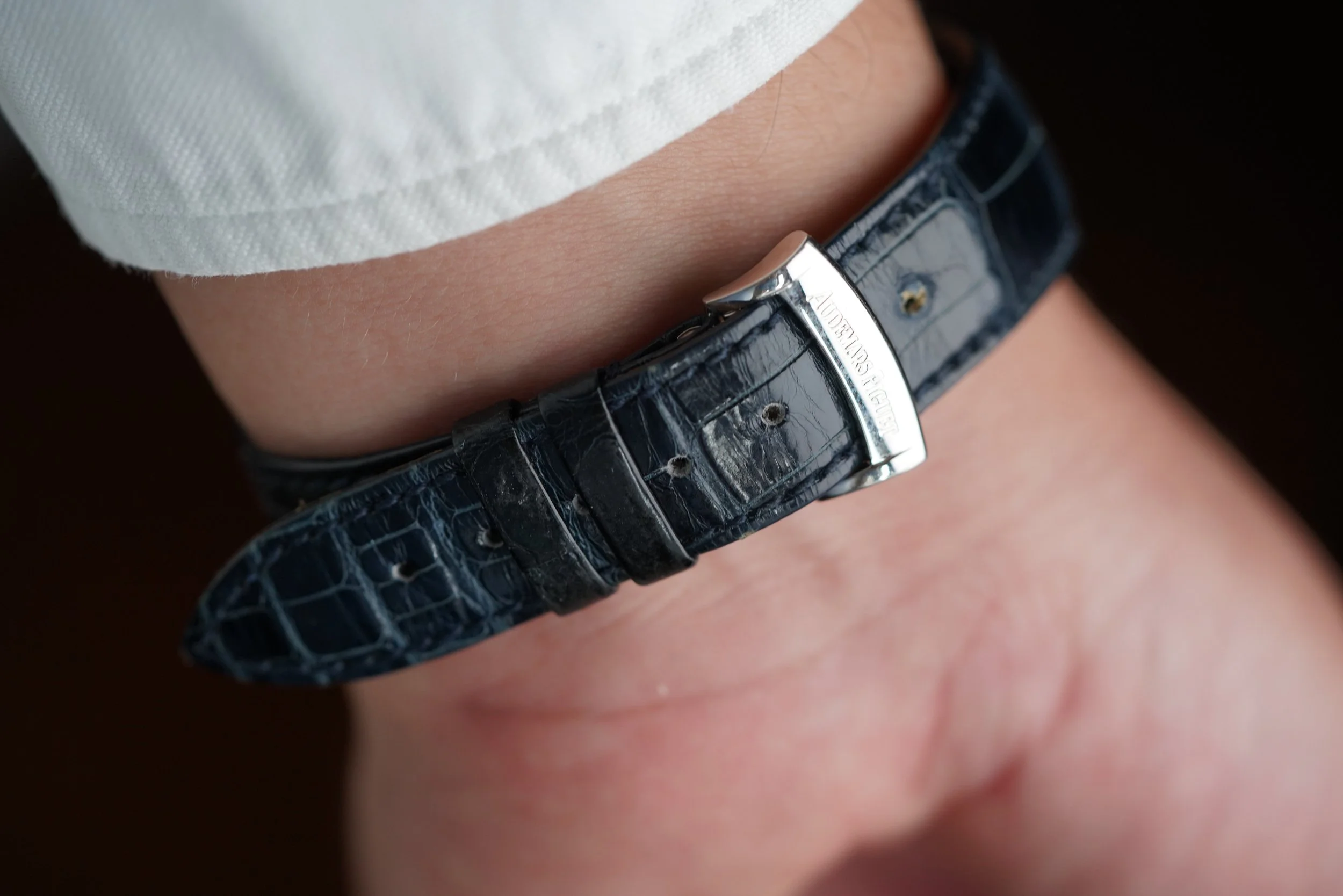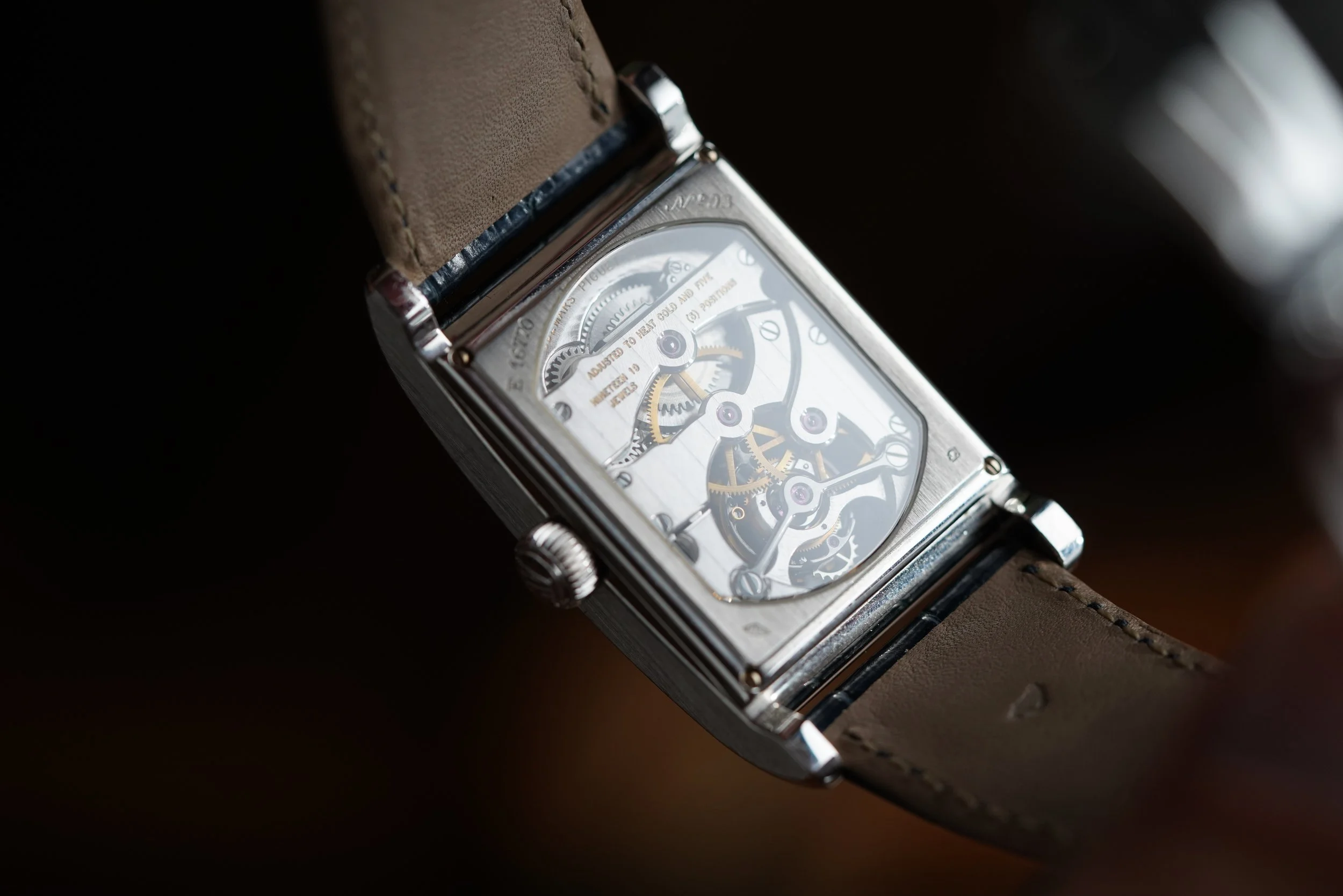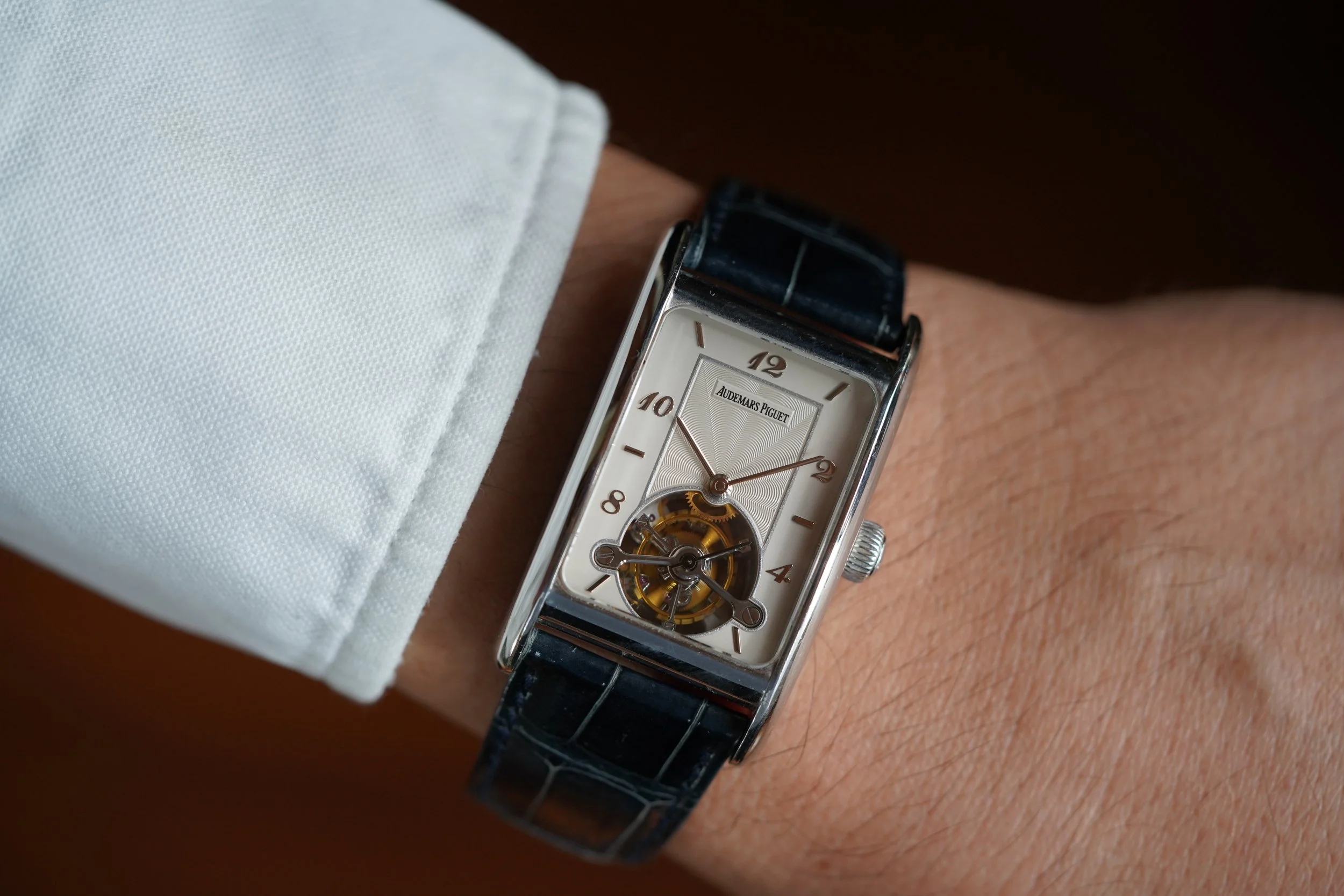 This Audemars Piguet Edward Piguet Tourbillon reference 25819PT is a handsome dress watch with a tourbillon complication. It features a white dial with Breguet numerals. The platinum case features an exhibition caseback and measures 27mm by 46mm. It is paired with a leather Audemars Piguet strap and platinum folding AP clasp.