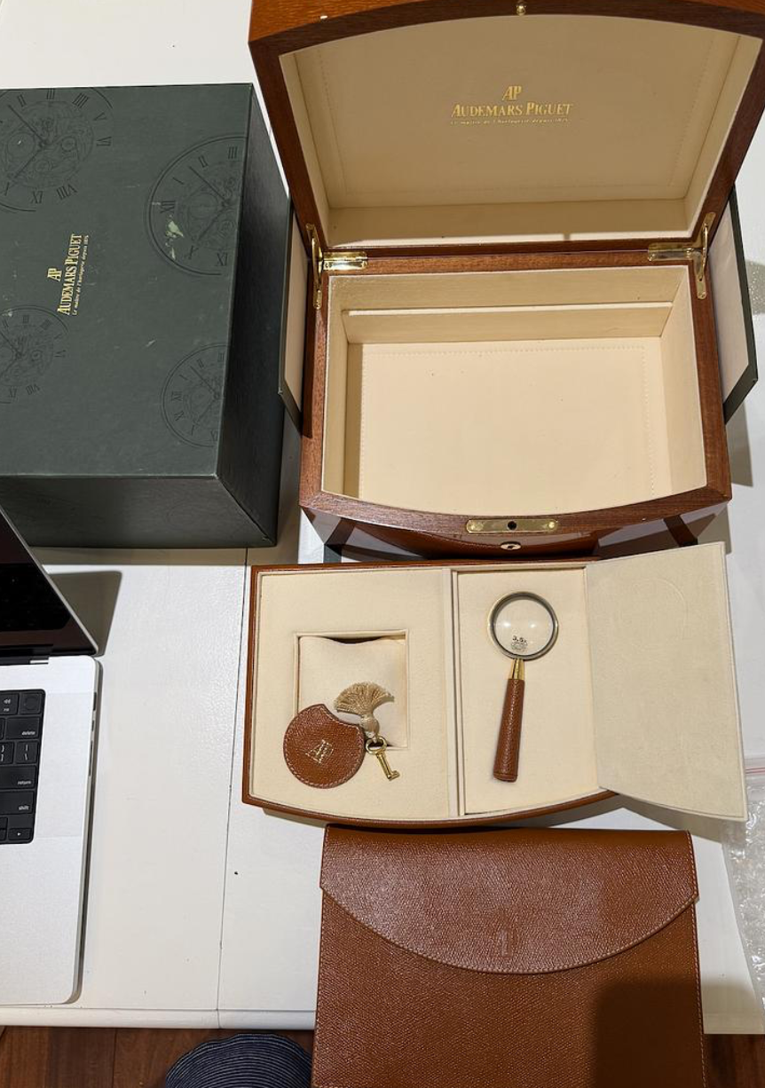 The watch comes with a box and papers. It was originally sold in 2001. We do not know the service history - it is losing a few minutes daily and will likely need a service.