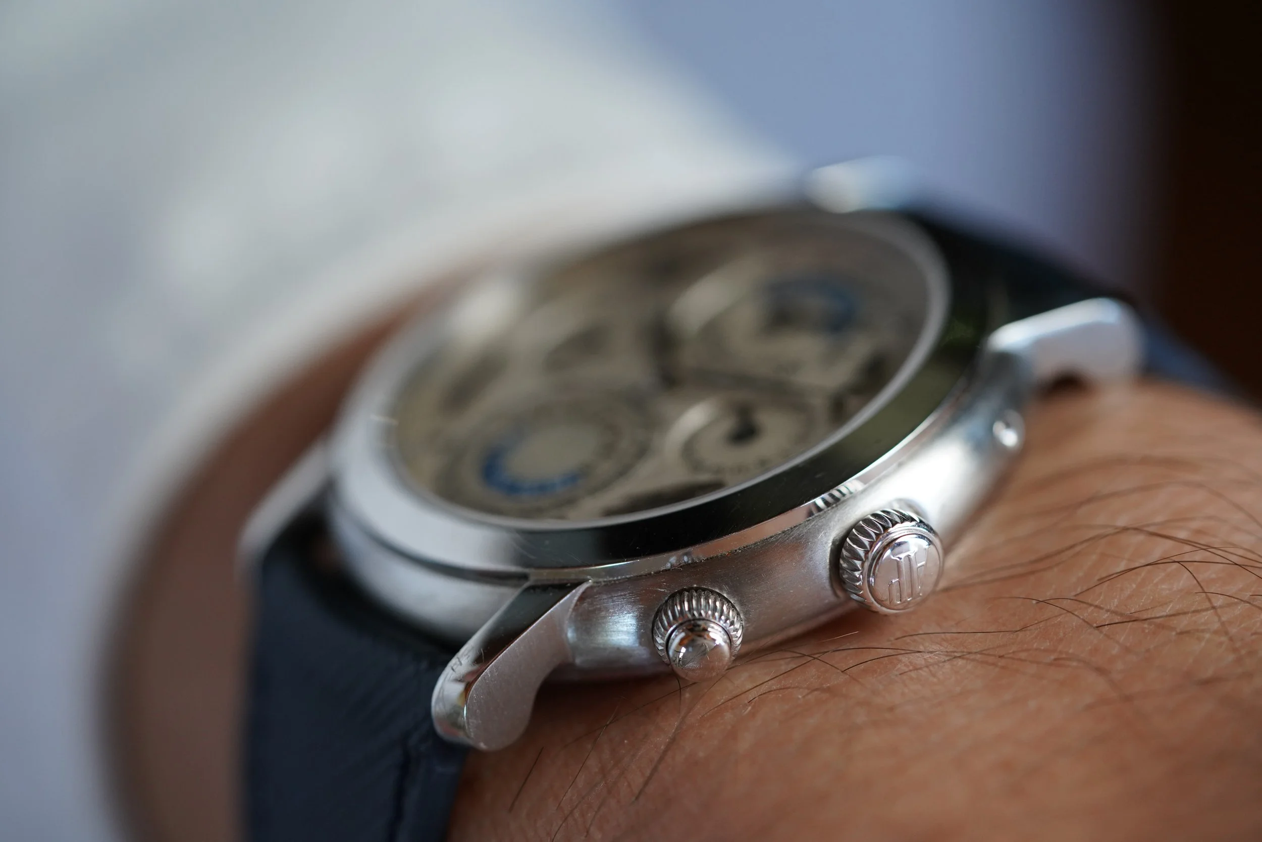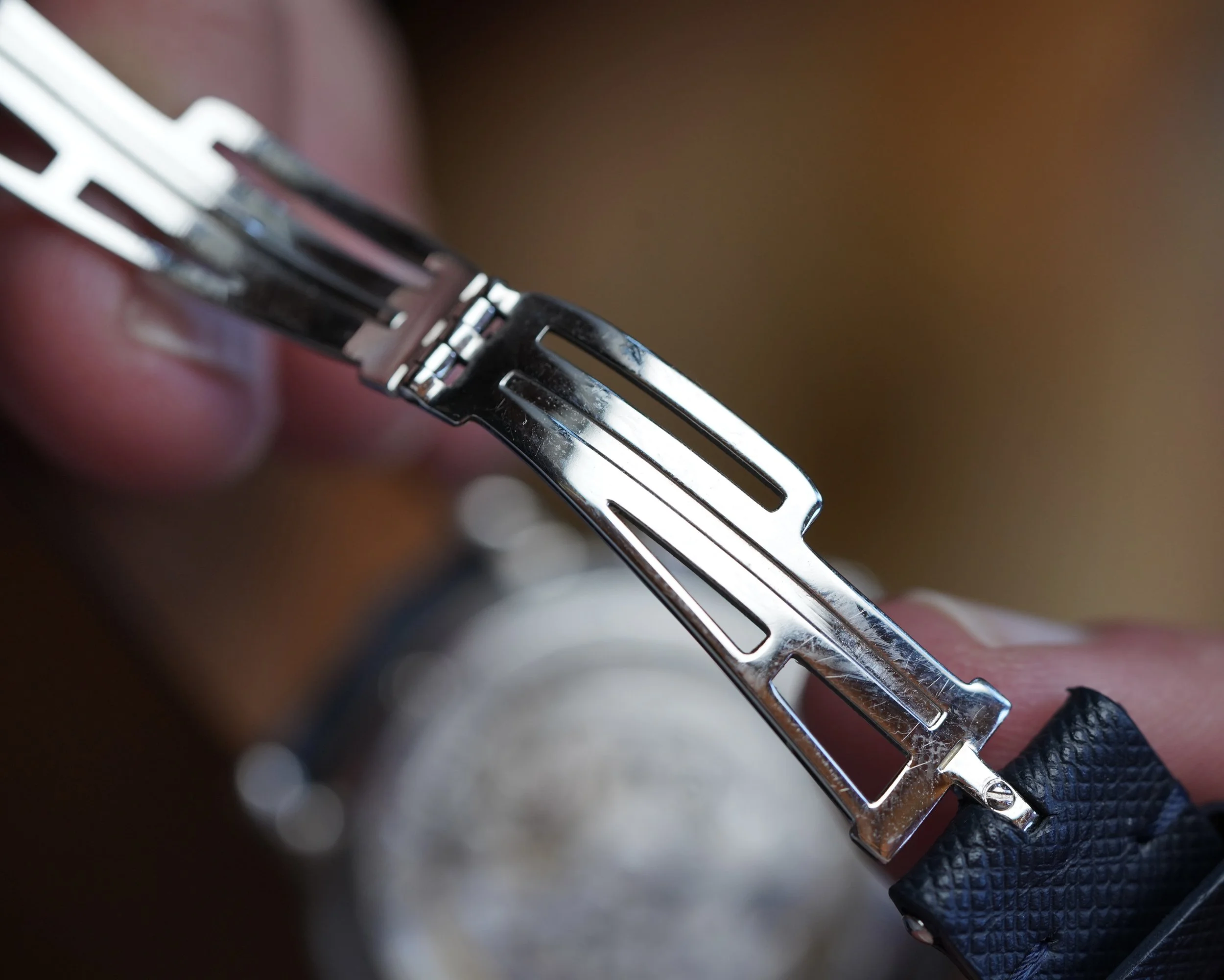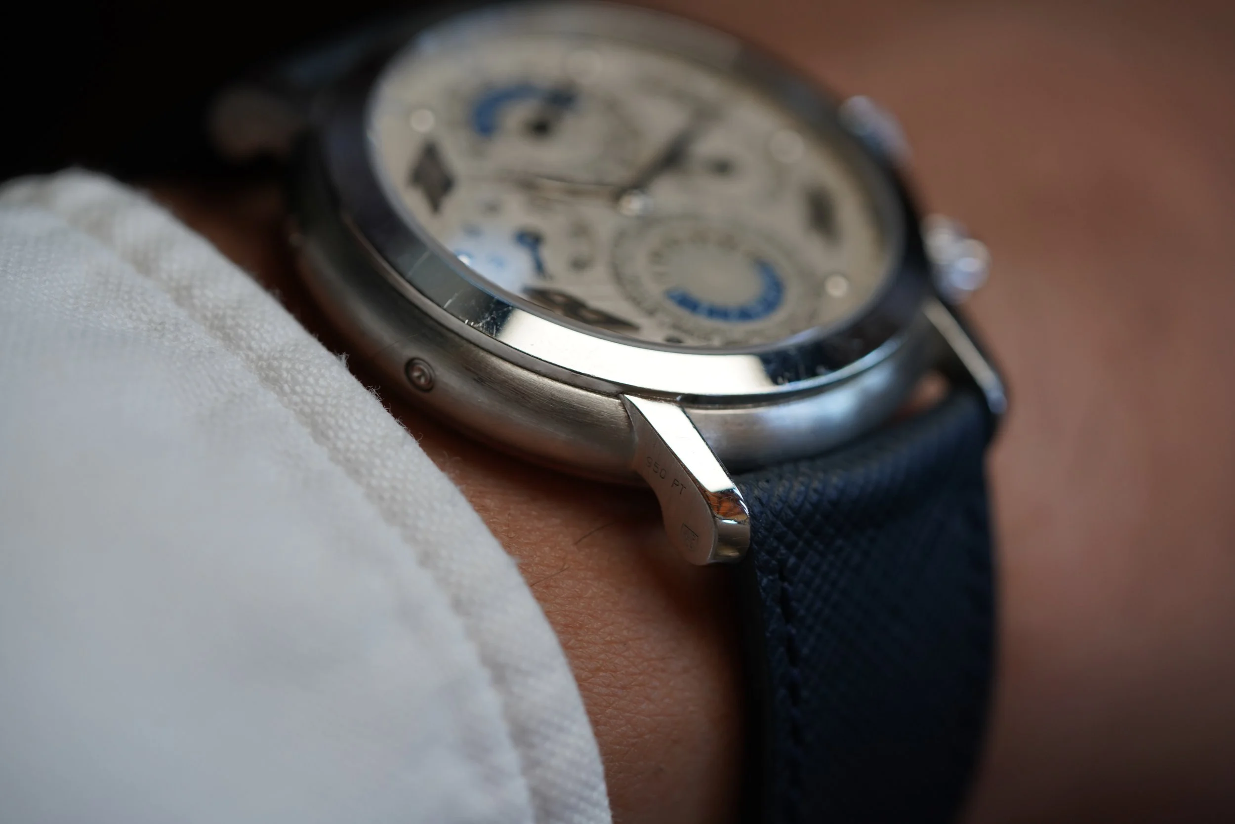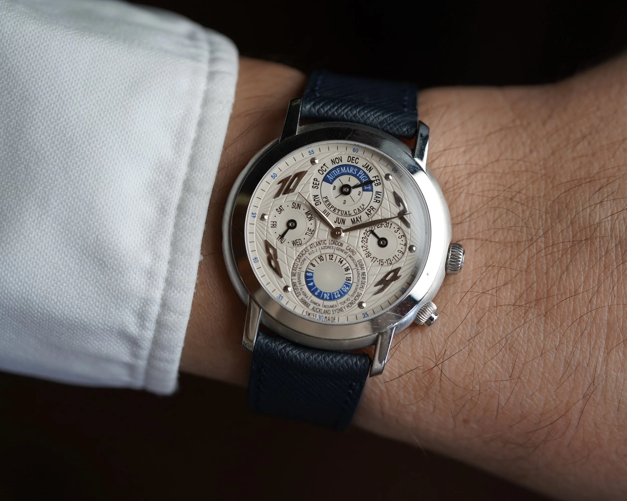 This Audemars Piguet Jules Audemars Metropolis s an incredible Quantieme Perpetuel calendar with world timer indicator at 6’oclock. The platinum case measures 39mm in diameter and approximately 44.5mm lug to lug. The dial is white with silvered numerals at 2,4, 8 and 10 o’clock which are very interesting and make a visual statement. The watch features an exhibition caseback displaying the movement and engraved rotor. It comes with a platinum folding AP clasp from Audemars Piguet. The case appears to be unpolished.