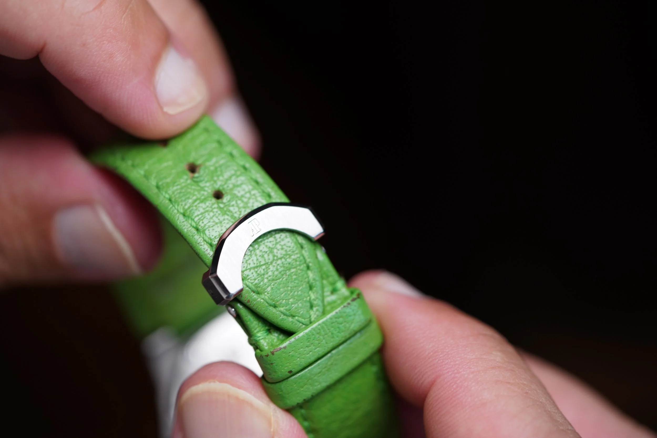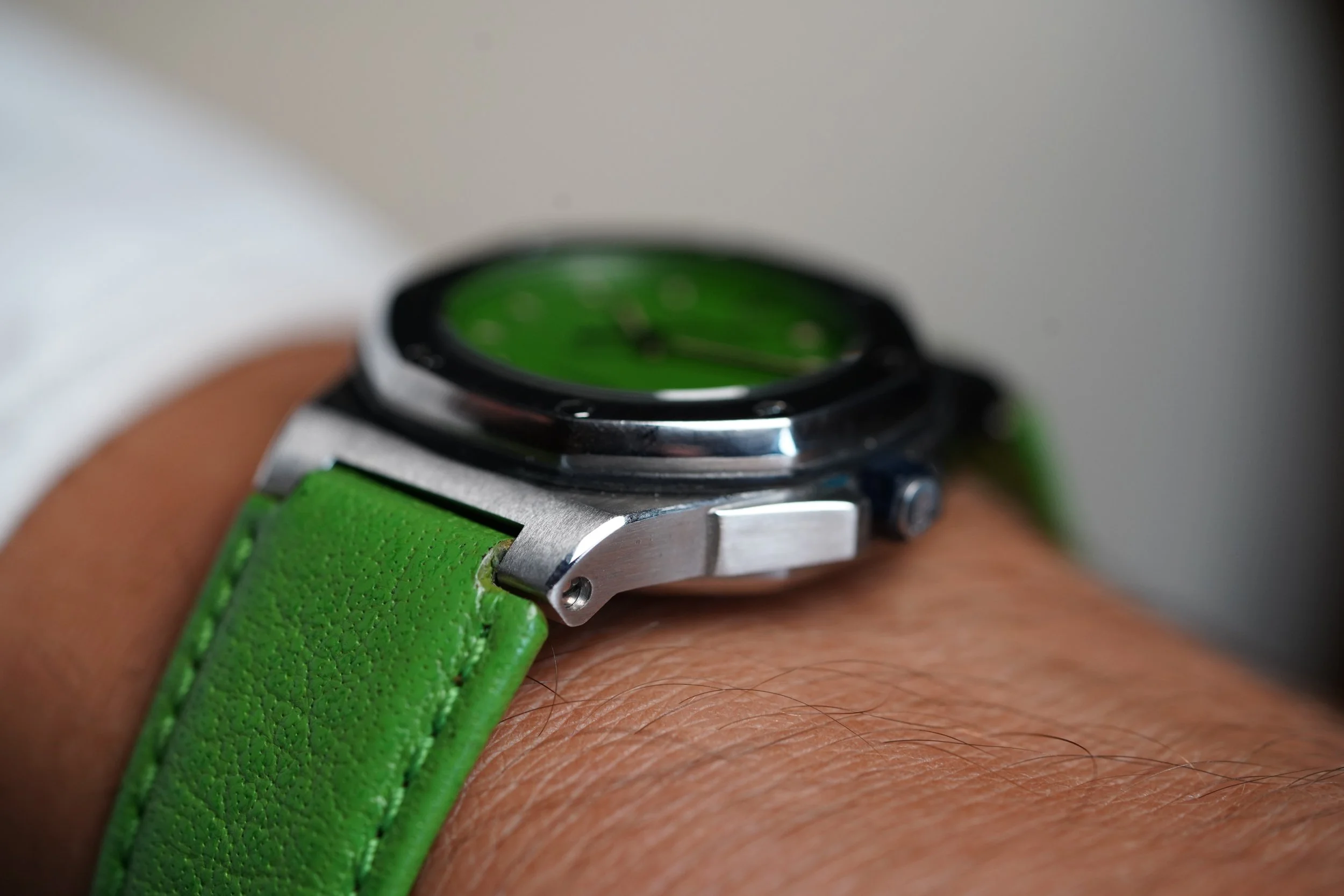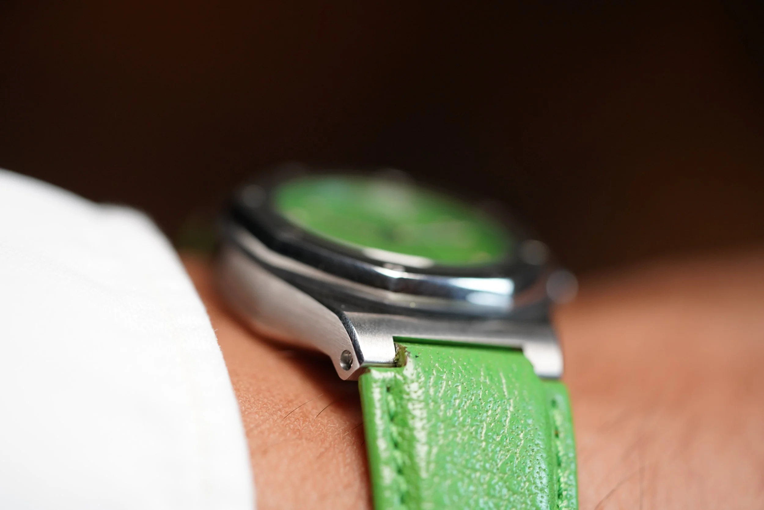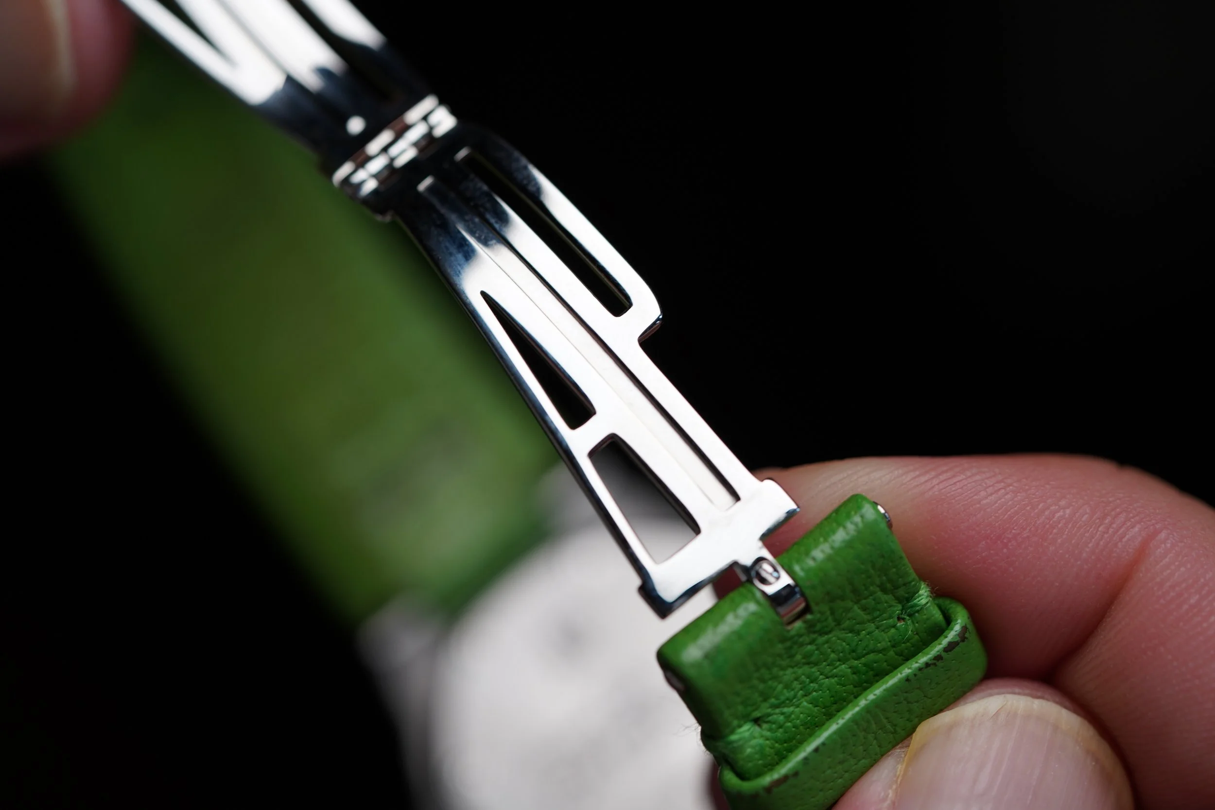The Audemars Piguet ladies Royal Oak Offshore 77151ST is one of the epic watches from AP. The green dial and strap are very attractive colors with a pop! We do not know the date of production. The case has been polished in the past. It measures 28mm in diameter.