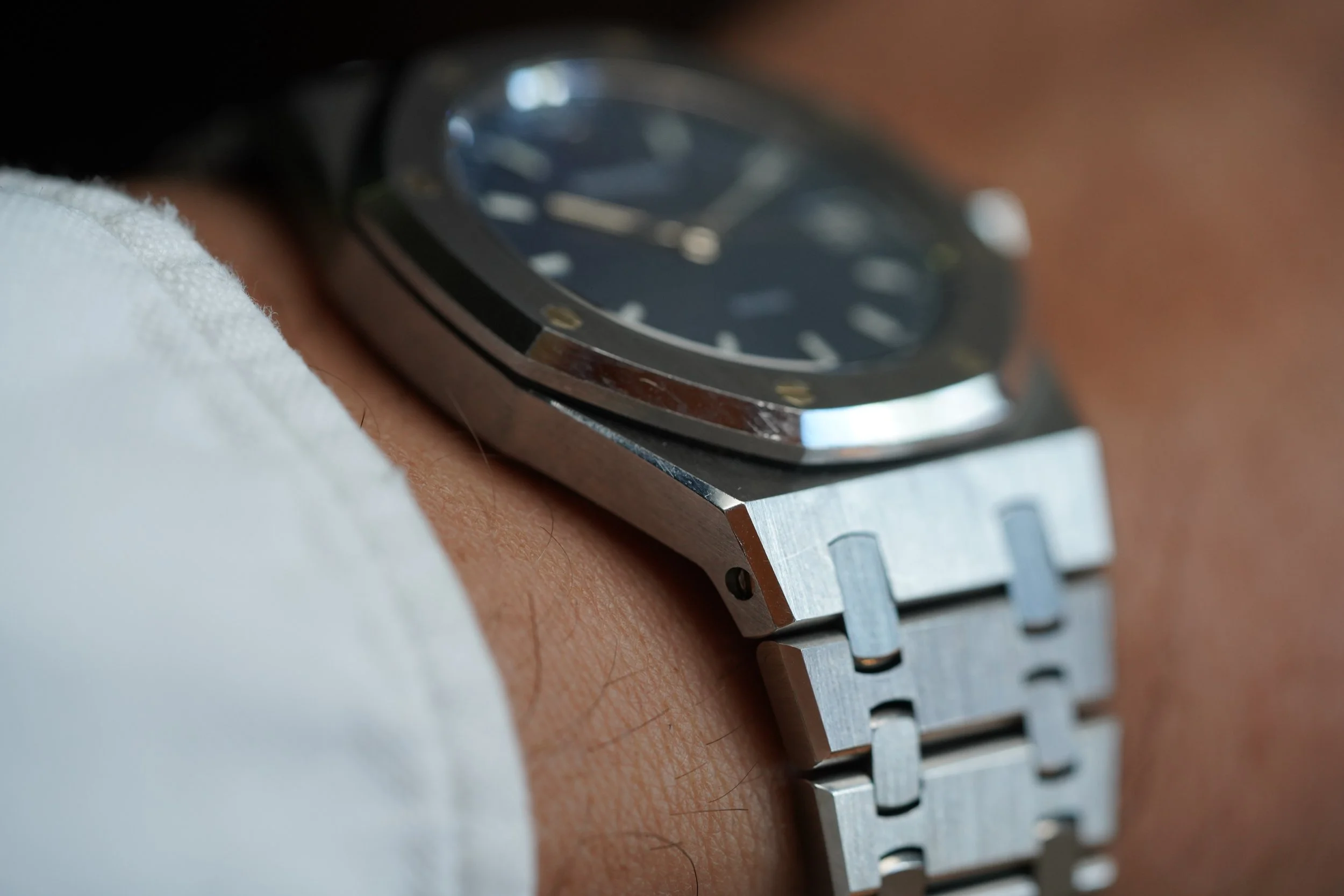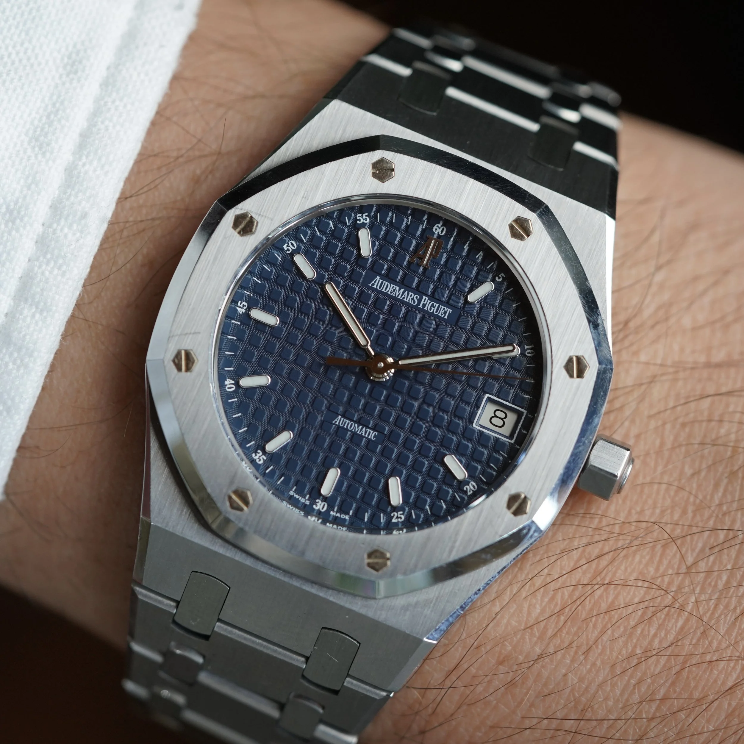 The Audemars Piguet Royal Oak is among the most iconic wristwatches. This example, a reference 14790ST, is a great compact Royal Oak. It measures 36mm in diameter, but wears larger as it has a lug to lug measurement of 46mm. The bracelet can fit a wrist of approximately 7.25 inches. The case is very attractive and appears to be unpolished.