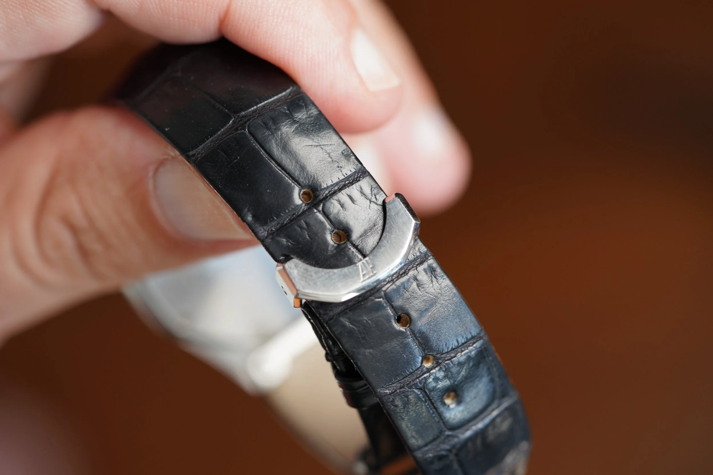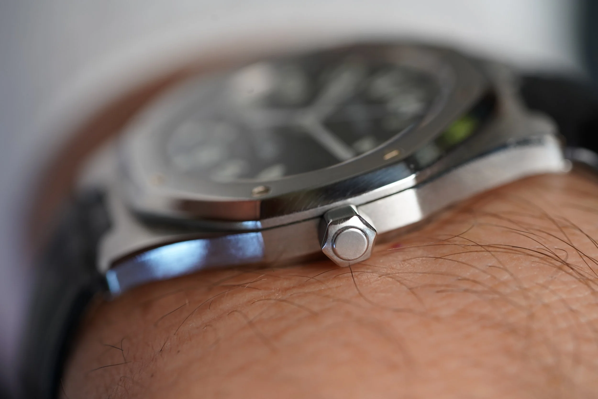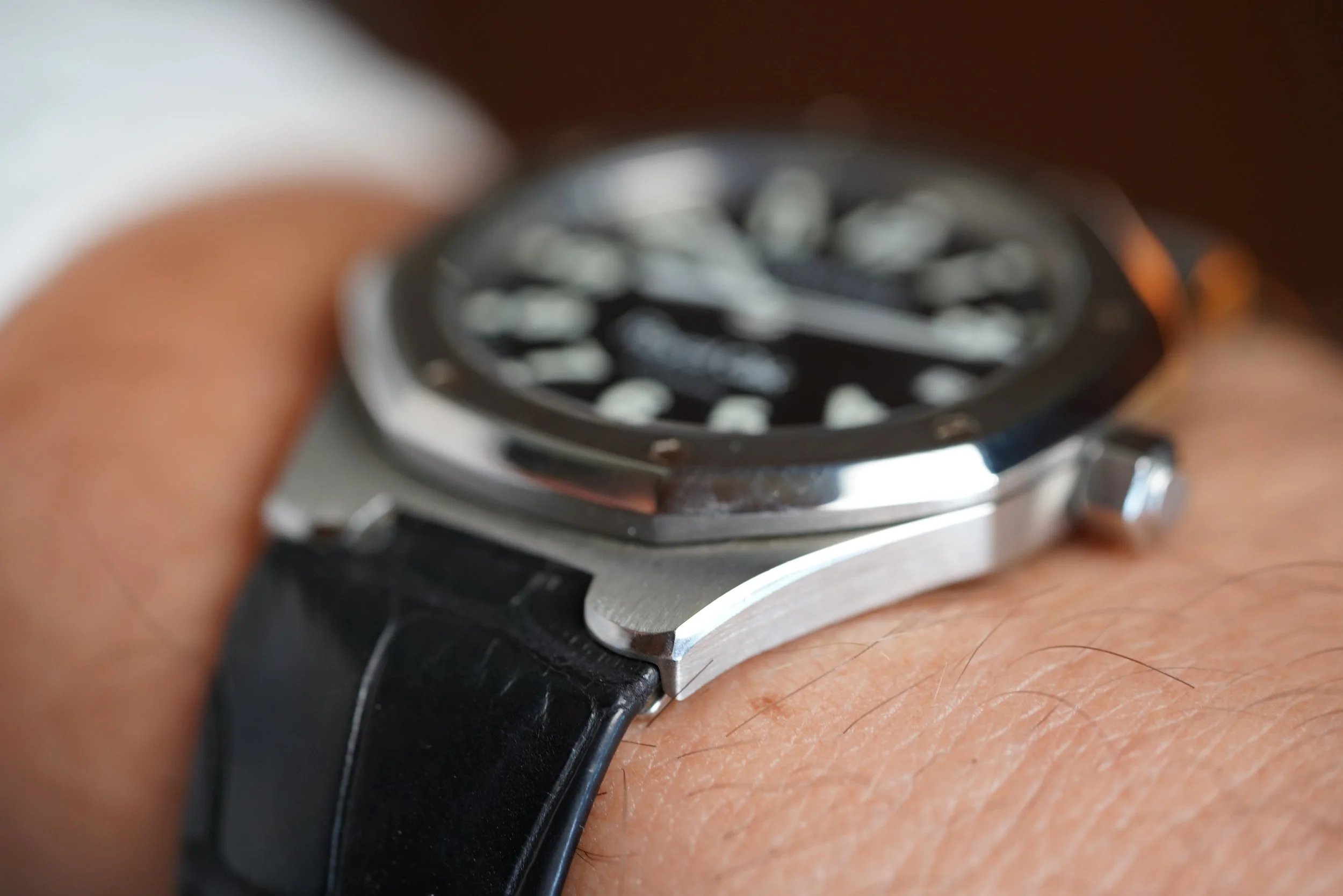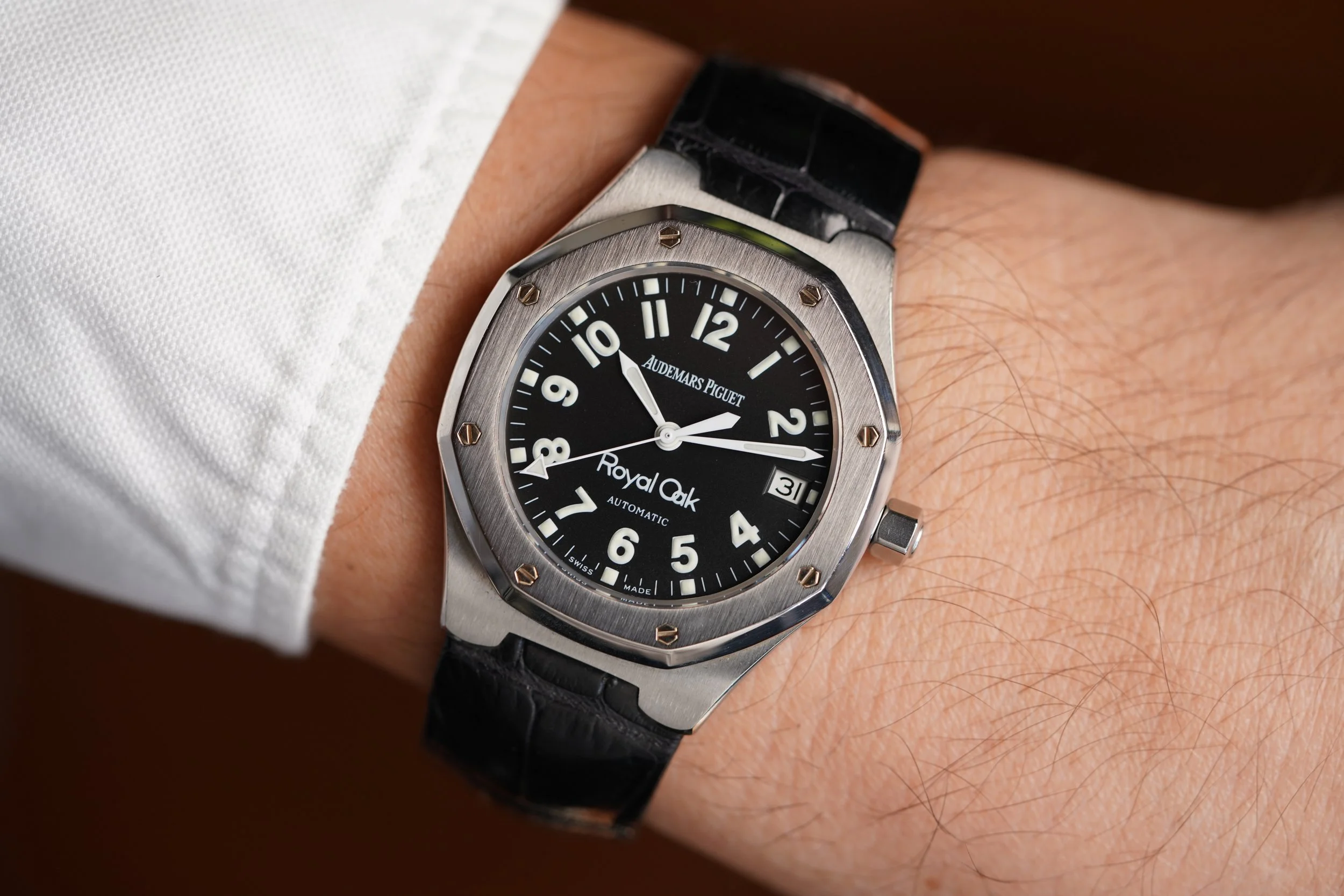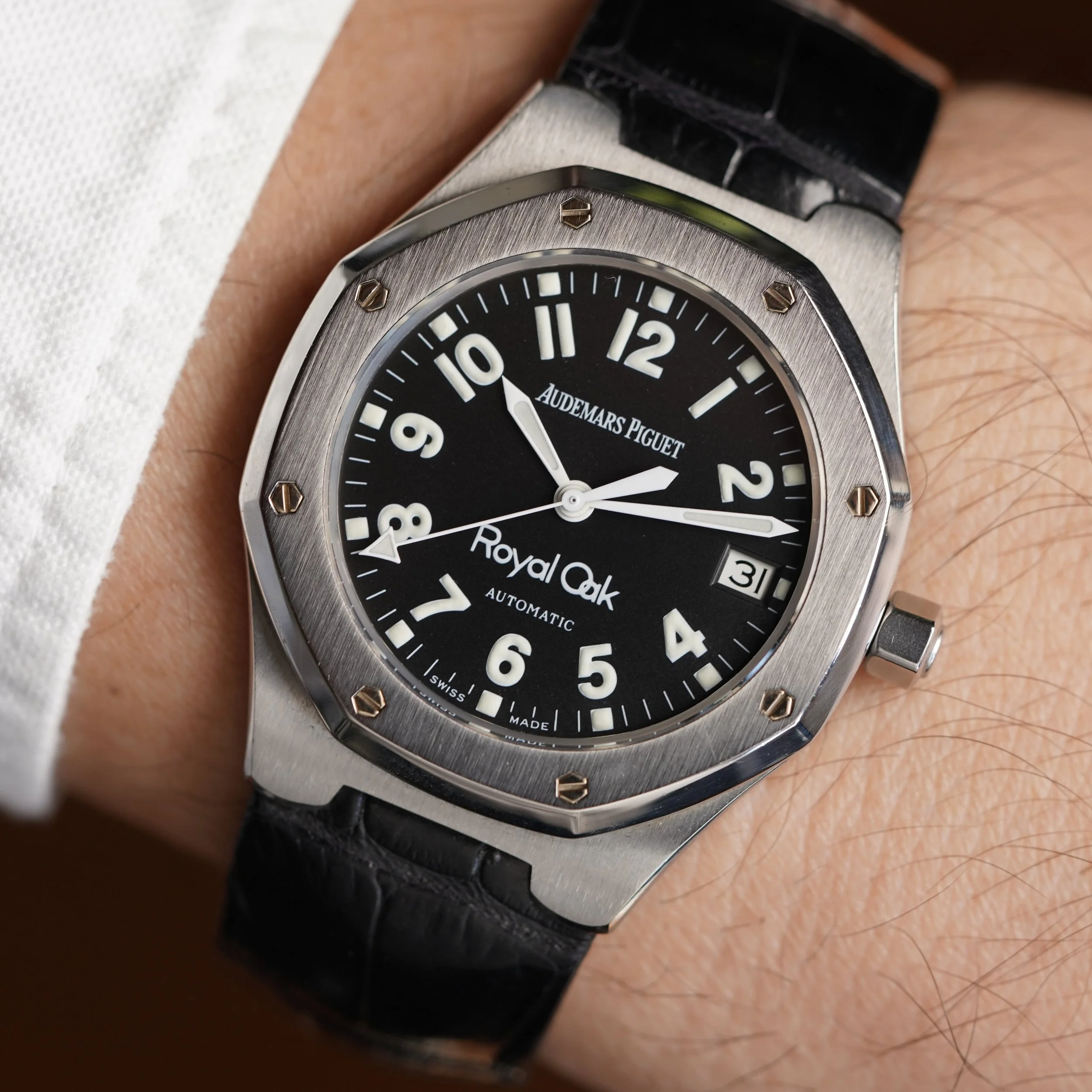 Many collectors consider the Audemars Piguet Royal Oak the greatest watch on Earth. The Military dial Royal Oak 14800STOOD080VS14 is one of the best values in Royal Oak models. This example dates to the 1990s. The stainless steel case has been polished. It measures 36mm in diameter and 43mm in length.