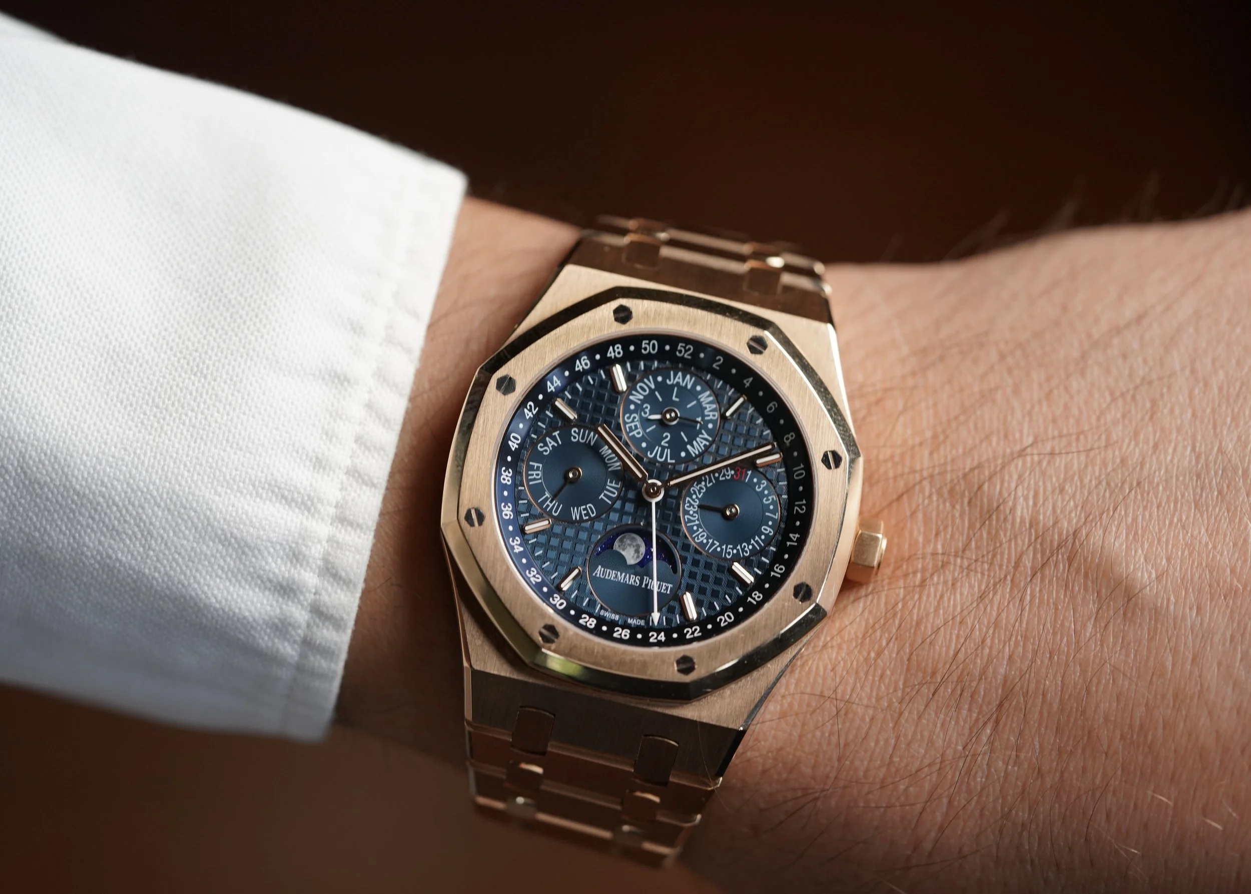 This Audemars Piguet Royal Oak Perpetual Calendar reference 2657OR.OO.12200R.02 is an incredible perpetual calendar. It features a blue “Grande Tapisserie” dial. The rose gold case measures 9.5mm in height and 41mm in diameter. The case is in great condition and appears unpolished. The watch is powered by the calibre 5134 an incredible complicated movement made by Audemars Piguet. The dial on this model is insanely attractive. The moon disc is one of the most beautiful examples in Audemars’ catalog. For those looking for a grail complicated Audemars Piguet Royal Oak, this 2657OR.OO.12200R.02 is an excellent choice.