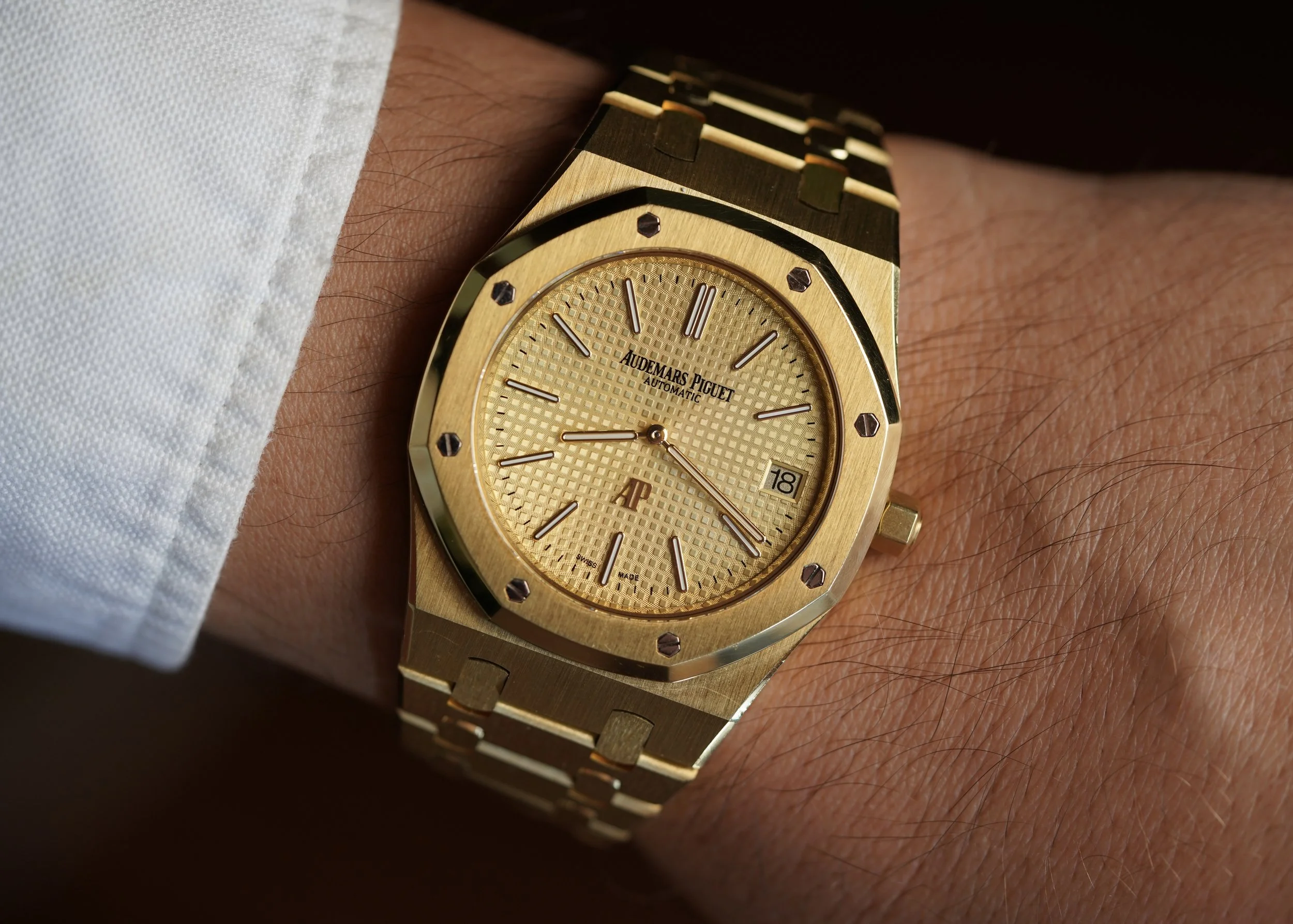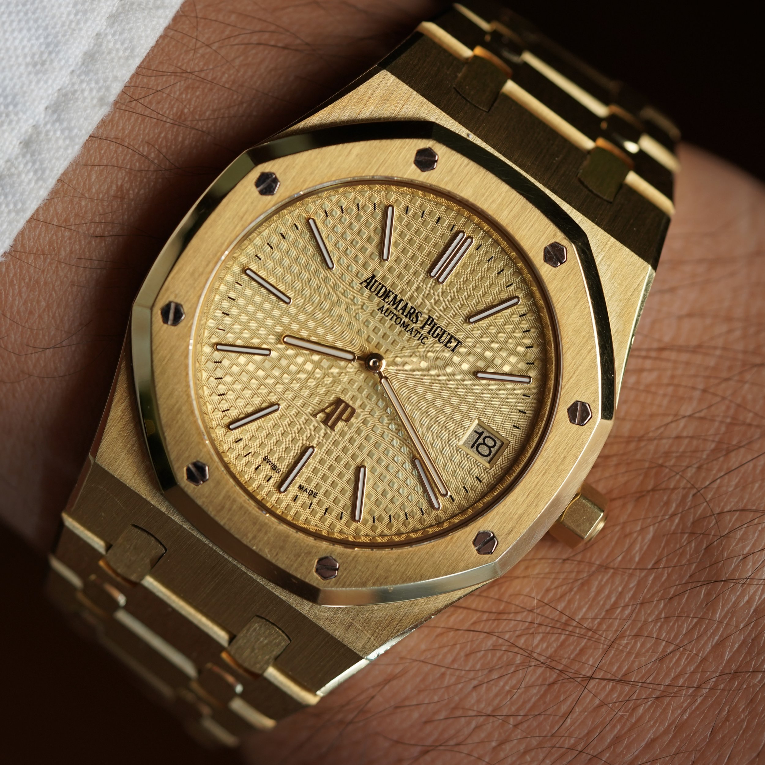 The Audemars Piguet Royal Oak is certainly one of the hottest watches and is desired by the most passionate watch collectors. This particular model dates to 2018, and was very seldomly worn over the past four years. The yellow-gold case remains unpolished and measures 39mm in diameter. It features a beautiful champagne dial and is powered by the calibre 2121.
