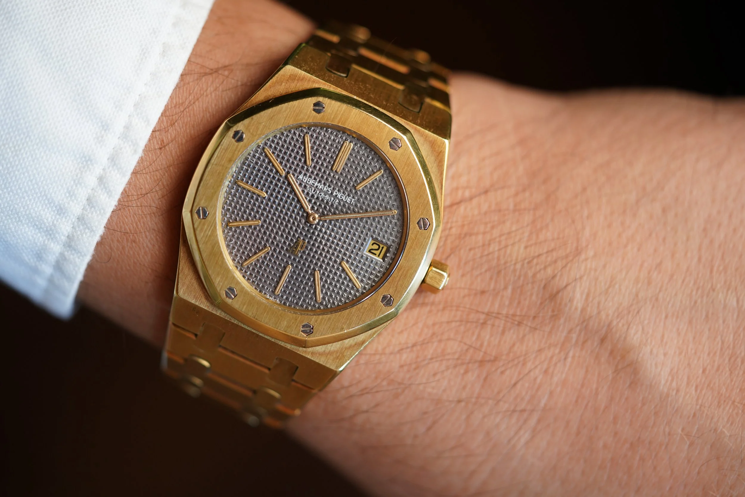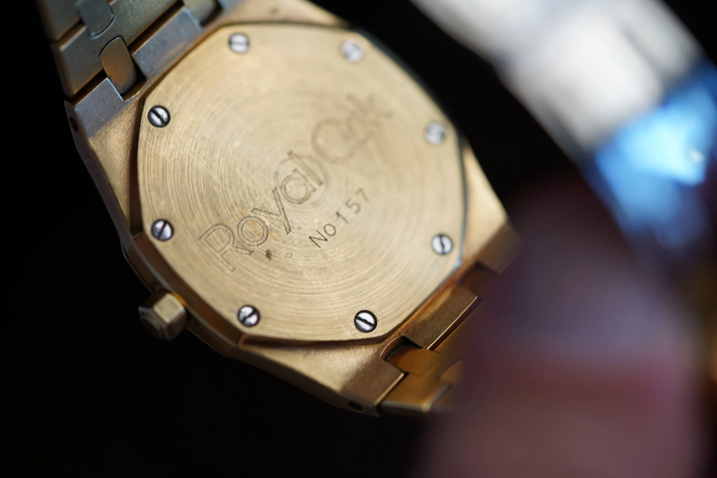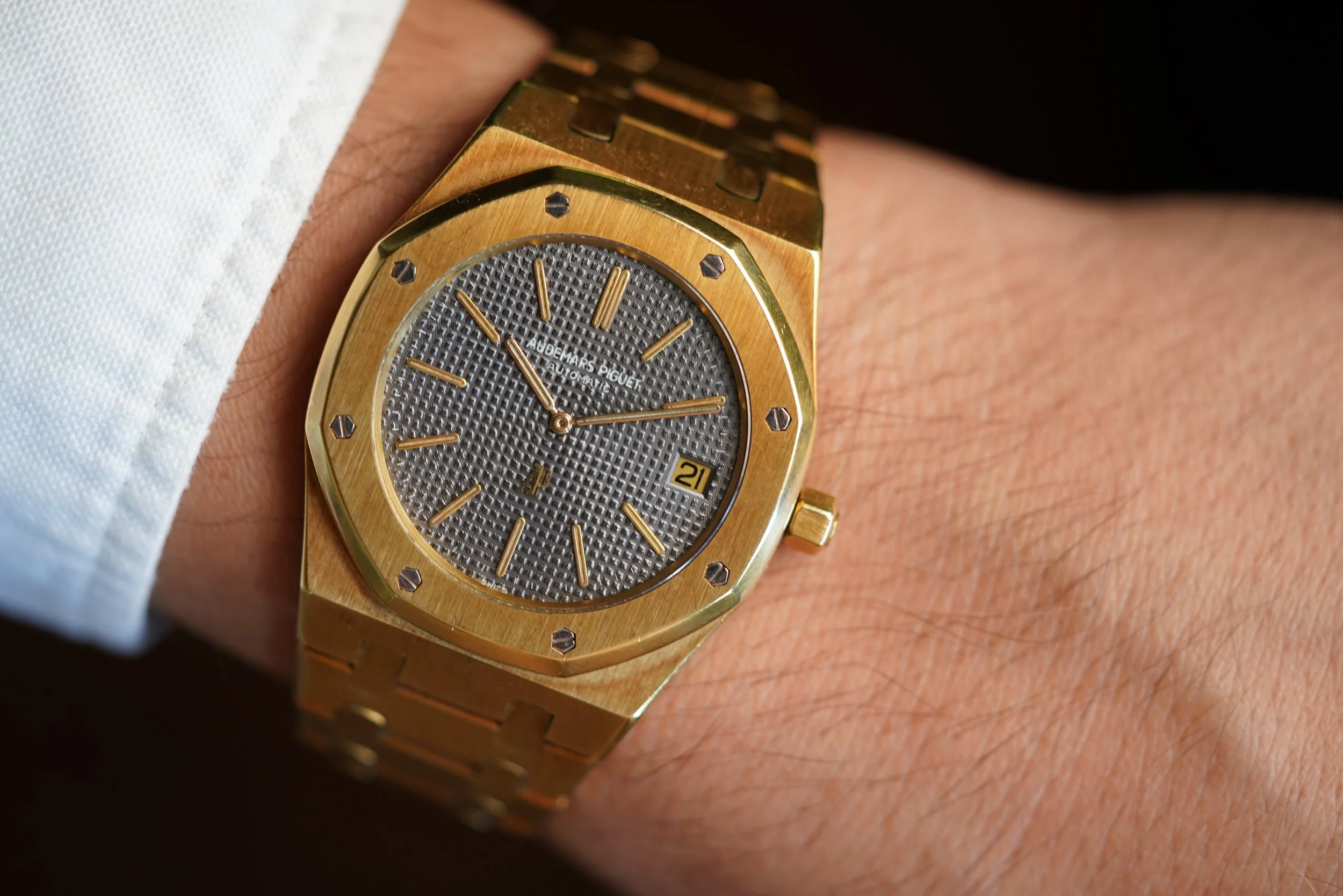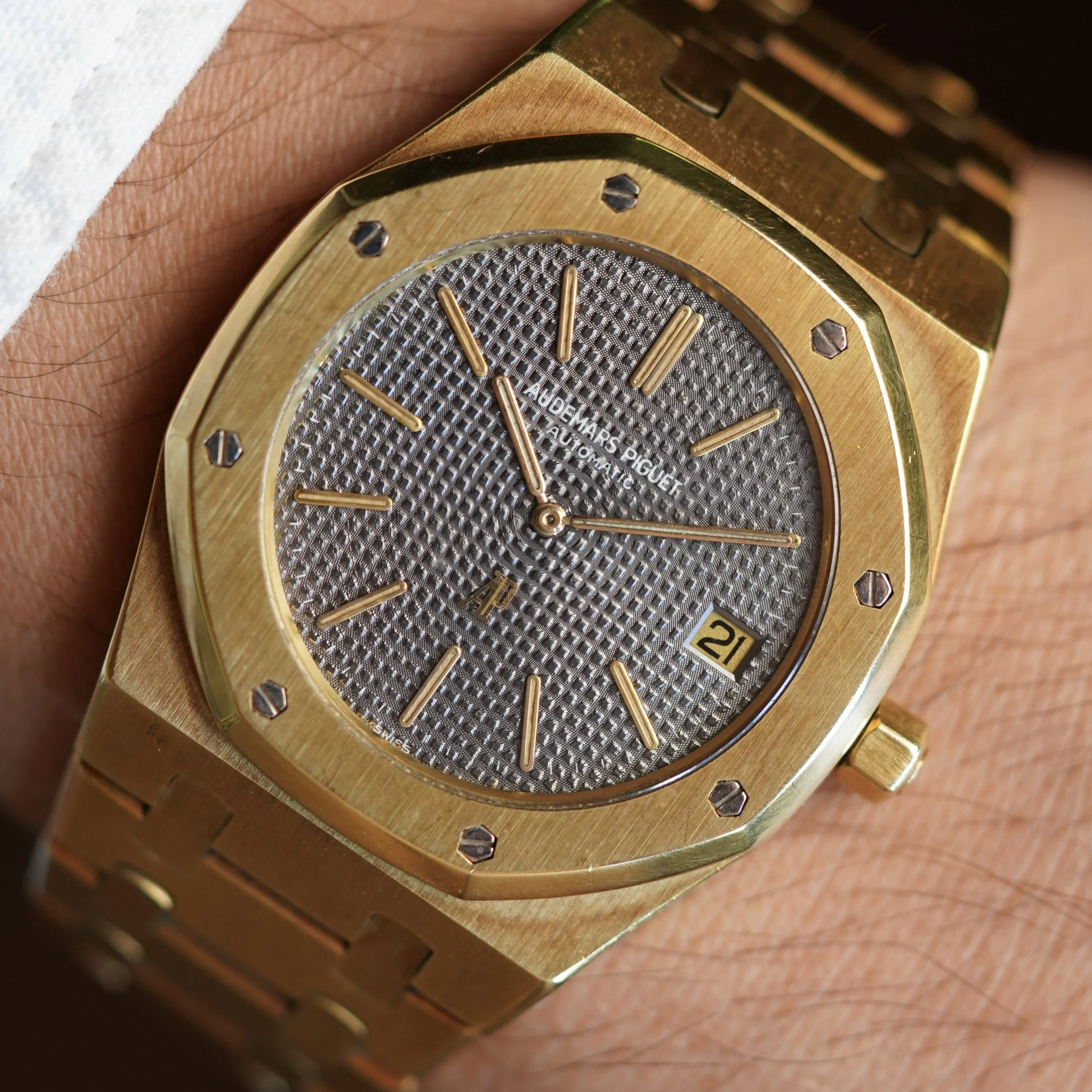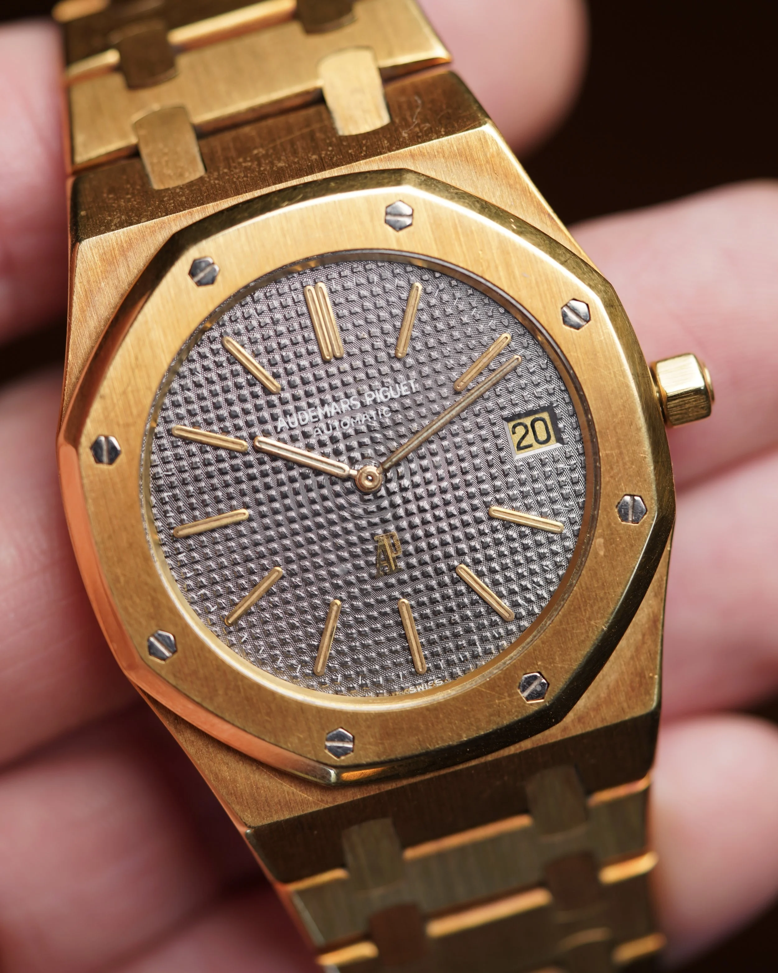 The origin of the species is the Royal Oak reference 5402ST - nicknamed the “Jumbo”. This example is a reference 5402BA and features an 18k yellow gold case and bracelet. The gold iteration was initially released in 1977, and approximately 736 examples of the reference were sold until 1990.