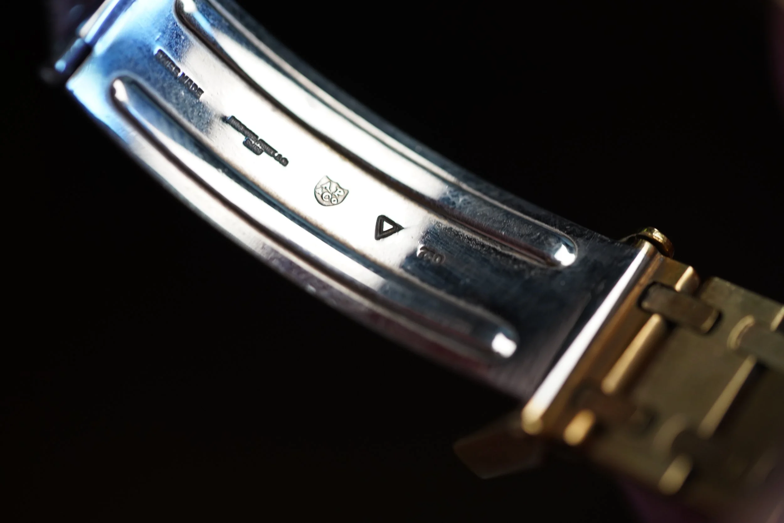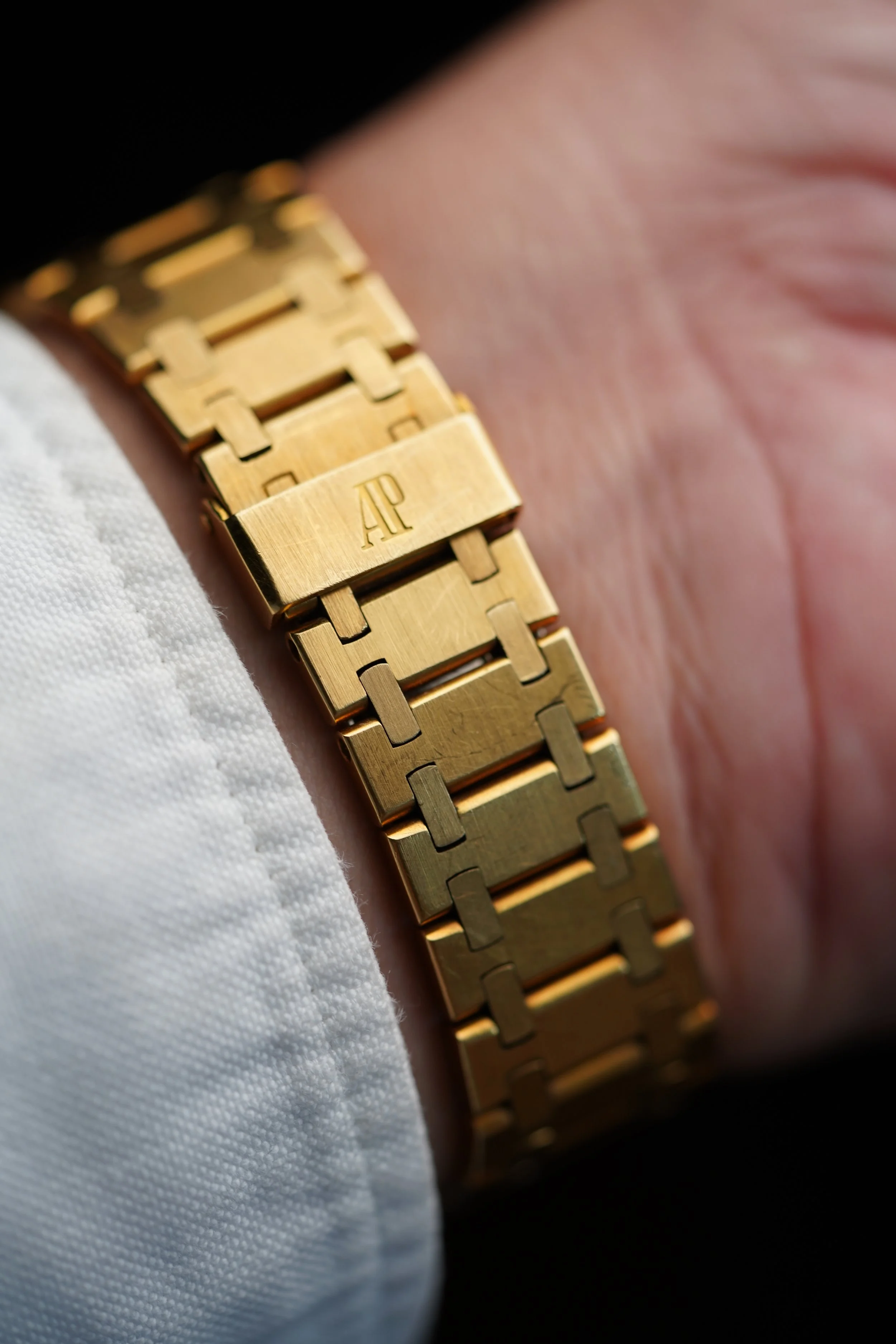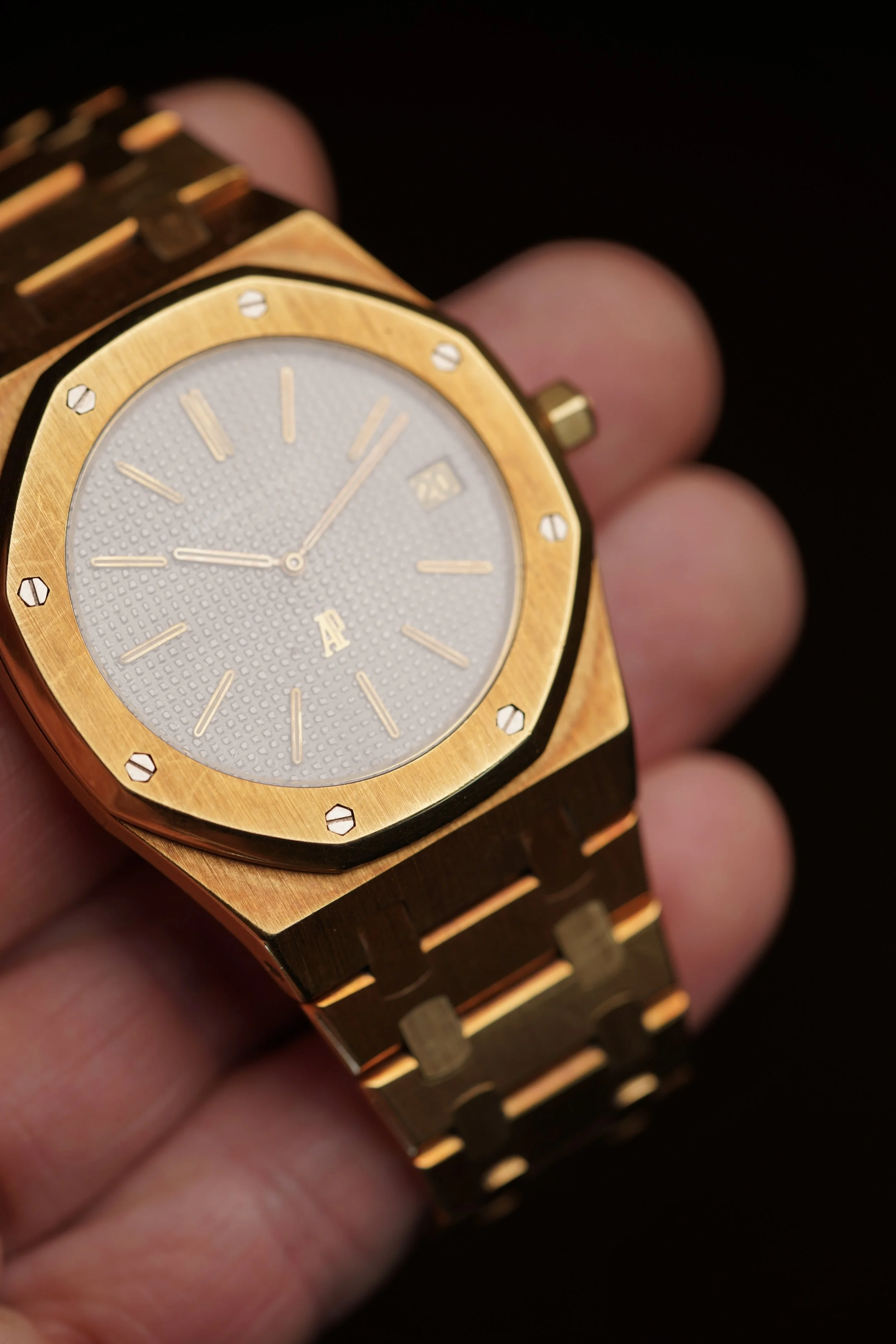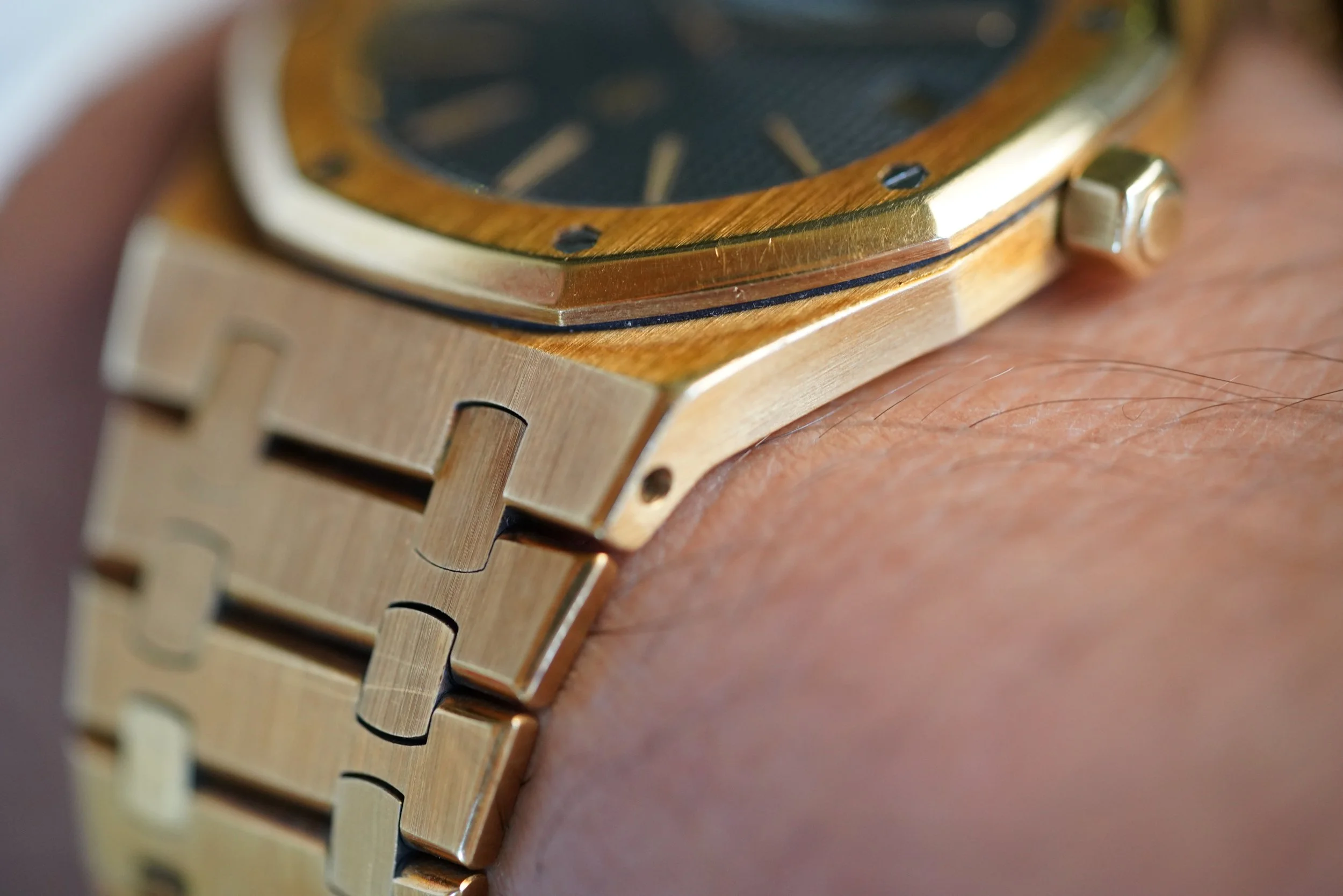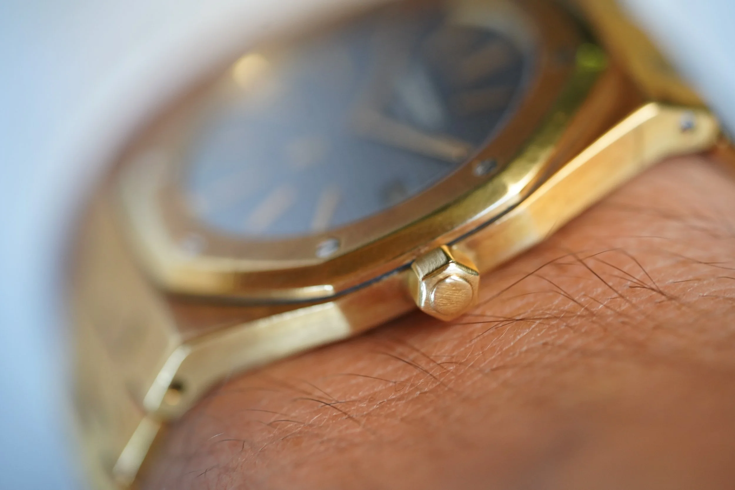 The origin of the species is the Royal Oak reference 5402ST - nicknamed the “Jumbo”. This example is a reference 5402BA and features an 18k yellow gold case and bracelet. The gold iteration was initially released in 1977, and approximately 736 examples of the reference were sold until 1990.
