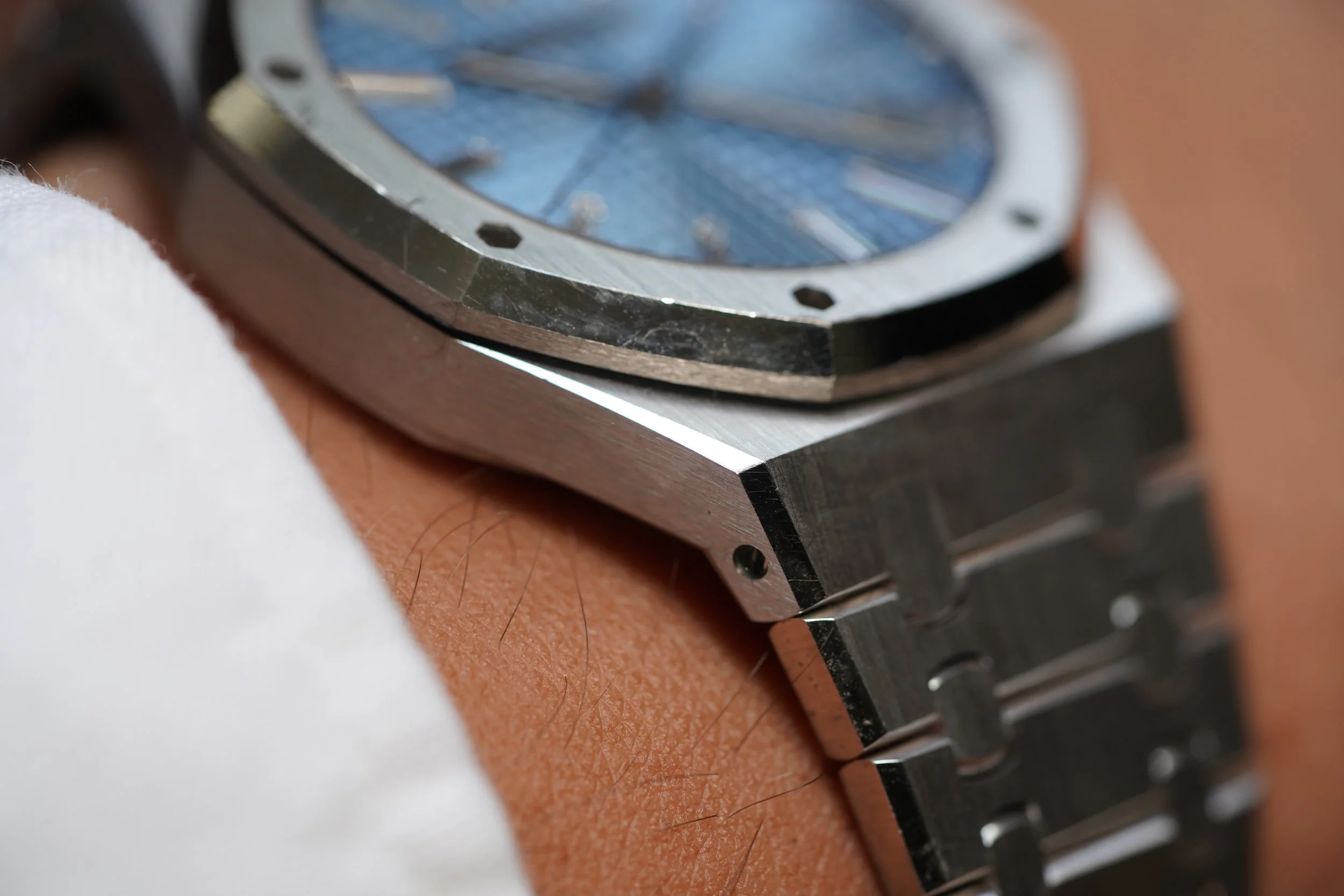 This Audemers Piguet Royal Oak reference 15510BC is in white gold. The case measures 41mm in diameter. The dial is a very special with a light blue “Grande Tapisserie” pattern, baguette-cut diamond hour-markers. Only 100 examples were produced. The case has signs of wear, but is unpolished.