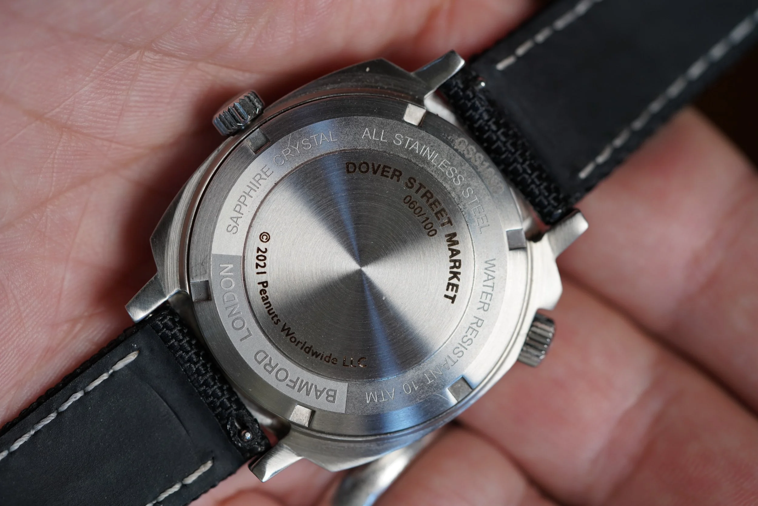 This collaboration between Bamford London and Dover Street Market produced a Snoopy GMT in a limited edition series of 100 pieces. This example is number 60. The movement is the automatic Sellita SW330-2. Upon its initial release, this watch retailed for around $2,195. Both Bamford and Dover Street Market have signed the dial.