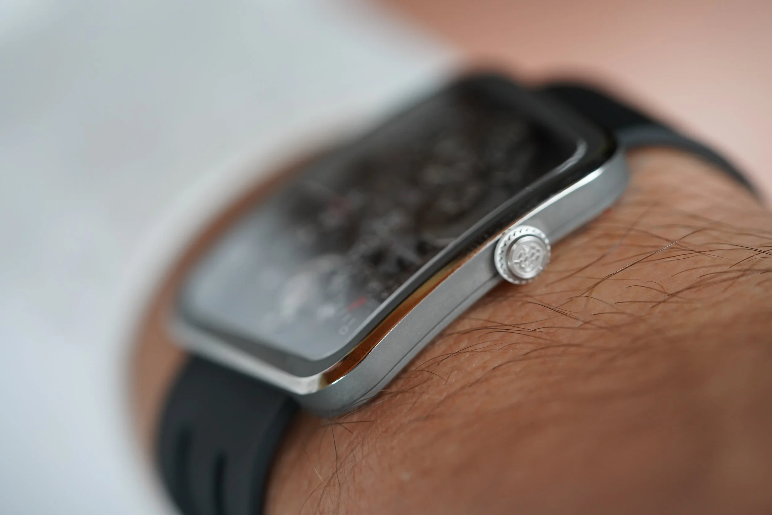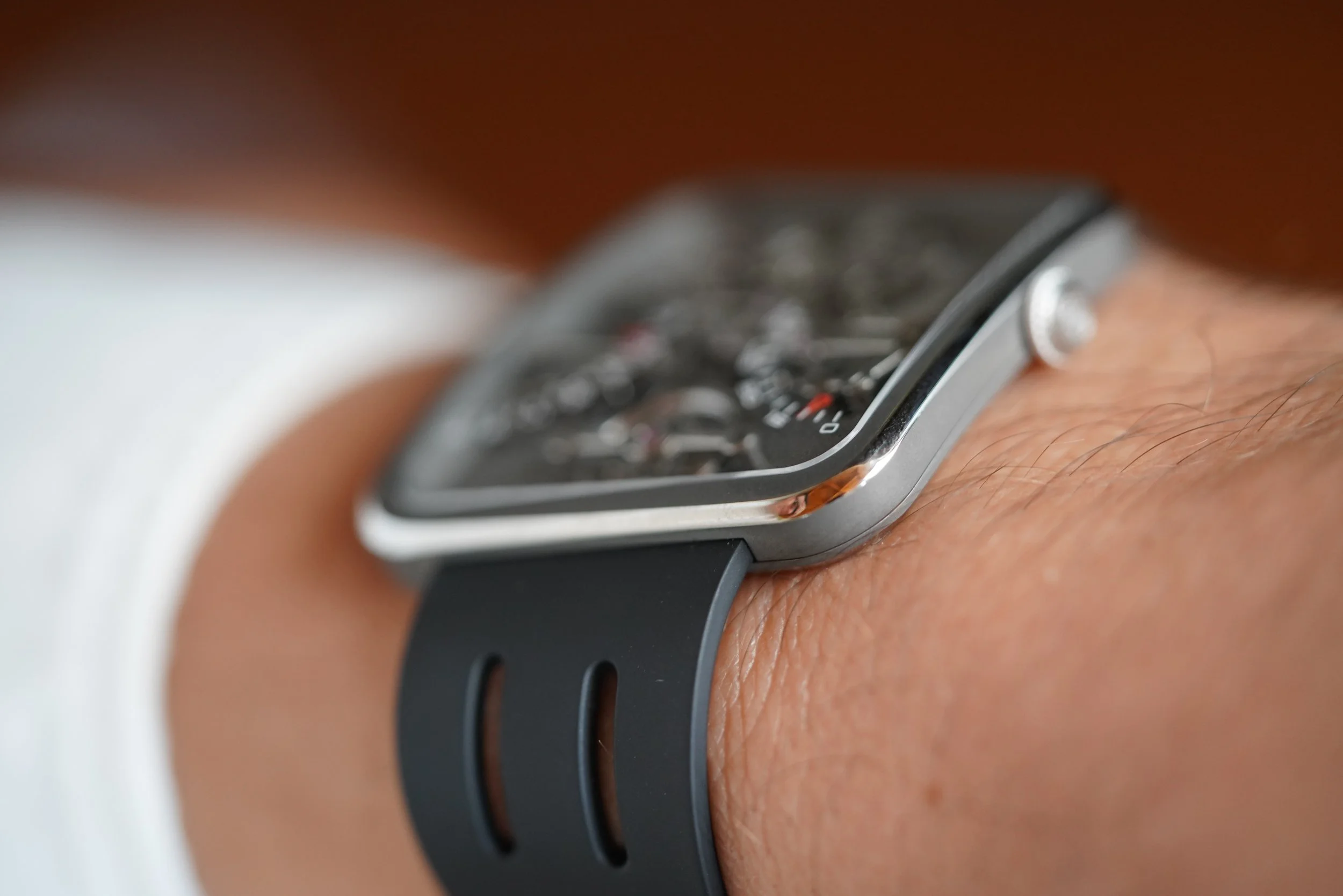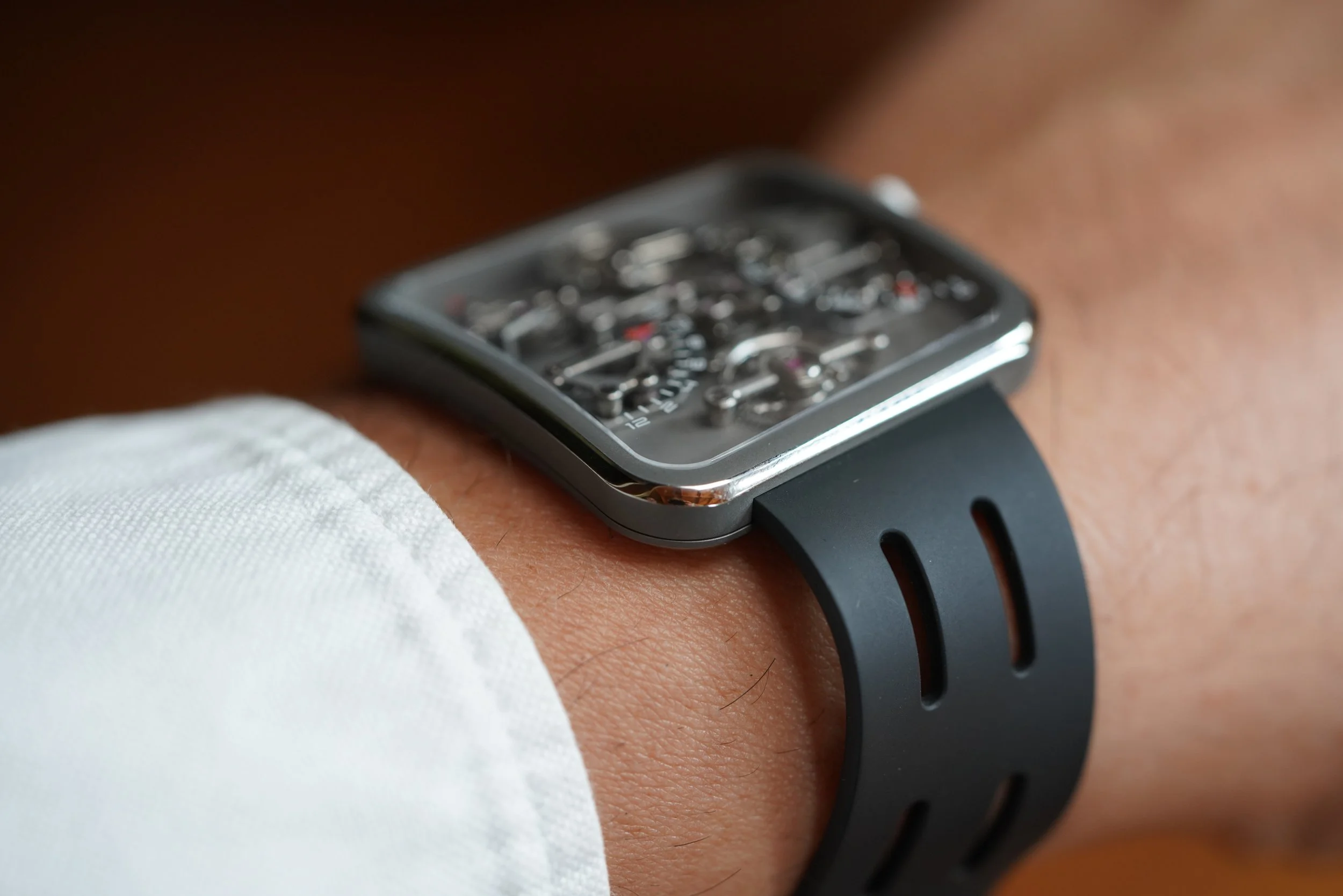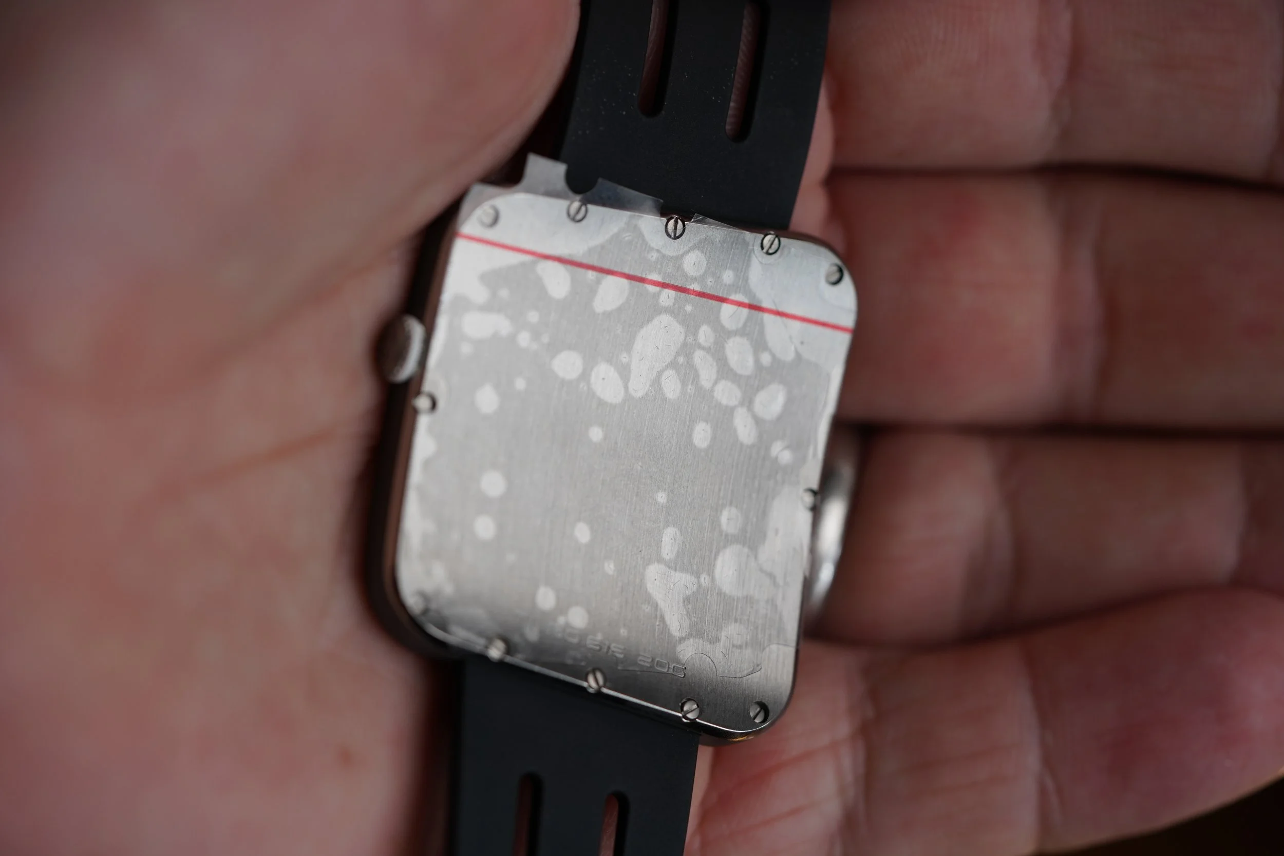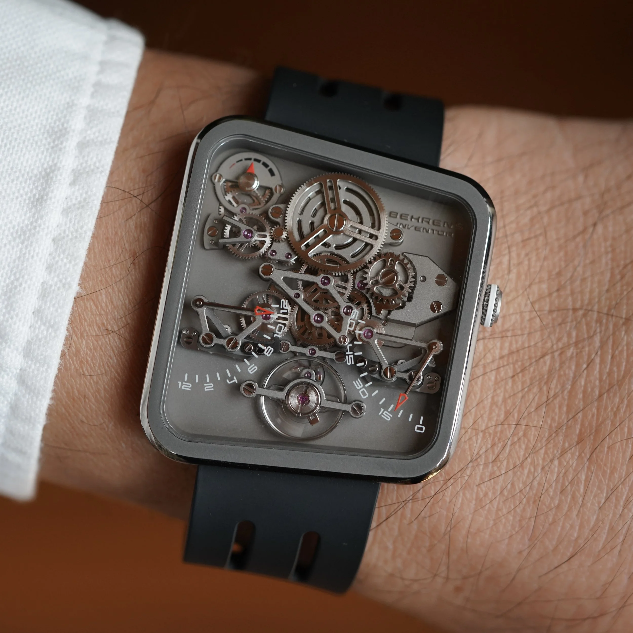 This Behrens Inventor reference BHR030 is an ultra light 20g watch with an openworked dial and power reserve. The oblique style case measures roughly 38 x 42.5mm and is made of titanium. The watch features a sapphire crystal and BM02 base movement. It comes with an integrated rubber strap and titanium pin buckle. It is in like new condition with the original caseback sticker.
