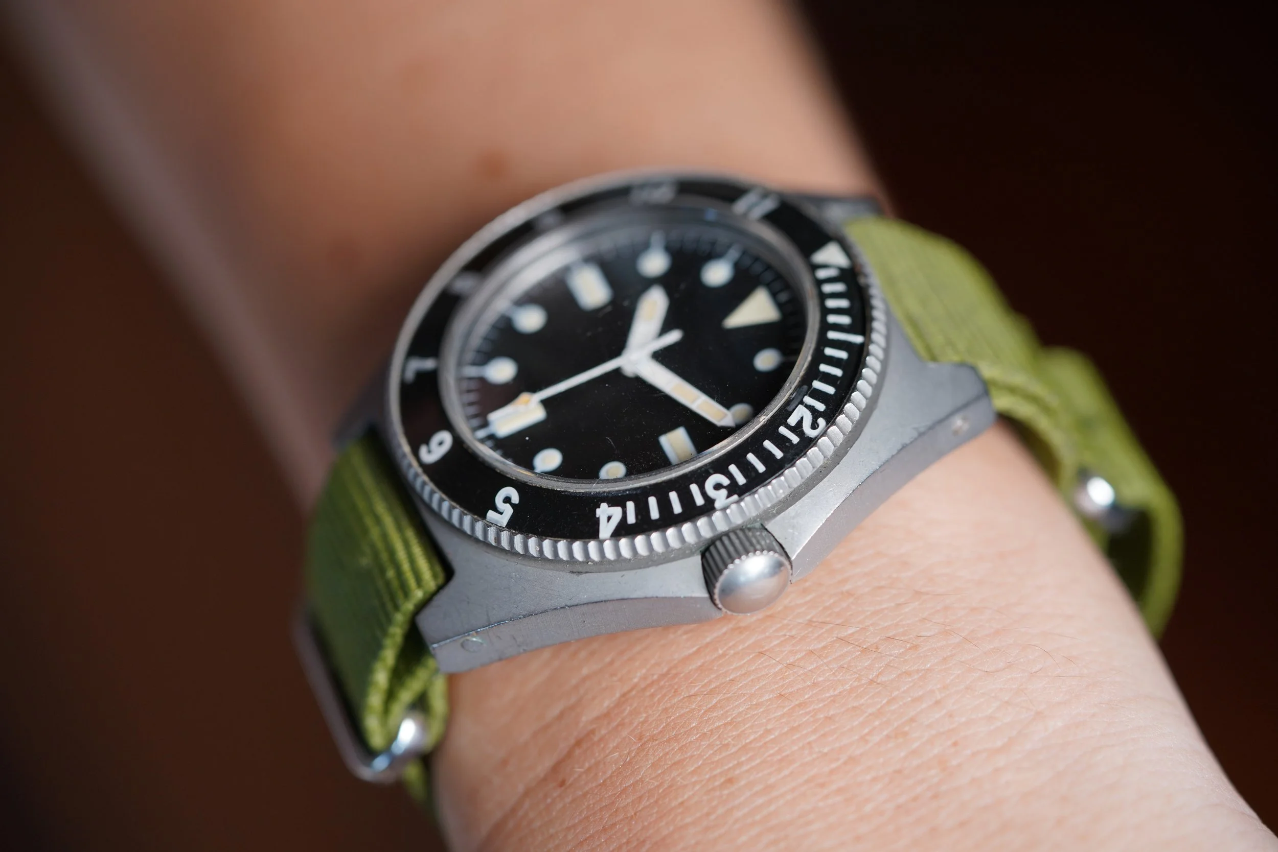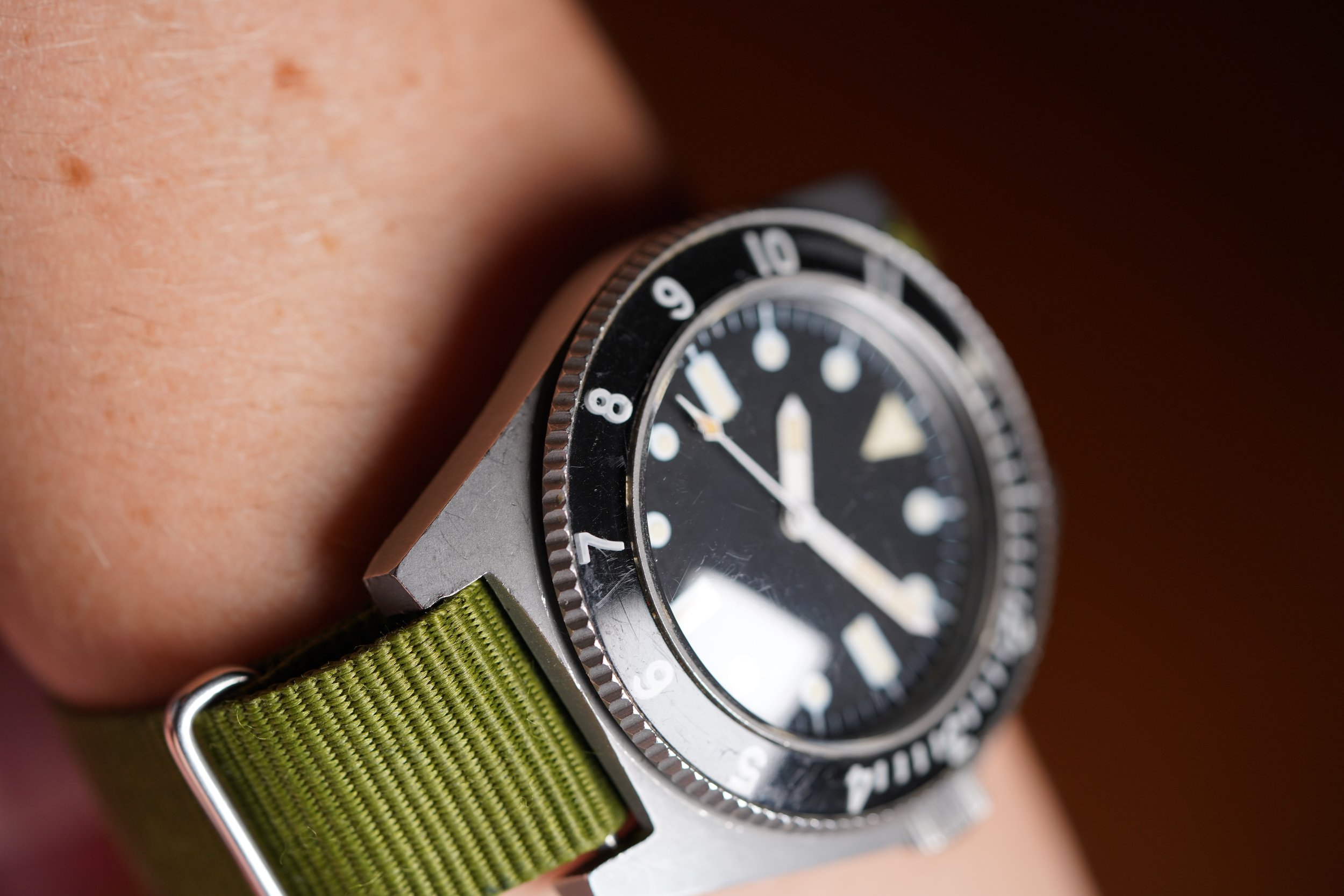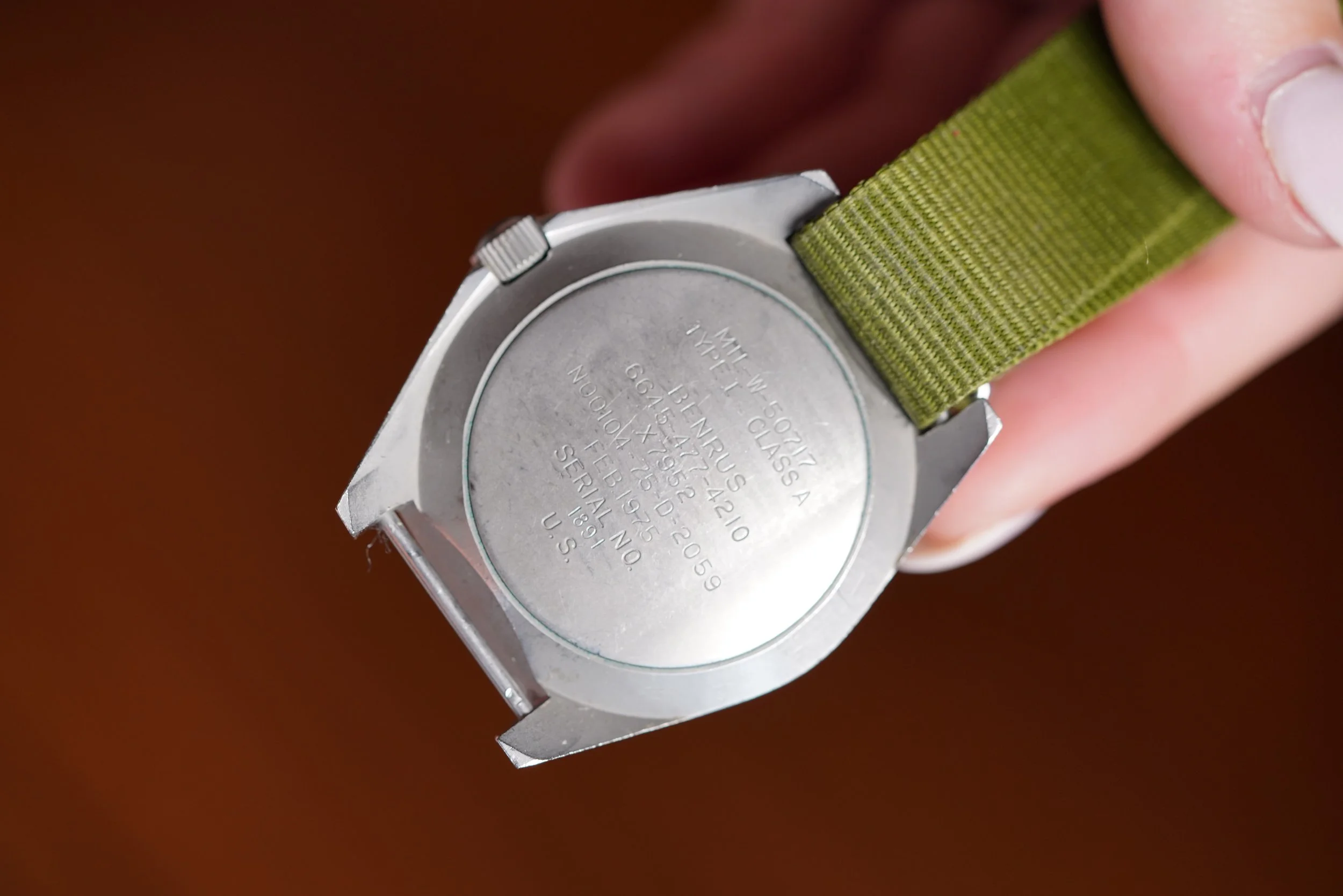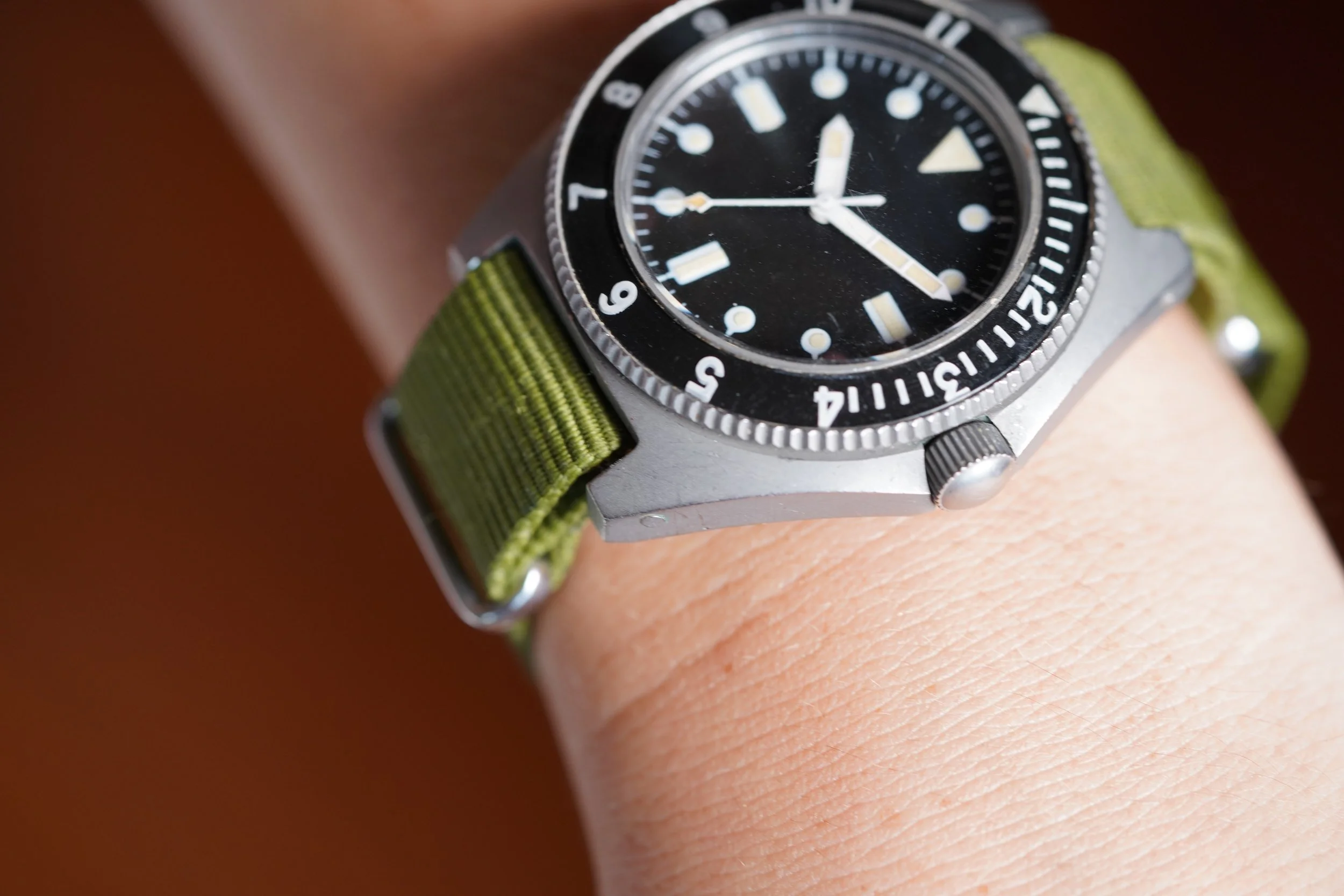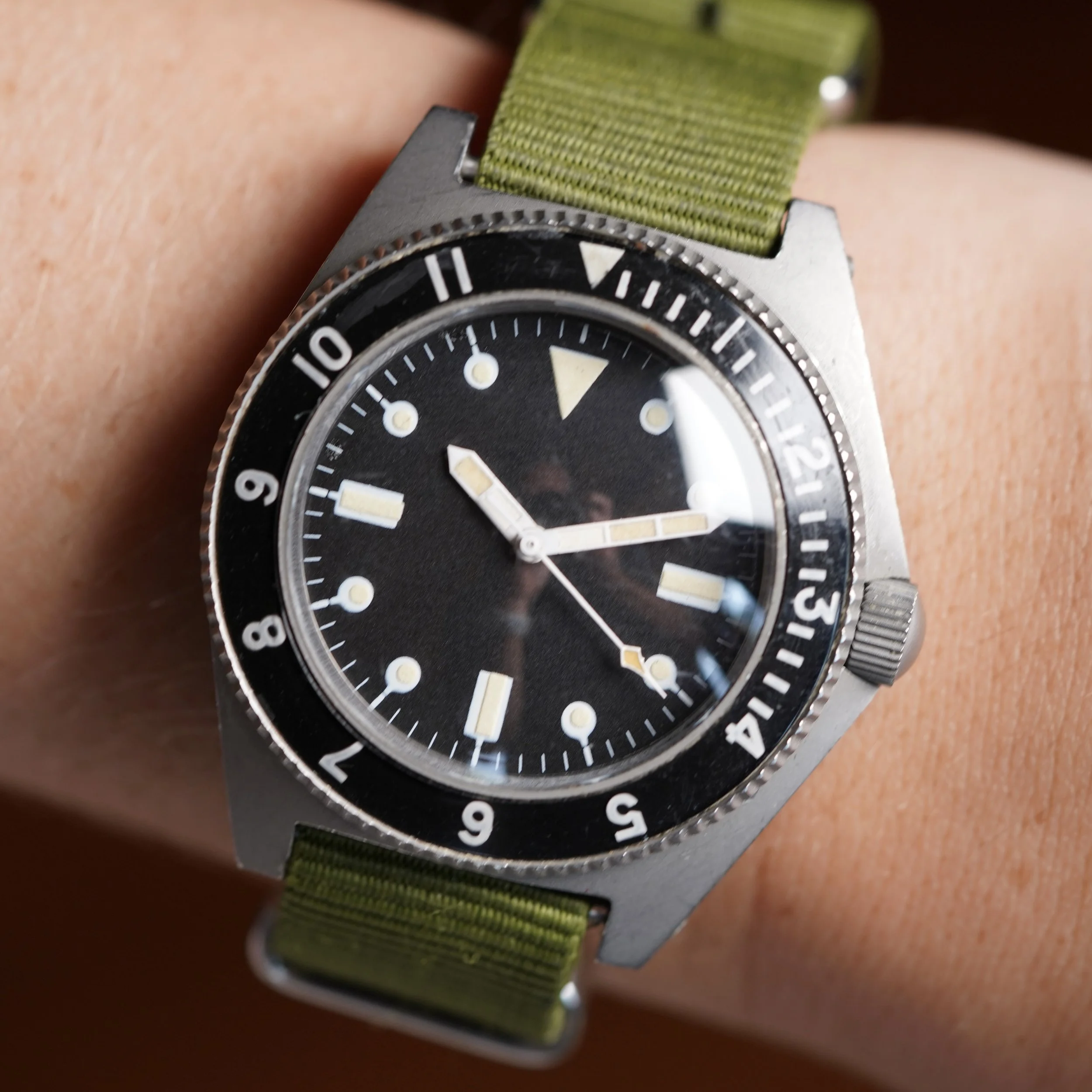 The Benrus Type I Class A wristwatch is one of the iconic US Military issued watches and is beginning to develop a cult following over the most recent years. The watch features fixed spring bars - the top fixed spring bar was replaced with a standard spring bar. The asymmetrical case remains unpolished (albeit a few scratches from its time in action). It measures at 43mm in diameter and 15mm in thickness.