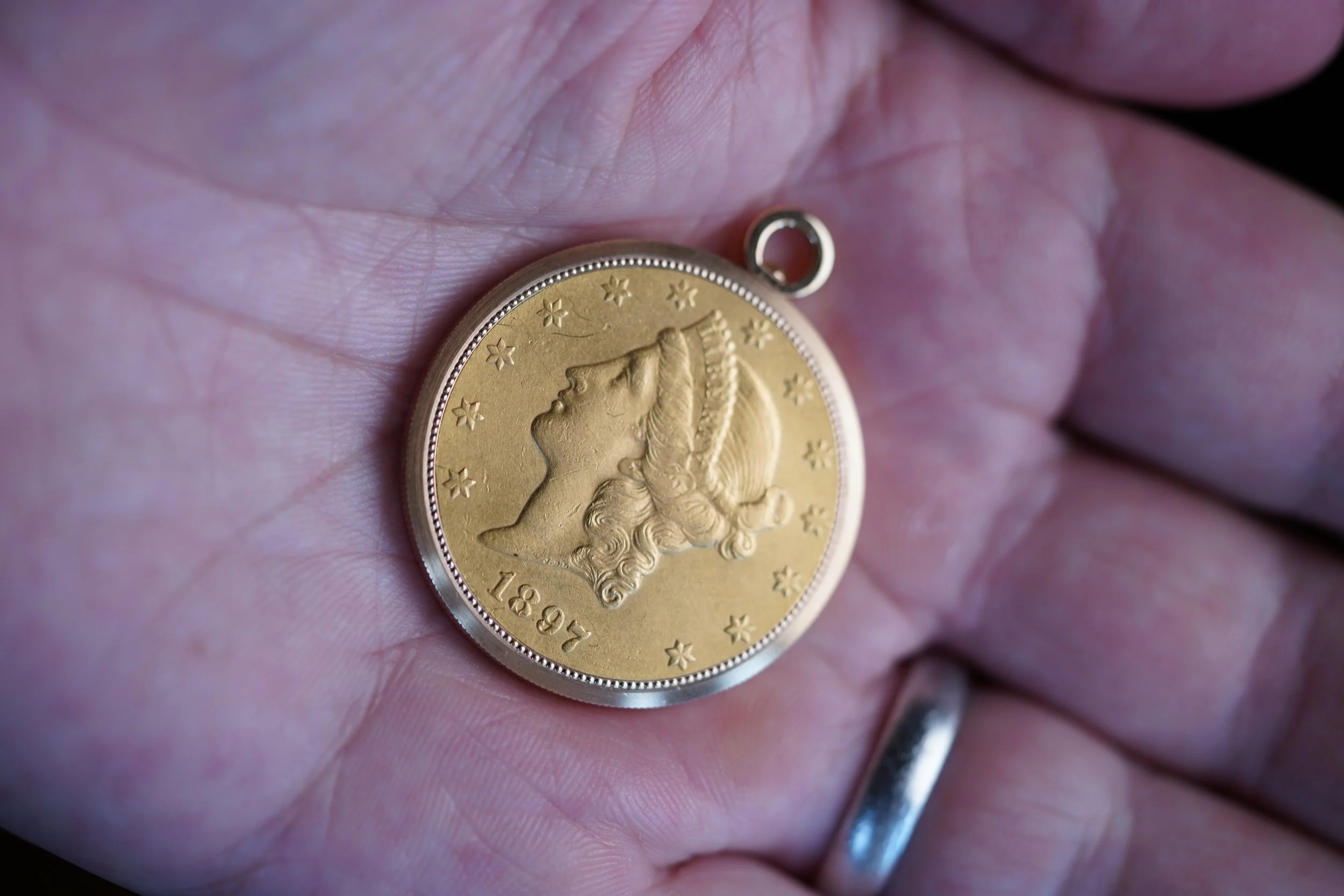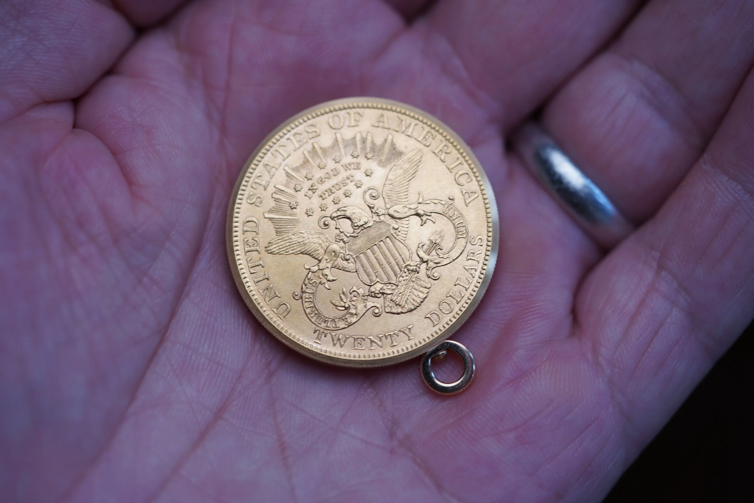 It is a cased in a beautiful $20 coin from 1907. This example features a bow, with the coin edge. It could be worn as a necklace.