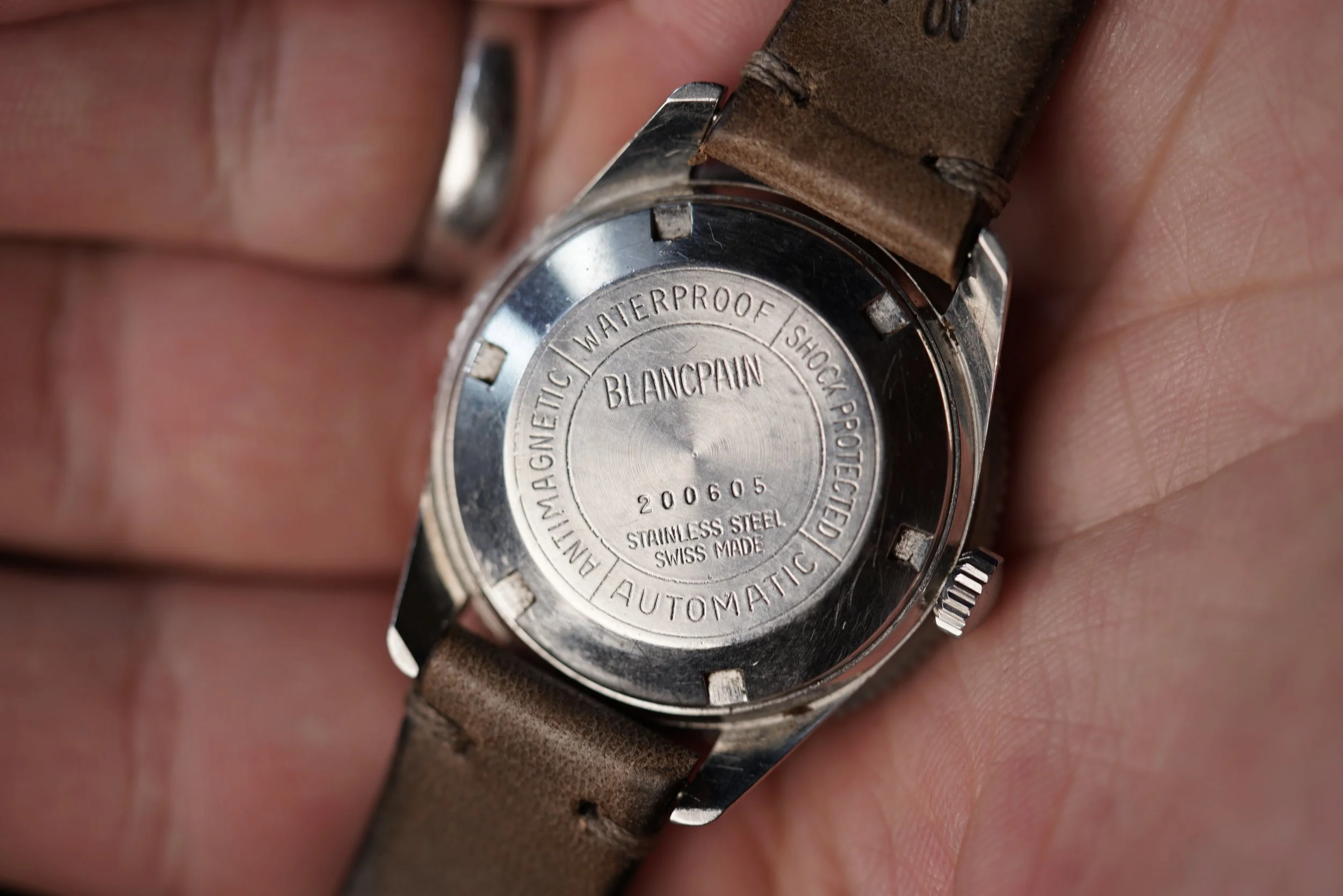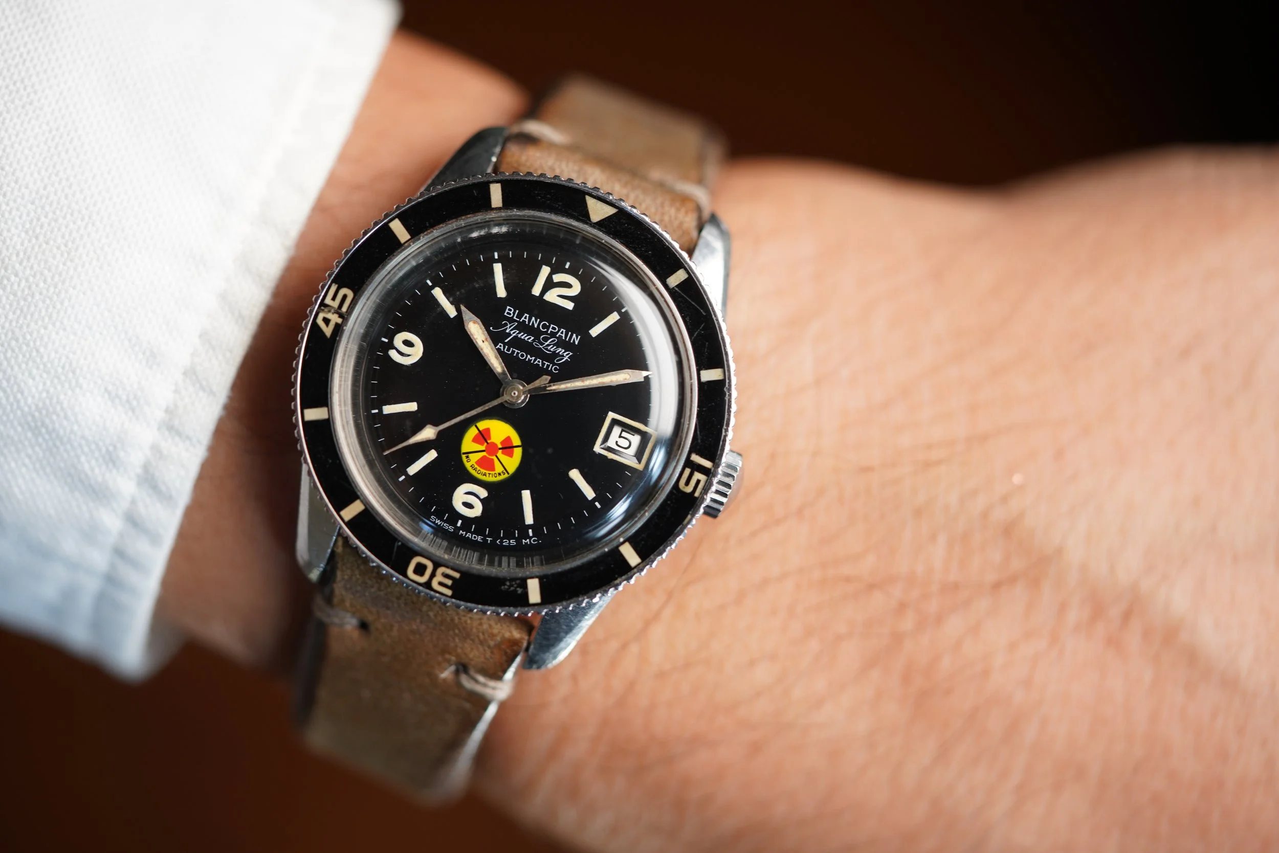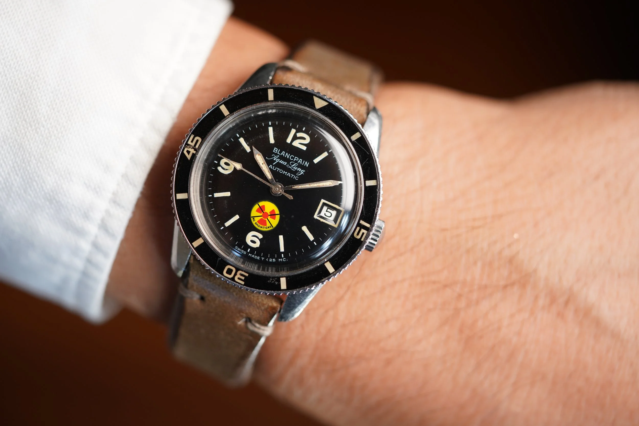 This Blancpain Aqua Lung automatic calendar is an extremely cool watch. The glossy dial features a “No Radiations” logo at 6 o’clock. The case measures 37mm in diameter and approximately 43mm lug-to-lug. The case appears to be unpolished.