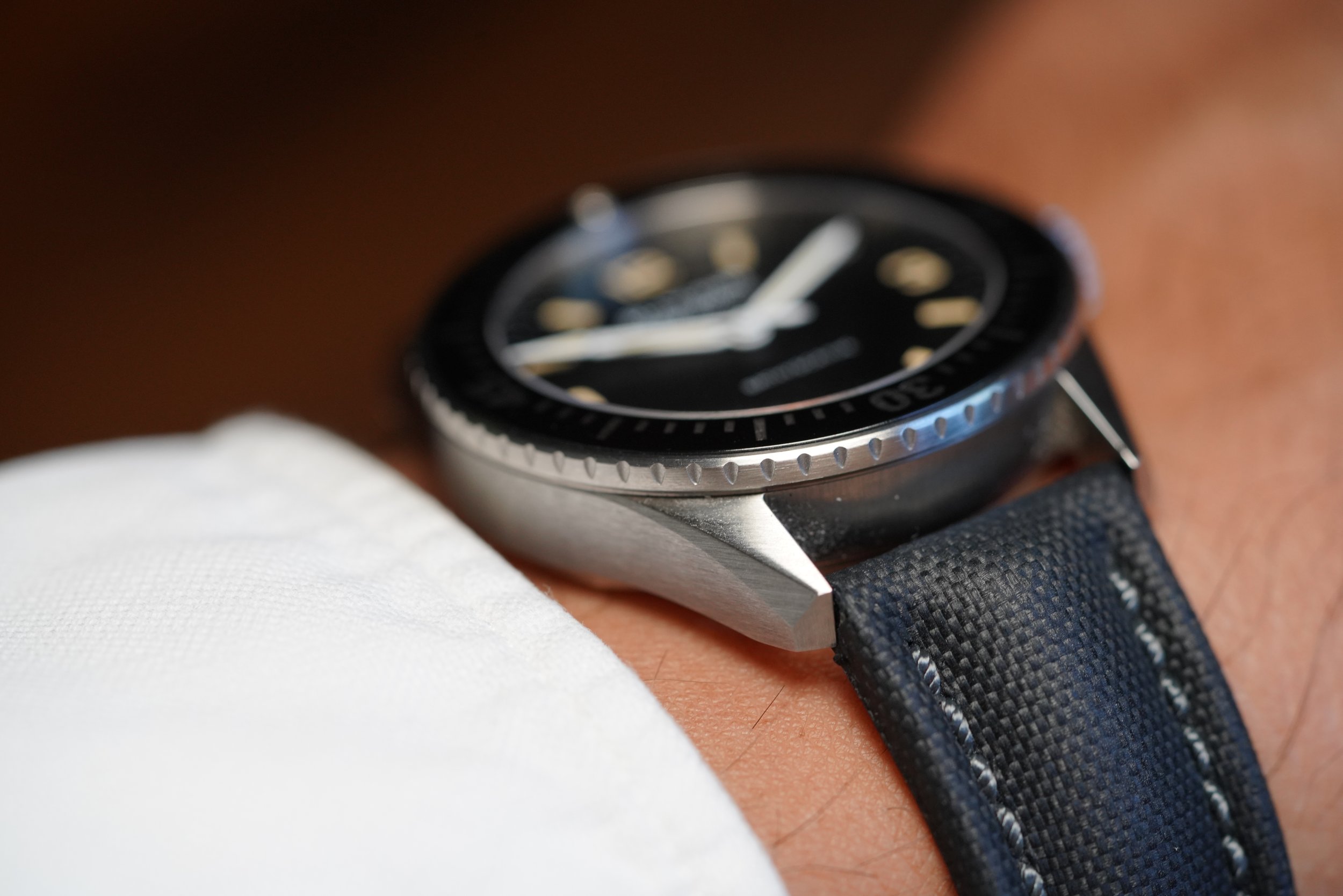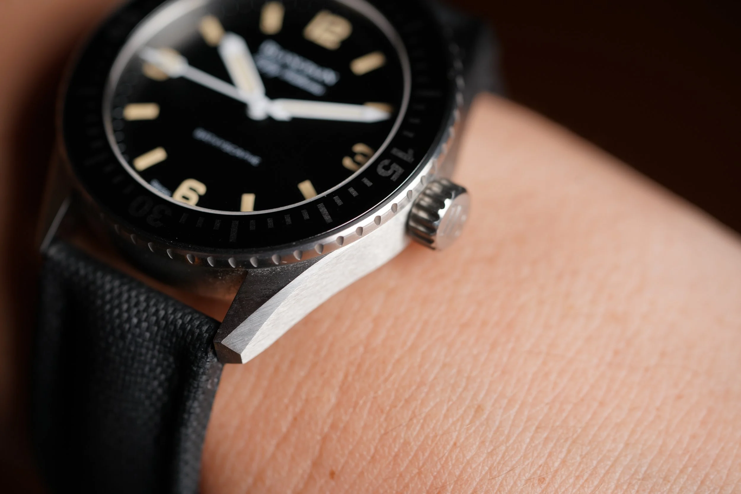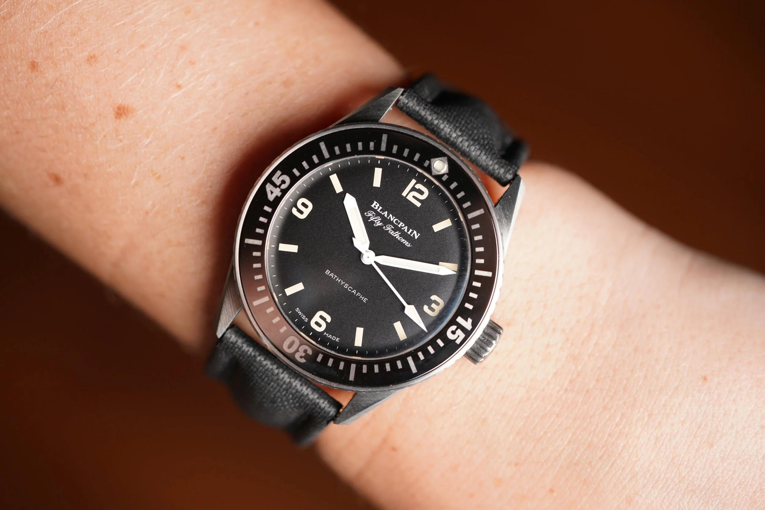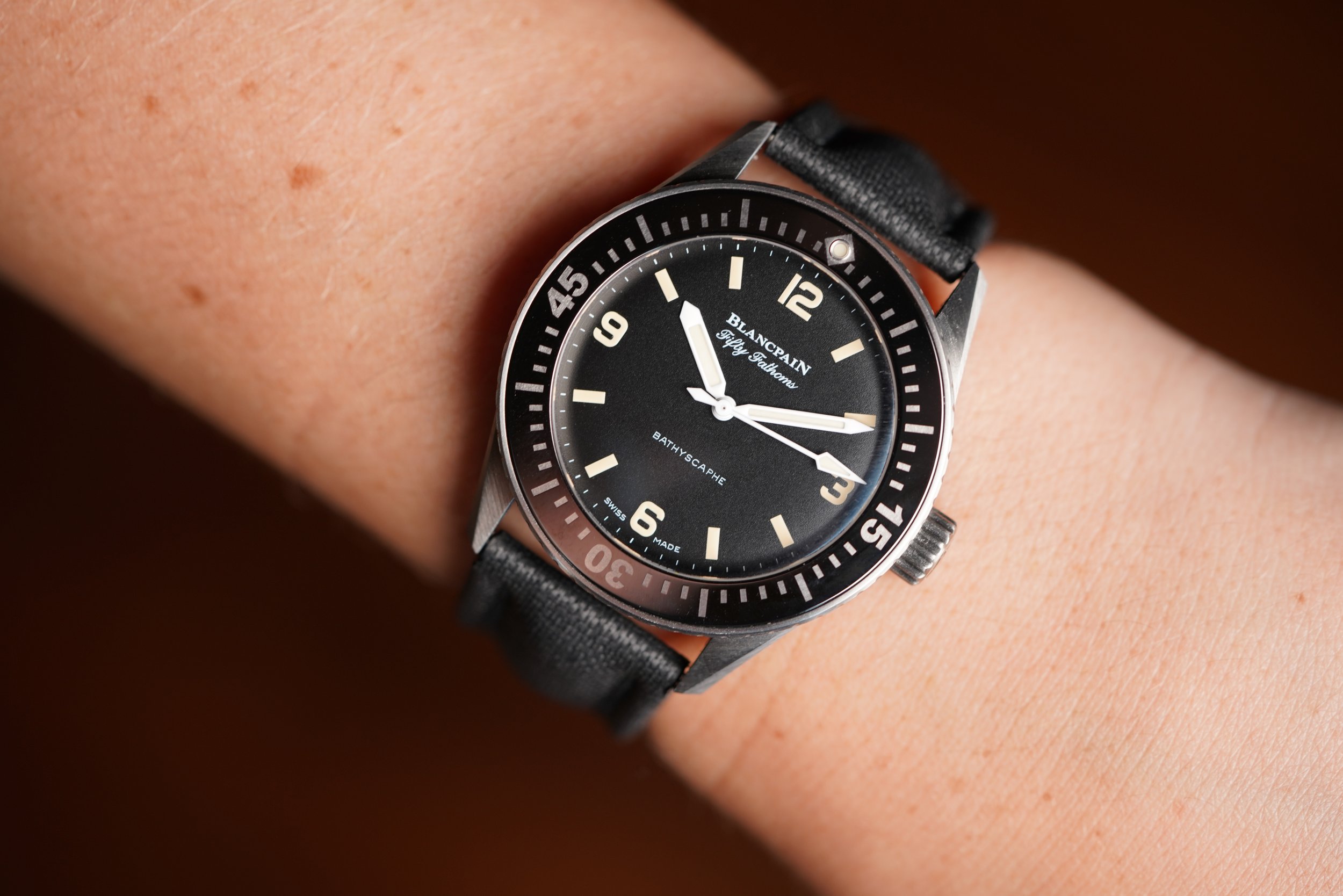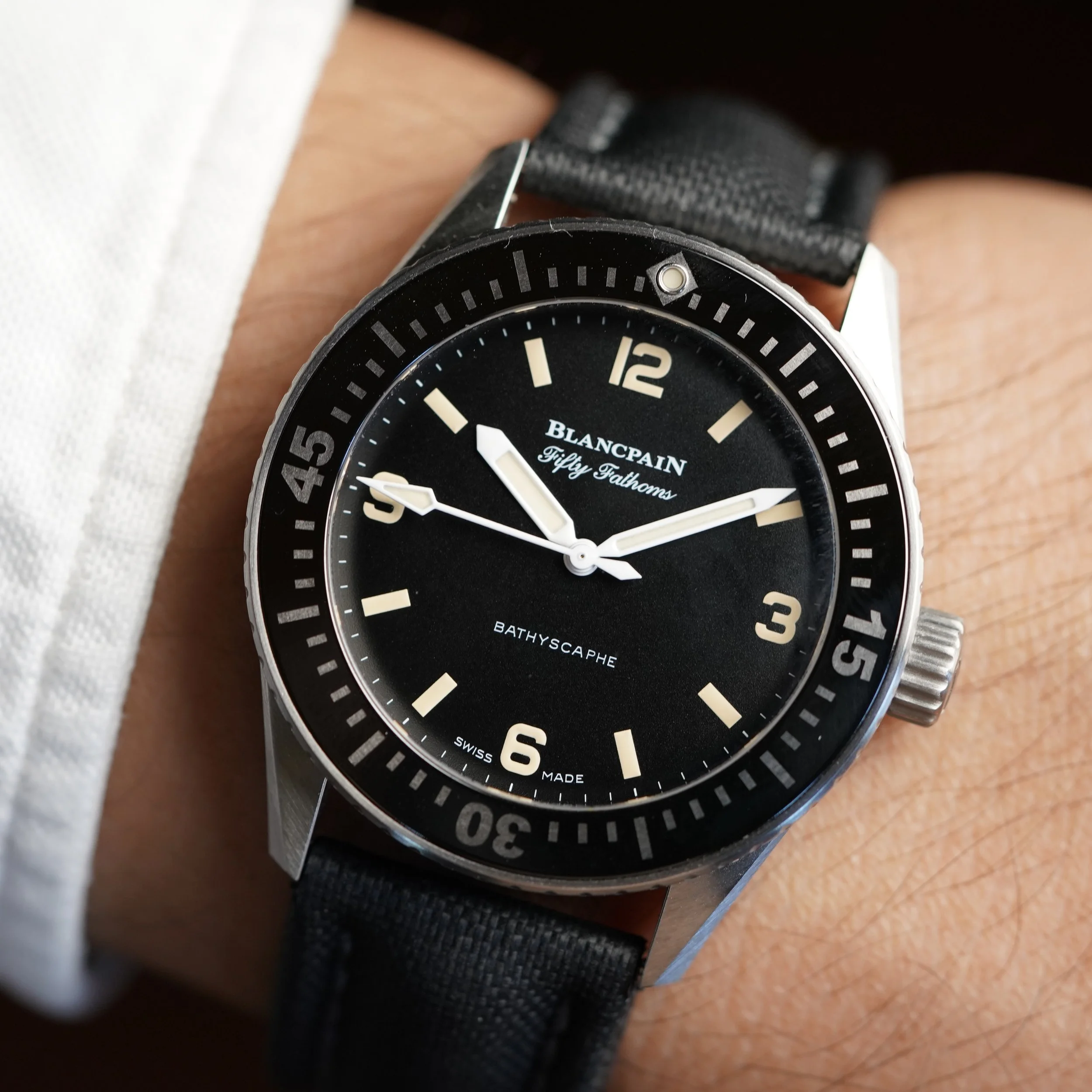 This Blancpain Fifty Fathoms Bathyscaphe is an extremely attractive dive watch. The case measures 38mm in diameter. It appears unpolished and in great condition. These are highly admired by collectors and is one of the better HODINKEE limited editions. It was produced in only 100 examples numbered examples and this number 99.