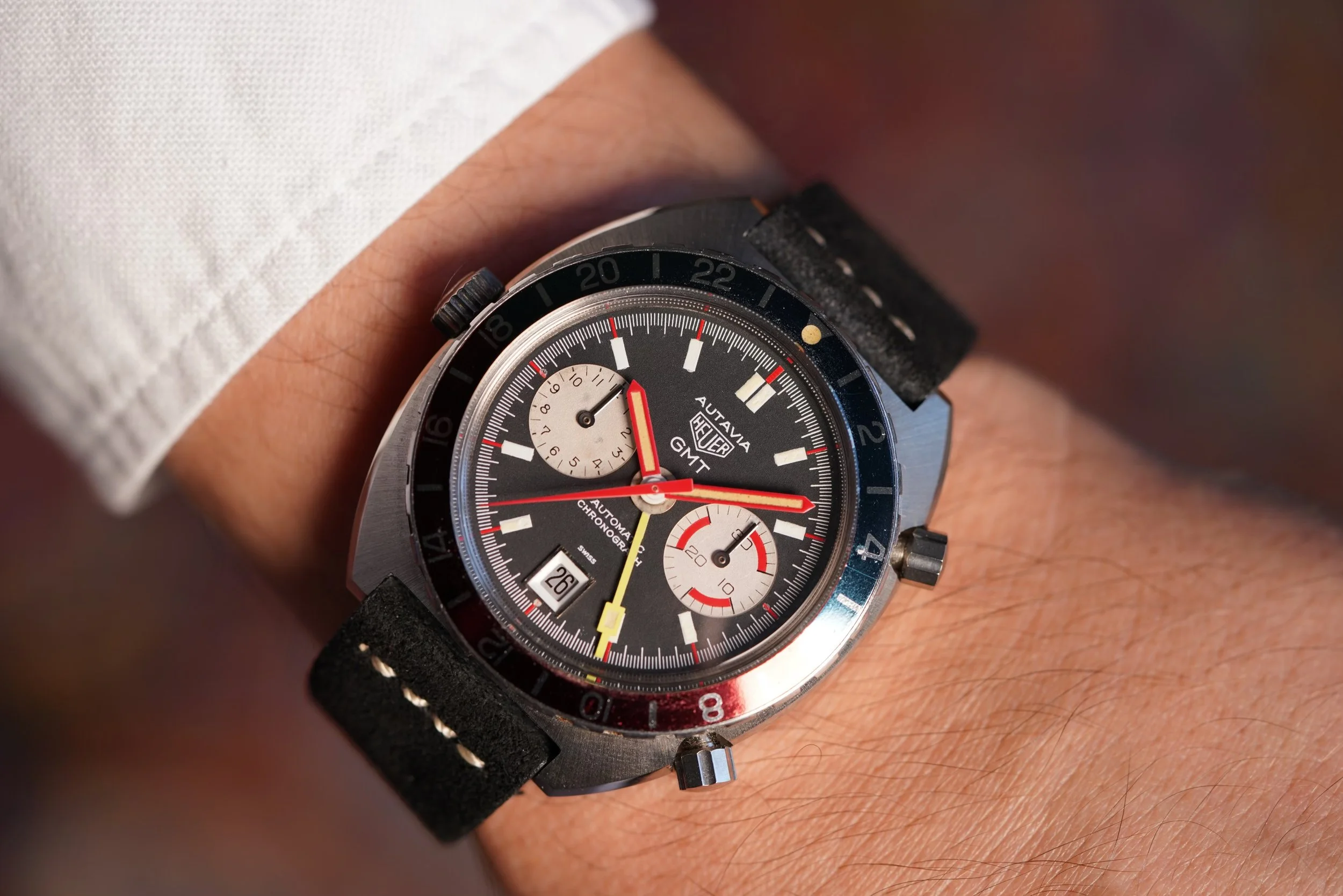 In my opinion, the Heuer Autavias are some of the best buys in vintage watches. They feature very large cases which are very enjoyable on the wrist. This example features an unpolished case which measures 43mm in diameter (47mm lug-to-lug). The dial is in fantastic condition and the hands give off a brilliant overall look. The watch is paired on a Heuer strap with a signed Heuer buckle.