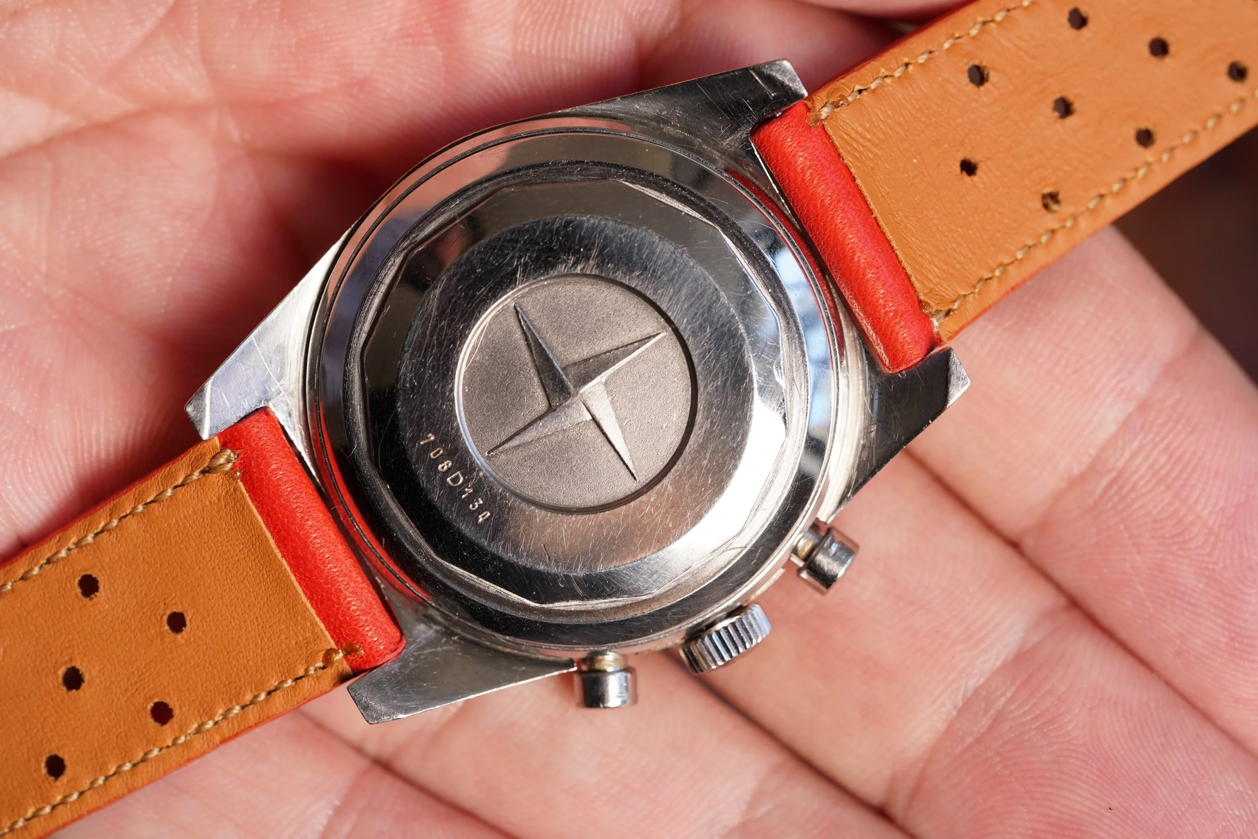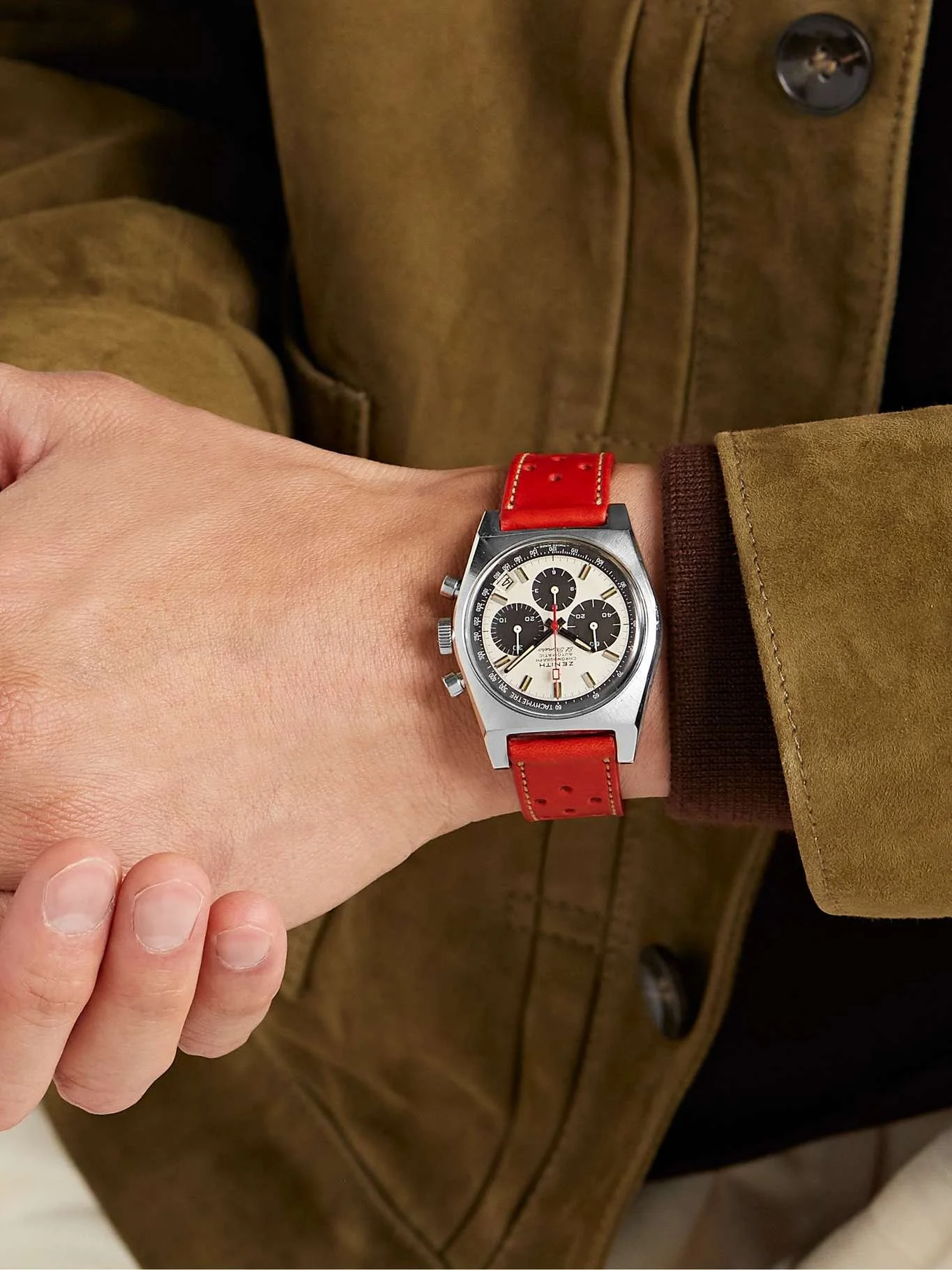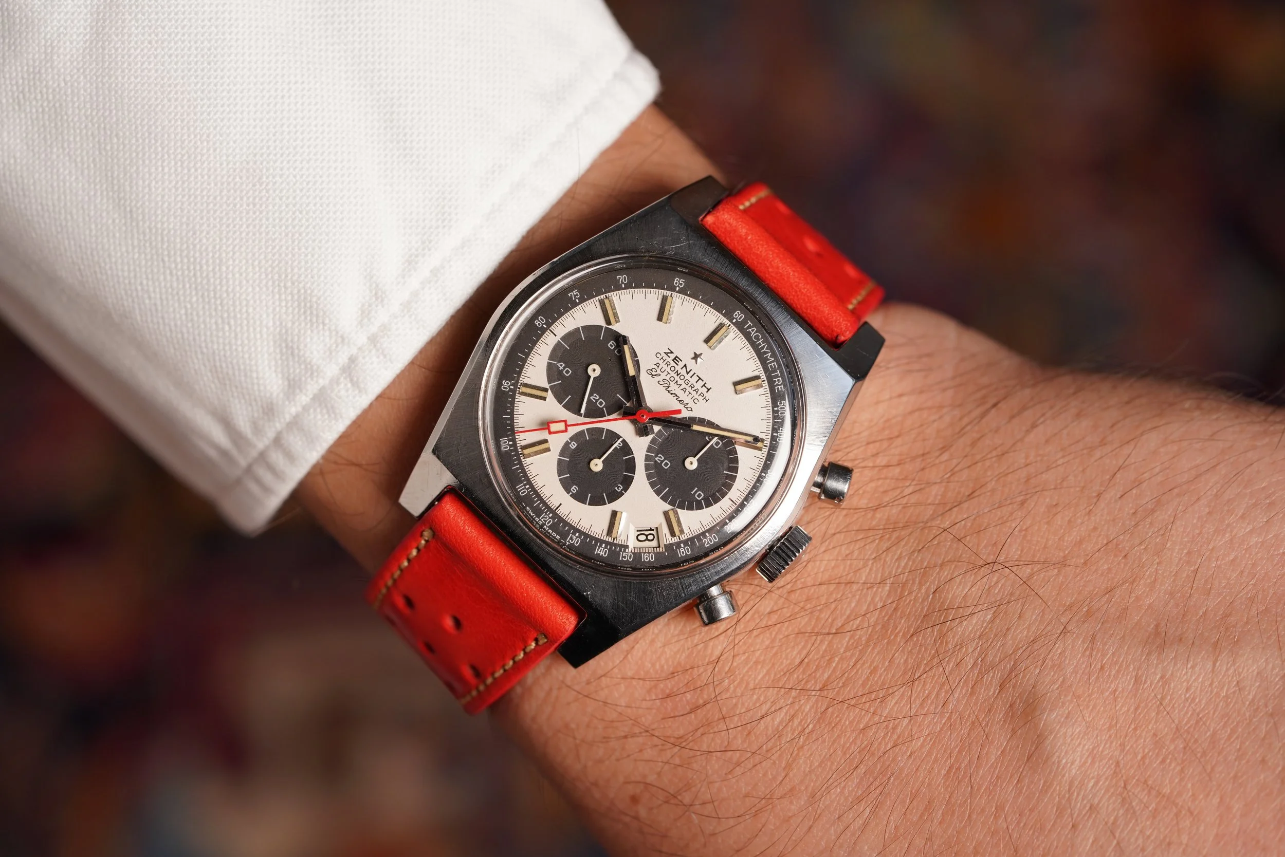 Introduced in 1969, the Zenith El Primero remains one of the most beloved chronographs in watchmaking. This particular model dates to 1970 and is powered by the automatic high-beat calibre 3019, and features the exciting red chronograph hand which matches the vibrant rally strap.