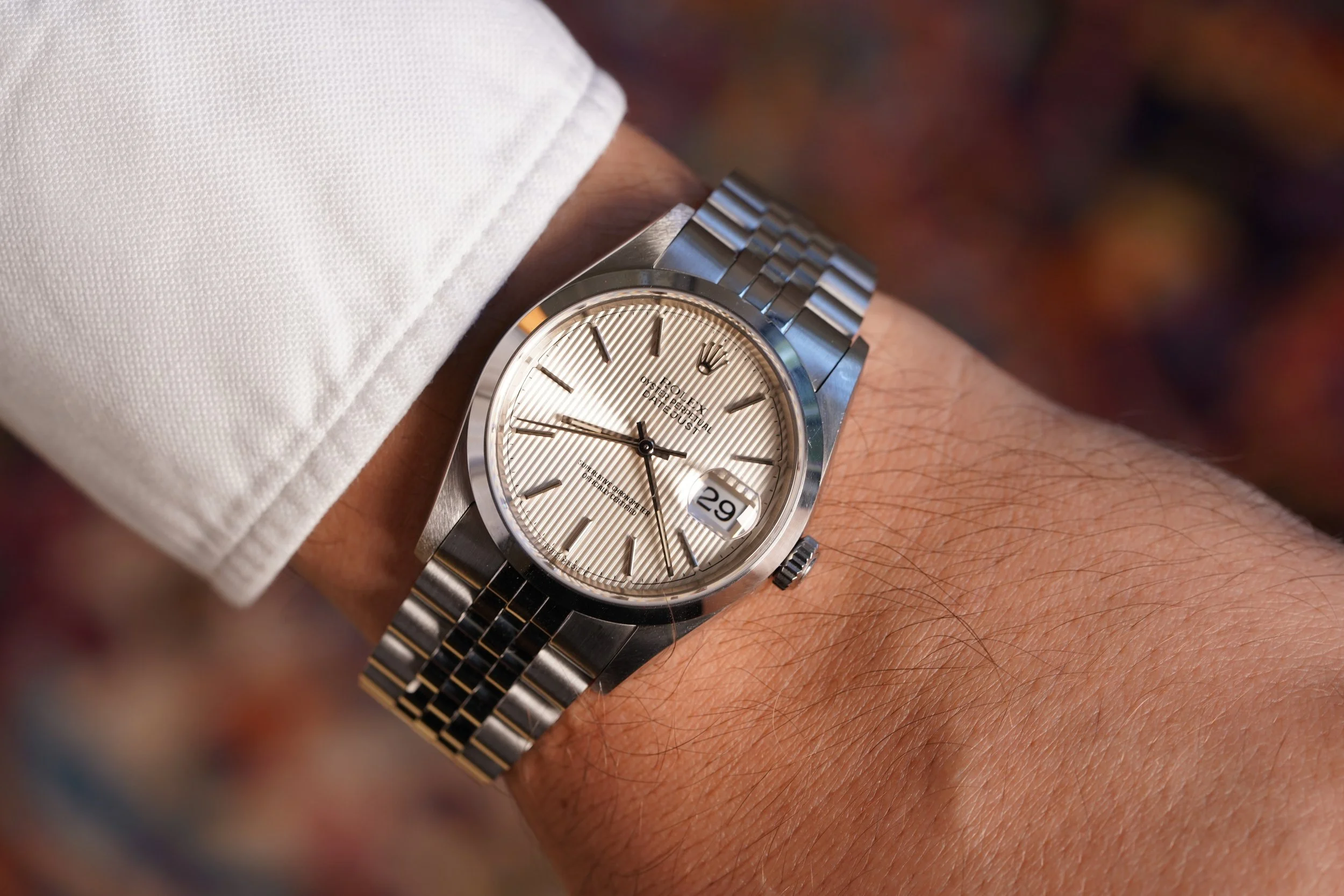 This Rolex Datejust reference 16200 dates to 1997. The watch has remained stored away over the past 25 years, and is in "New Old Stock" maintaining the original caseback sticker. It is paired on a steel Rolex Jubilee bracelet that has a nice firm feel on the wrist. The dial is an incredible-white tapestry dial. It has an automatic movement (Caliber 3035 made by Rolex), and is 36mm in diameter. The watch comes “full-set” with the original box and papers.