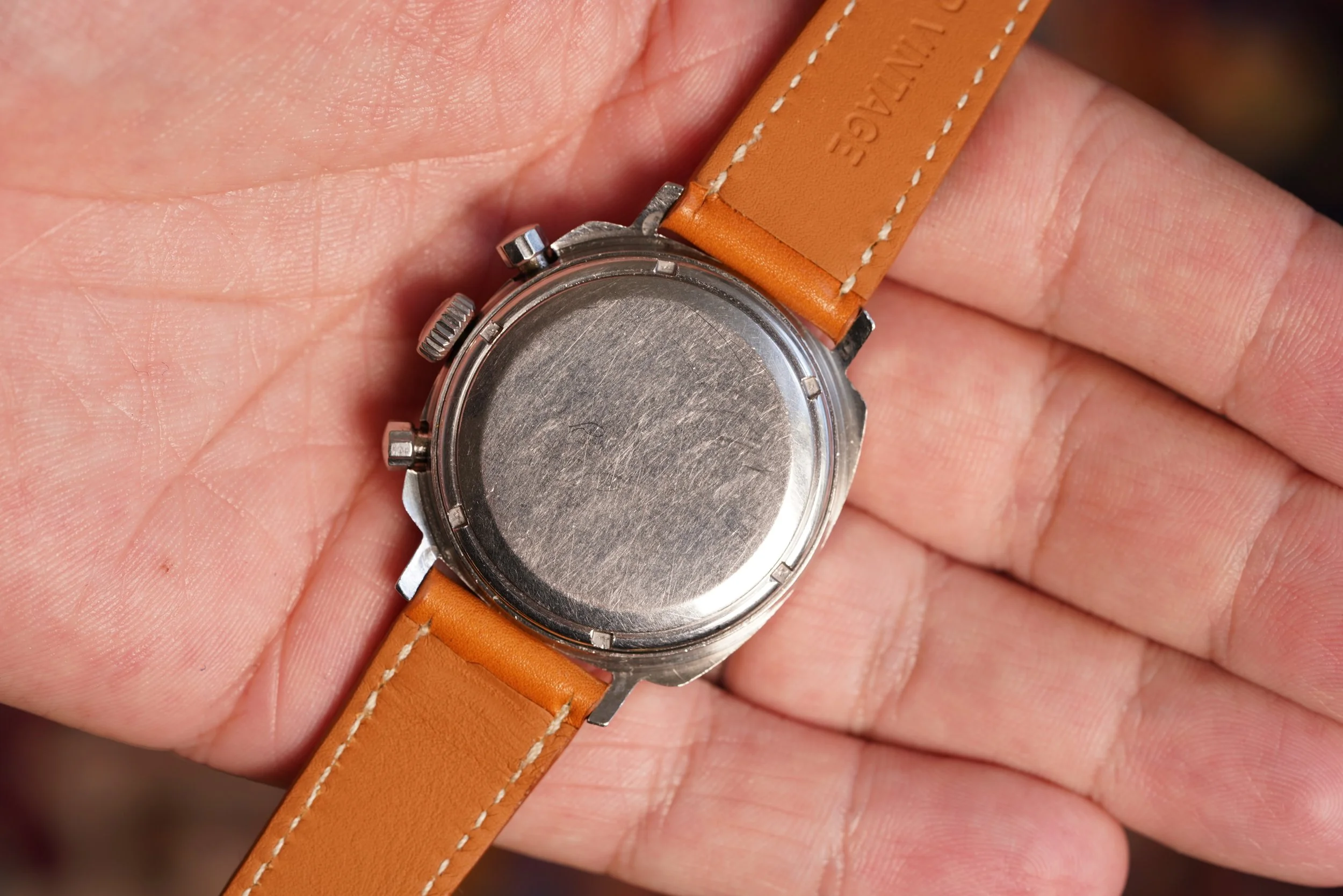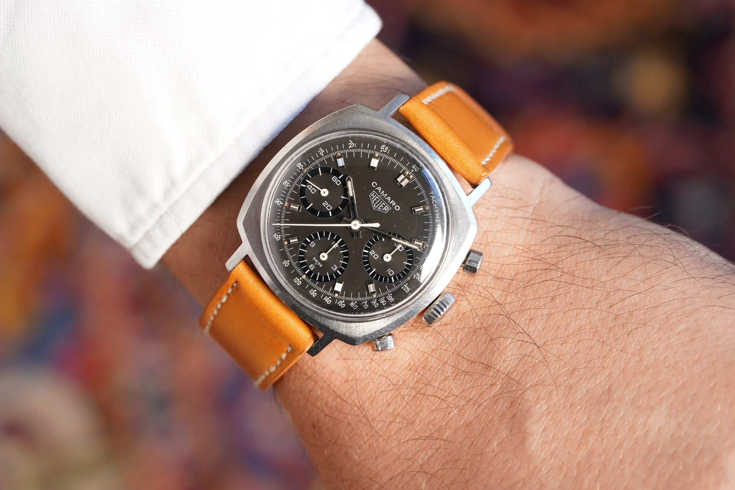 The Heuer Camaro remains one of the underrated Heuer chronographs. The atypical cushion-shaped case has seen a new wave of appreciation as Heuer collecting has become more prominent. The dial has developed a slight tropical appearance since its life began in 1969. In addition to the sunburst finish on the bezel, the thick, faceted hour markers are incredible in the natural light. The movement is the iconic Valjoux 72.