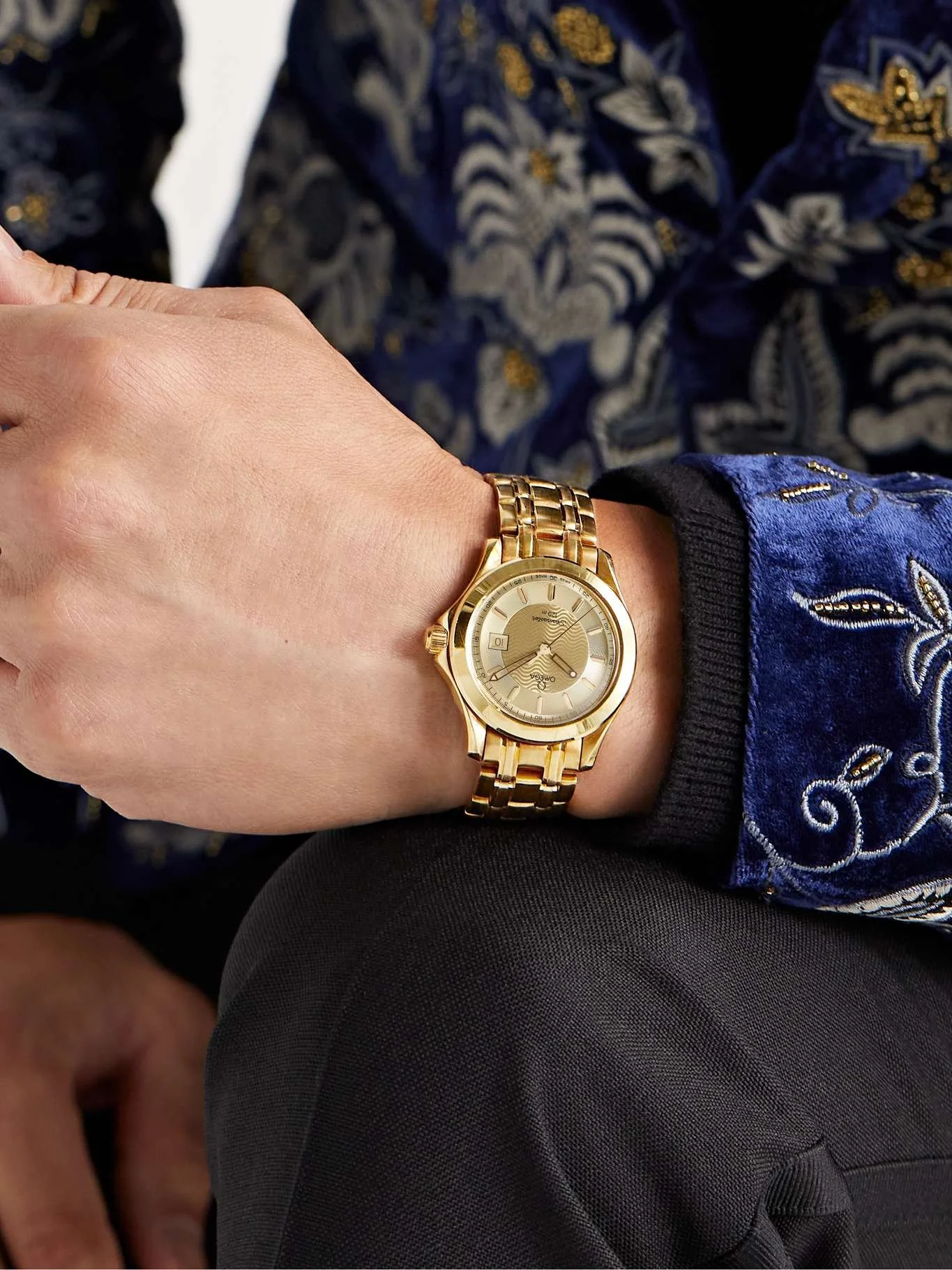 This Seamaster reference 168.1501 / 196.1501 is a brilliant, solid gold wristwatch. The lyre lugs are reminiscent of those found in the iconic Huguenin Frères cases for the seminal OMEGA Speedmasters. However, the timepiece bears an indication on the interior caseback that it was in fact produced in Italy. The exterior also features the Omani Khanjar engraving of the Sultan Qaboos. The watch is powered by the quartz calibre 1438. The lug width is 18mm wide and the bracelet features a deployant clasp. The watch has a diameter of 36mm (42.5mm lug-to-lug) with a height of just under 10mm. The hollow sword hands allow the wearer to always admire the dial’s wave motif.