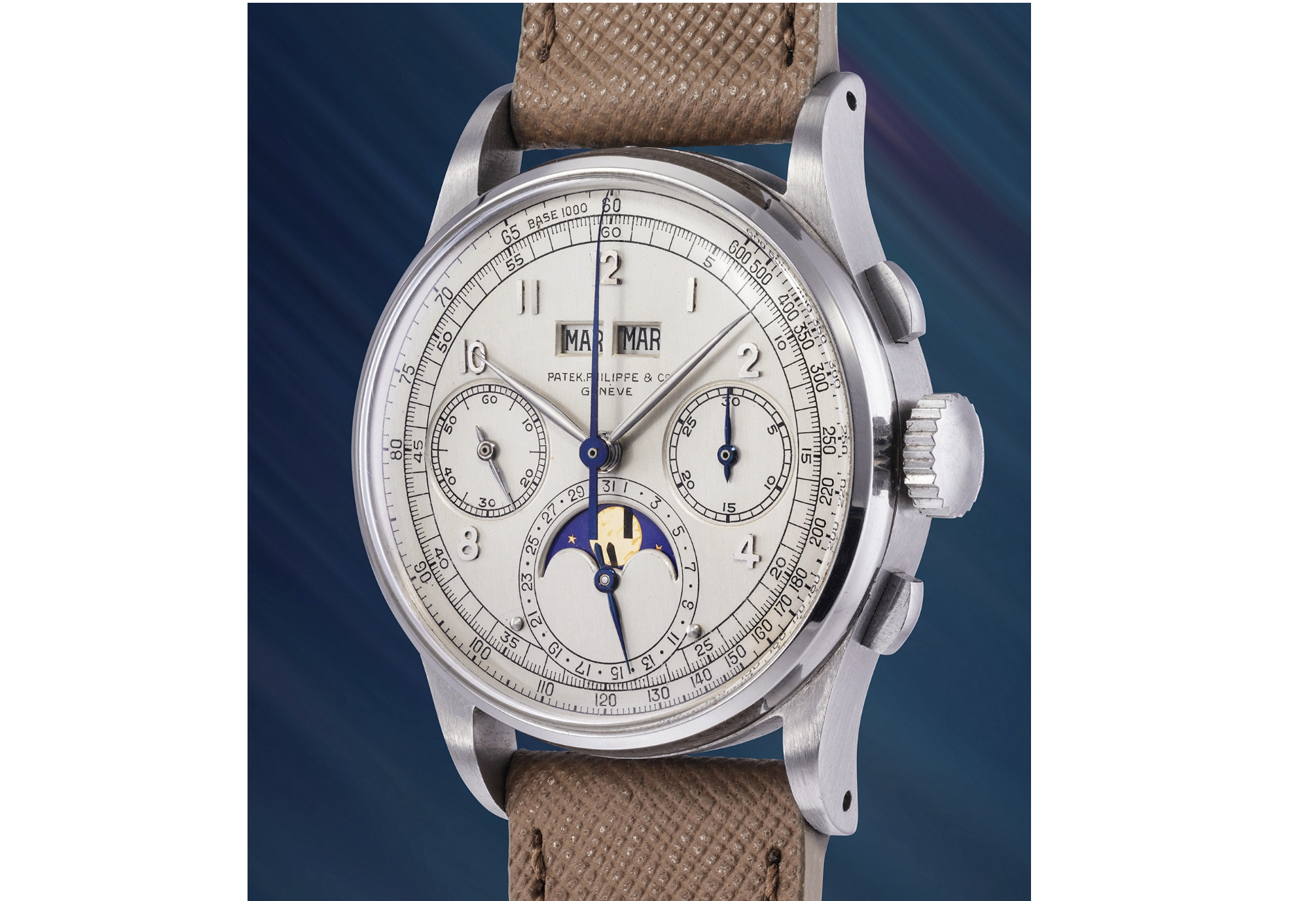 The top lot is the steel 1518. It is one of five privately known (four publicly known) and was last sold in 2017 for $11 million. The dial has been reprinted on this example three times. It is a beautiful and well-known example and the first one made. I love white metal Patek Philippe watches. It broke the record this year for a vintage wristwatch.