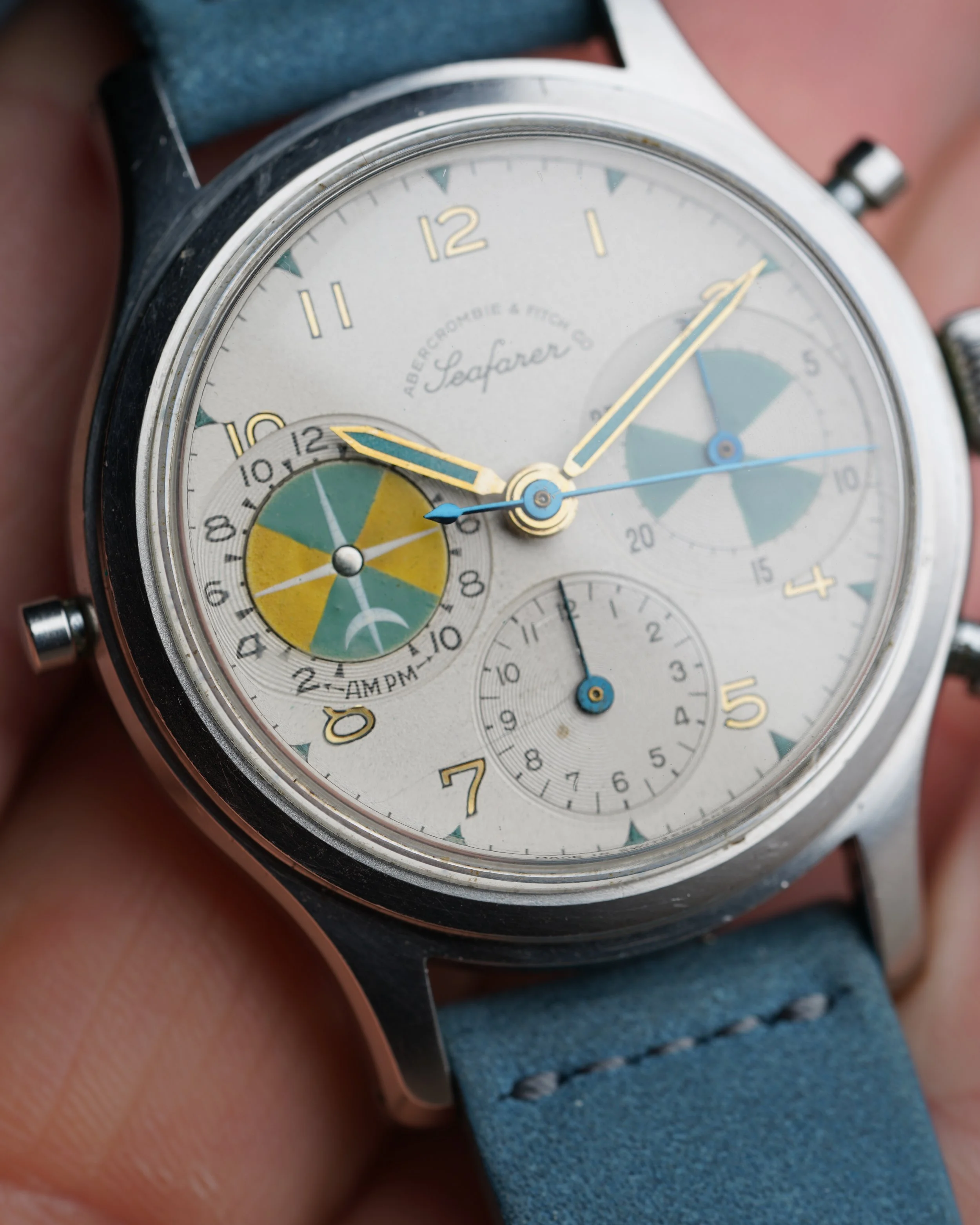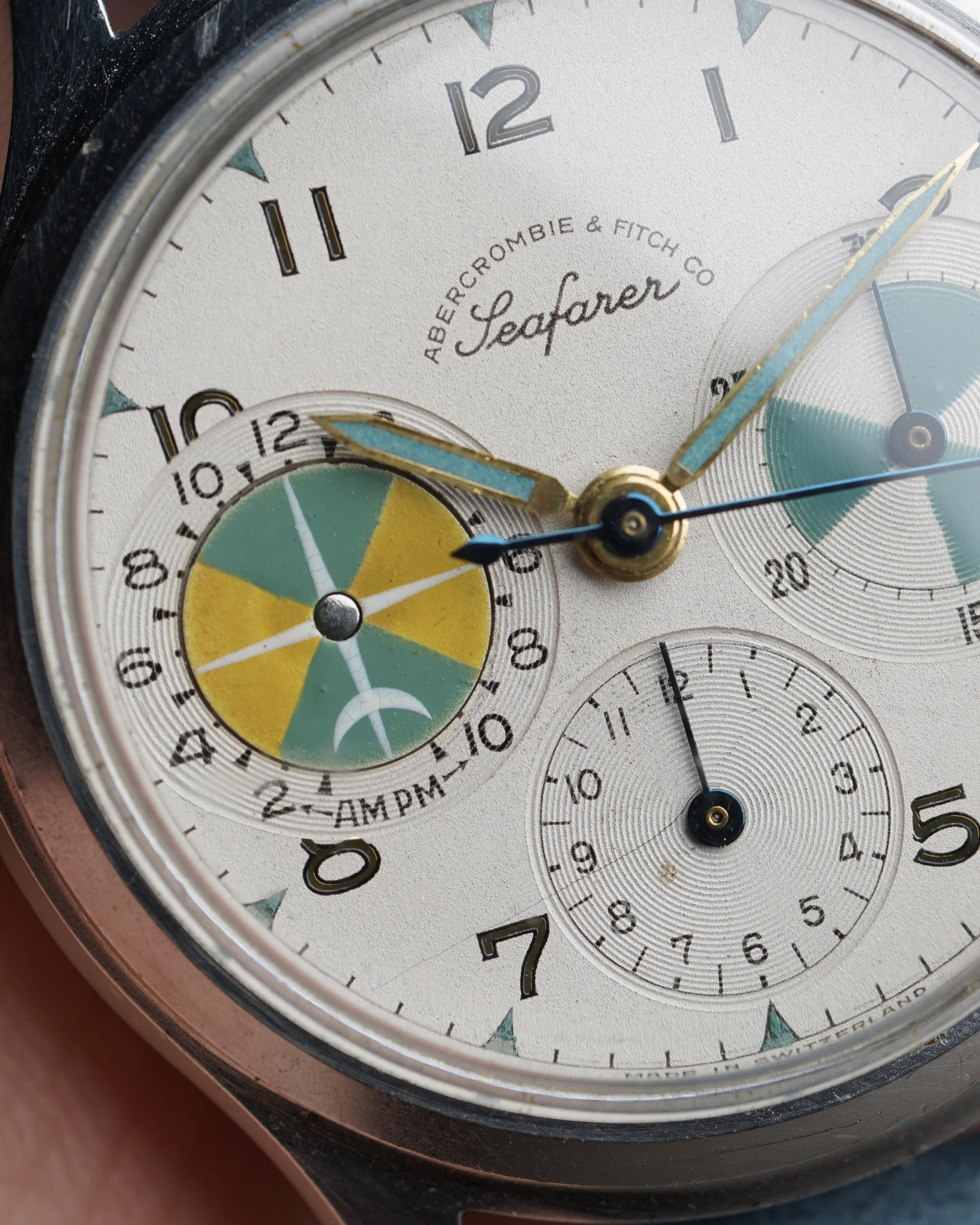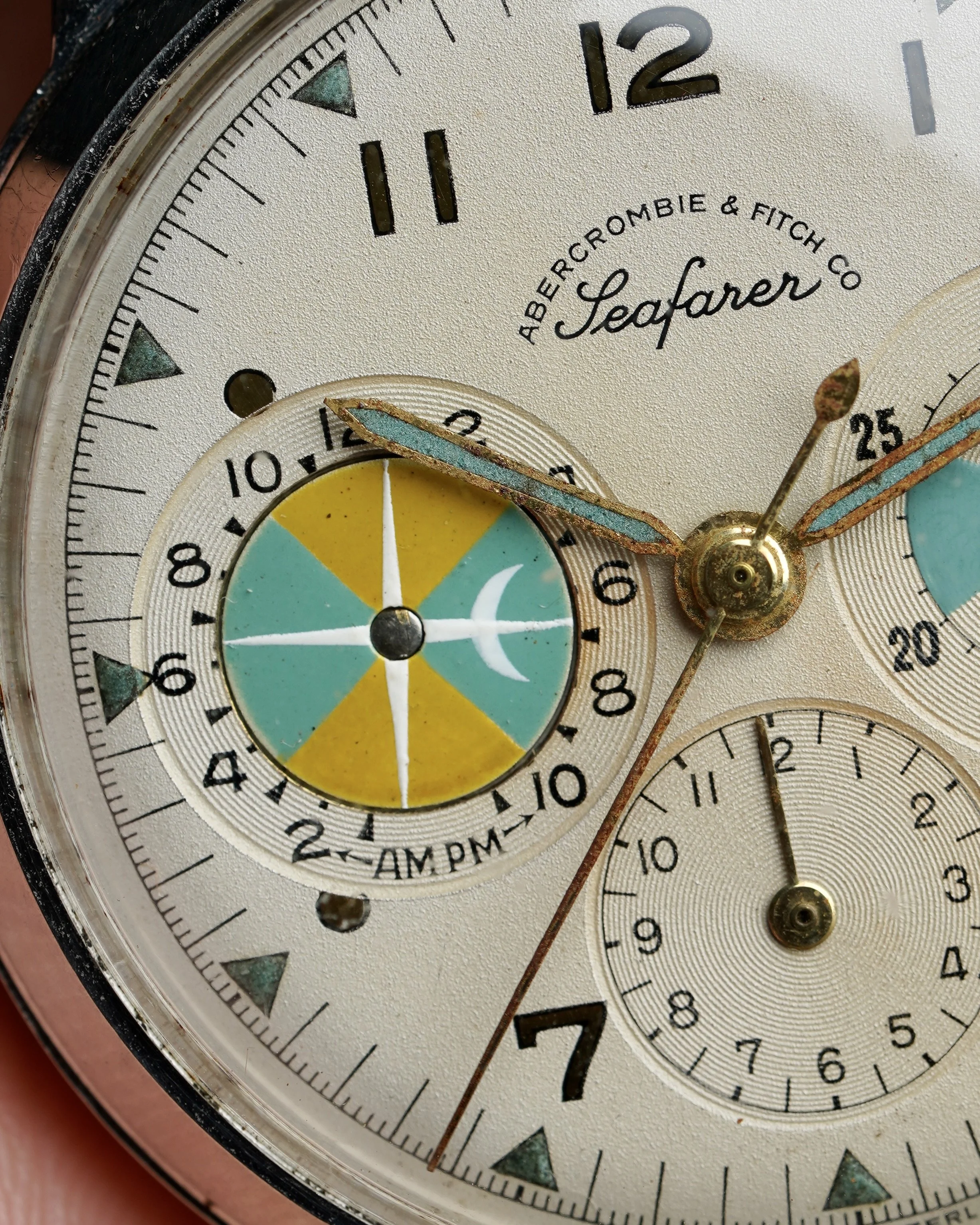 The Abercrombie & Fitch Seafarer was introduced in circa 1949 with the reference 346 and the model remained in production across six different references until the early 1970s. Seafarers are one of the most captivating vintage watches for their daring dial colors and tidal display. The dials feature interesting signatures with an arched “Abercrombie & Fitch” and the “Seafarer” font underneath, almost in a chain-stitching style. The solunar theory suggests that sportsmen can determine the best times of the day to hunt and fish based on the positions of the moon and corresponding tides. Abercrombie & Fitch would take notice of John Alden Knight’s solunar theory for outdoorsman looking to take advantage of the ideal times for hunting and fishing. Each vintage Seafarer model features the tide indication at 9 o’clock to gauge optimal times for these activities. These models also feature a 30-minute subsidiary register at 3 o’clock used for timing yacht races with 5-minute demarcations.