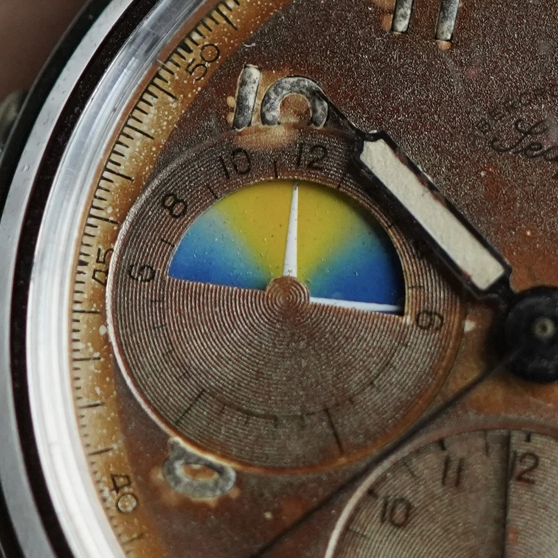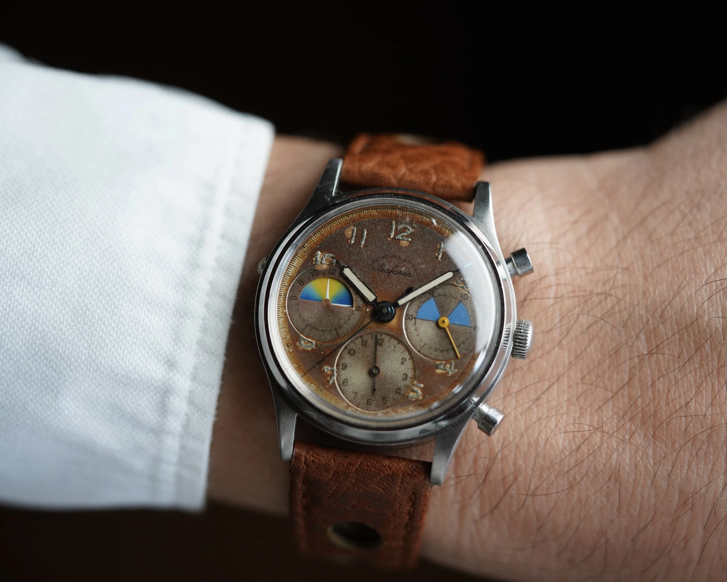The Abercrombie & Fitch Seafarer reference 346 was introduced in circa 1949 and remained in production for a short period until the early 1950s. This model used a modified Valjoux 71 to incorporate a tide complication. The reference 346 would be the only model without a modified Valjoux 72. The Valjoux 71 was.a thicker calibre than the later Valjoux 72 and the reference 346 featured a robust steel case. They wear similar to the vintage Longines calibre 13ZN chronographs and Rolex Pre-Daytona ‘Prisoner of War’ reference 3525 watches, but larger. The first generation of the tide indicators have a covered section, while the slightly more common 2nd generation has a fully visible tide indication disc. These cases measure 37.5mm in diameter and 44mm lug-to-lug. There is also at least one rare version signed Heuer Mareographe instead of Abercrombie & Fitch Seafarer.