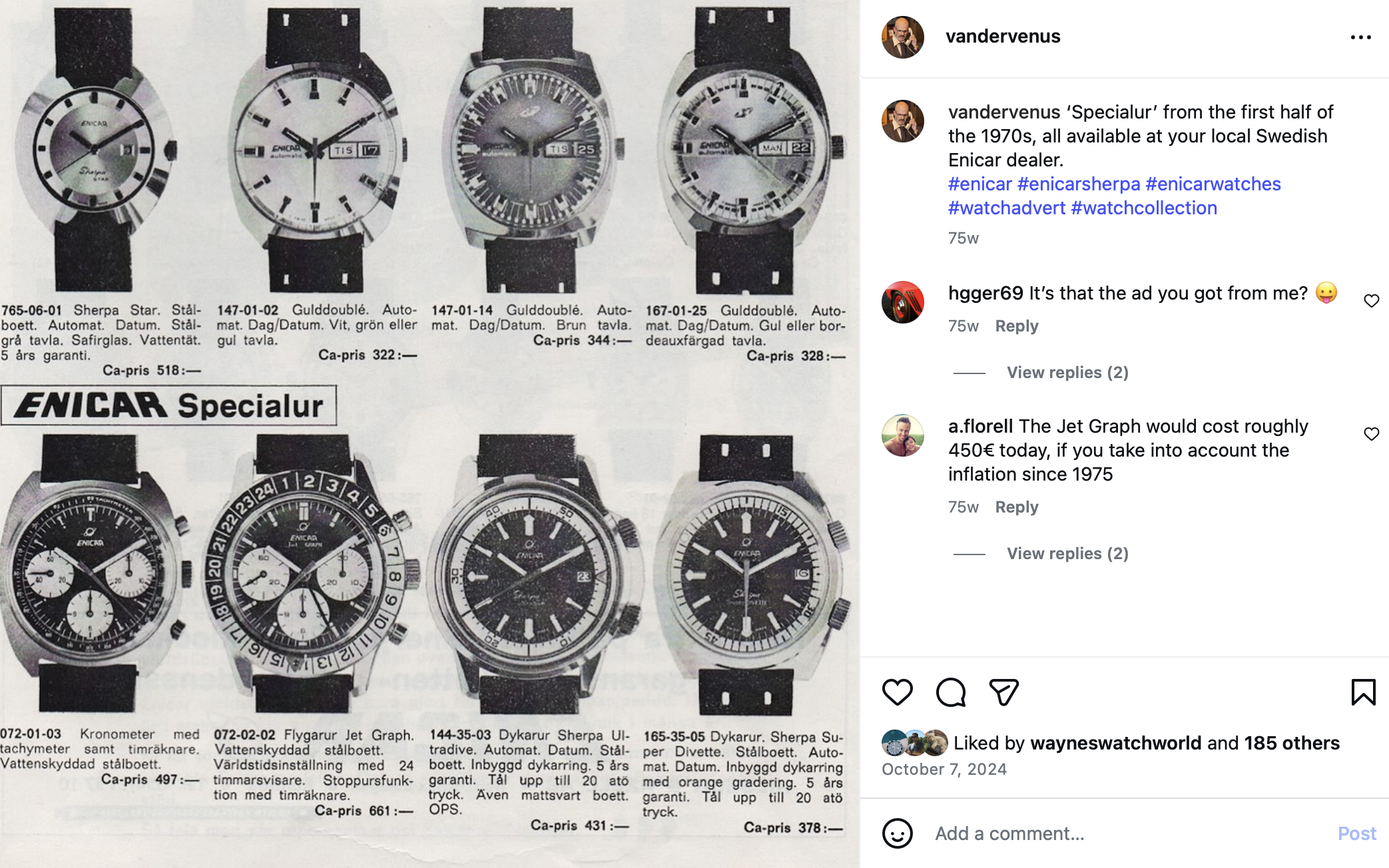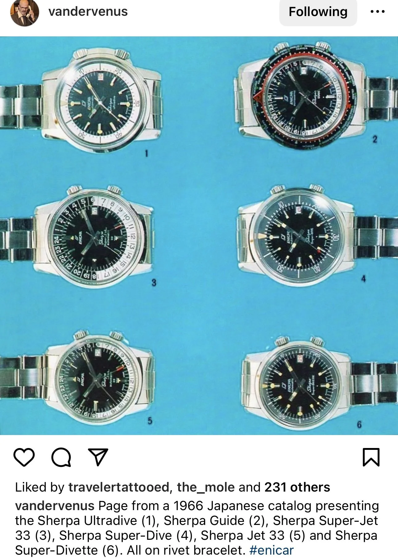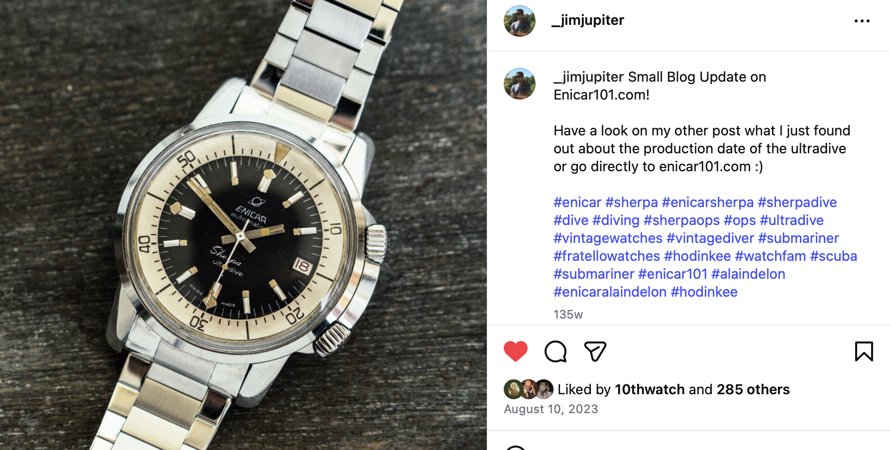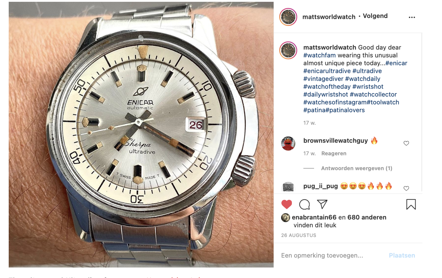 My introduction to this watch came leading up the release of an awesome book, Time for a Change, Discovering Vintage Enicar by passionate Enicar collector Martijn van der Ven (@vandervenus). The book was self published in December 2019 and is a unique publication retracing the history of the forgotten watch manufacturer. For those interested in learning about vintage Enicar, or vintage watches in general, it is certainly a must read! The standout watches within the book for me were the divers - the king of which is the 144/35/03! I’ve kept an eye out for them over the years, but was never was able to score one.