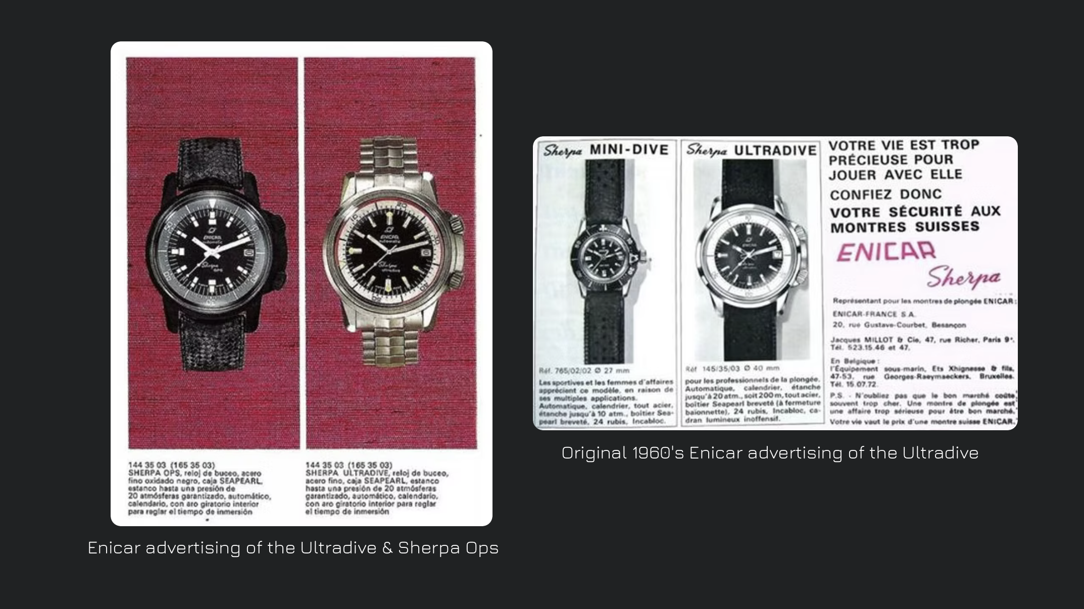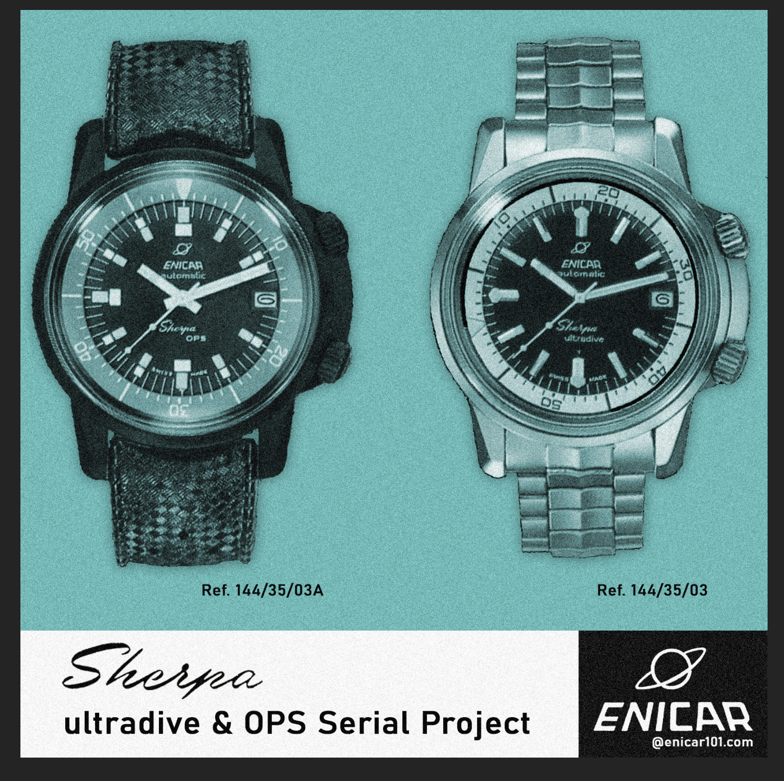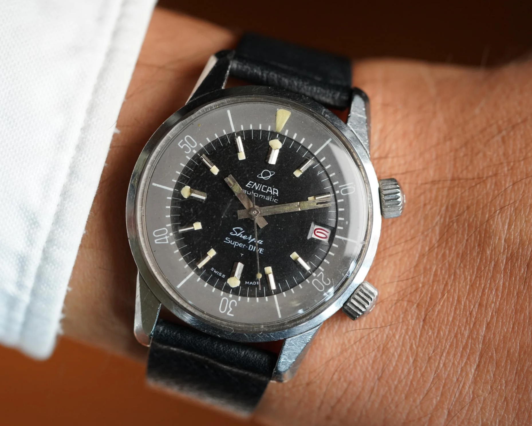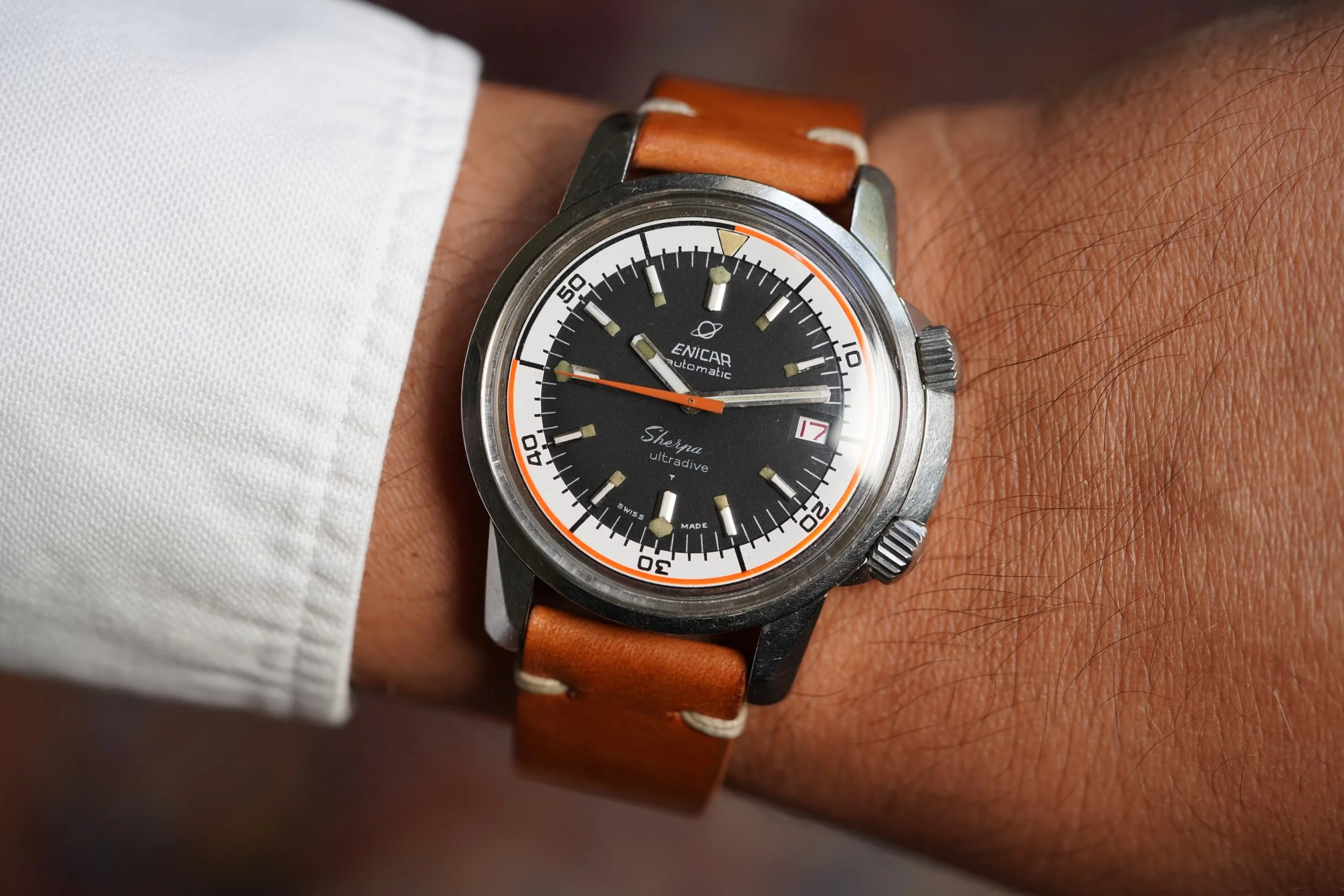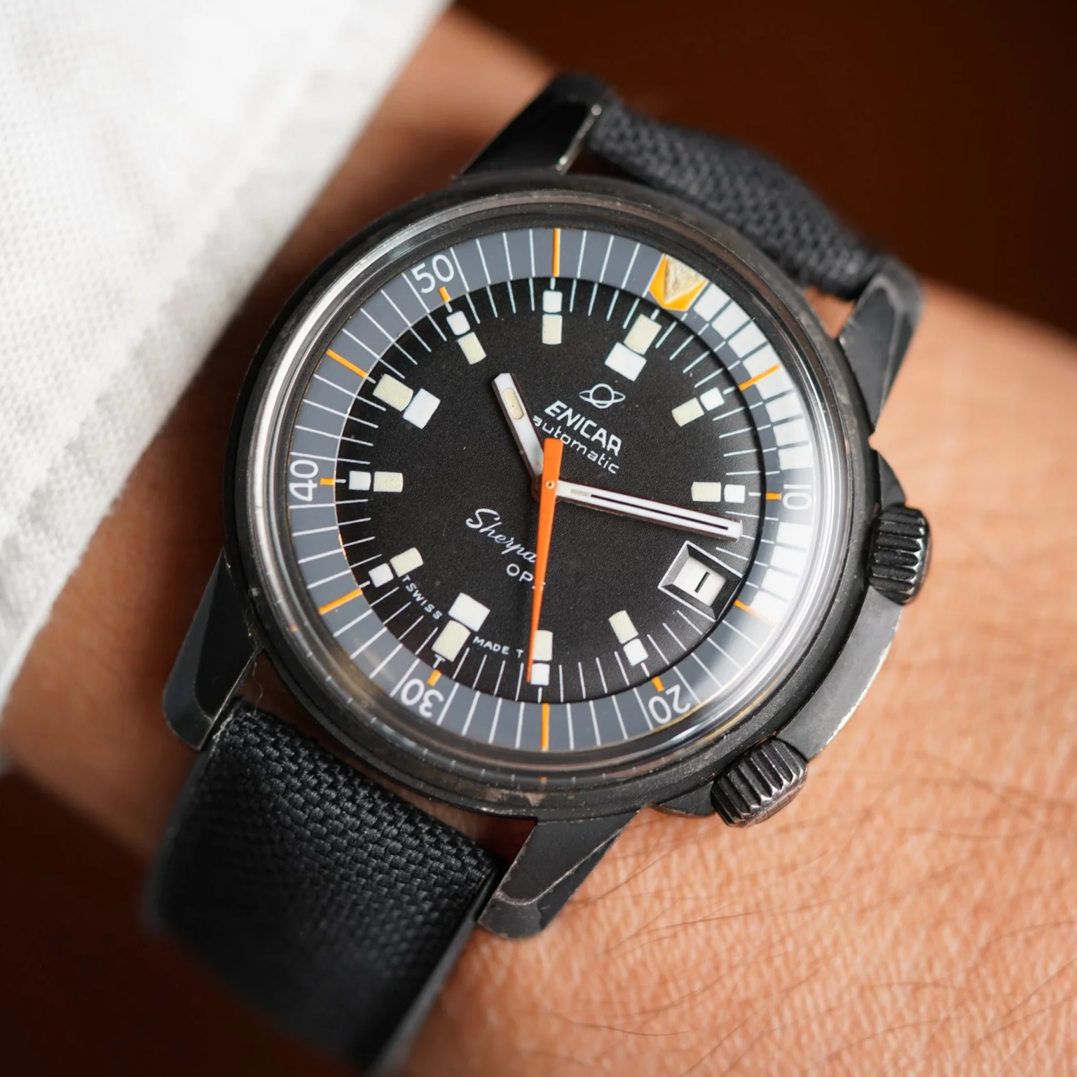 As far as alternative Enicar models, there are some options that fit the dual-crown theme. You can opt for the Sherpa Ops reference 144/35/03A (Essentially, the sibling model to the Ultradive featuring a PVD coated case). There is also the Enicar Ocean Pearl Alarm. While a bit smaller of a substitute diver, you can also go for the Sherpa Super Dive or the Sherpa Super Jet. Additionally, the time-only Sherpa reference 144-59-01 is a large case model similar to the Ultradive.
