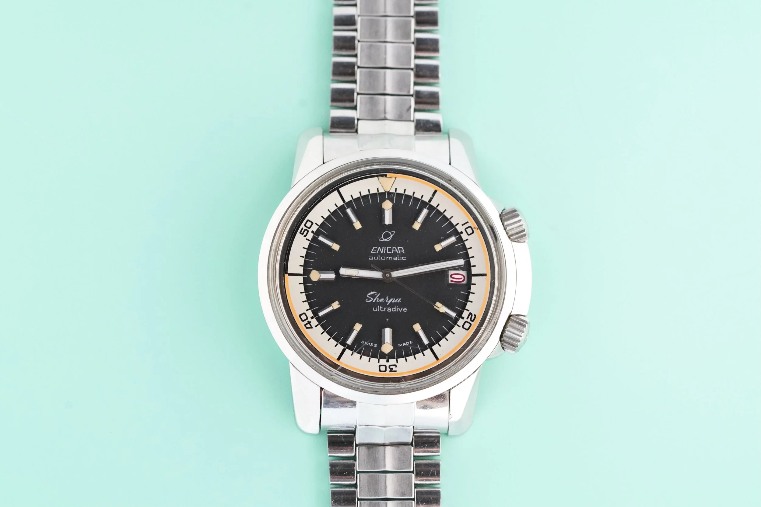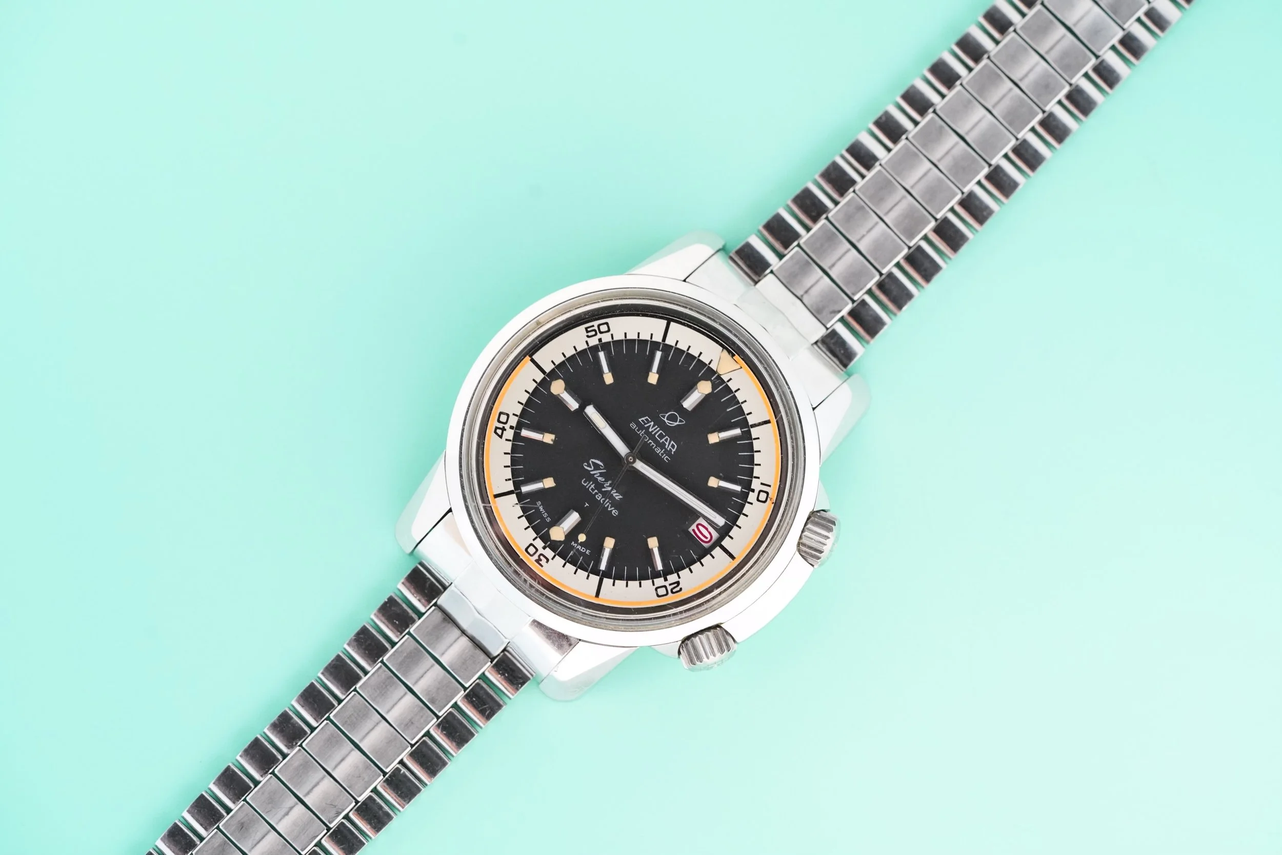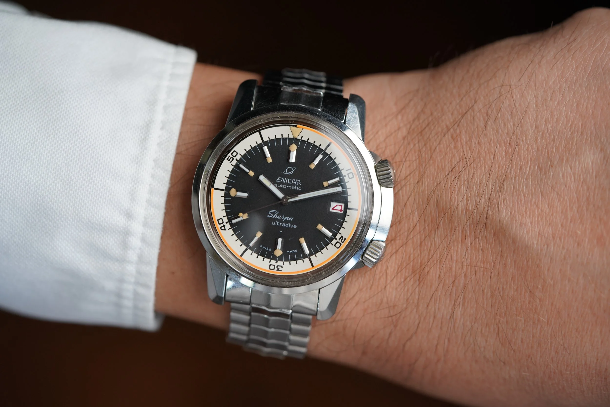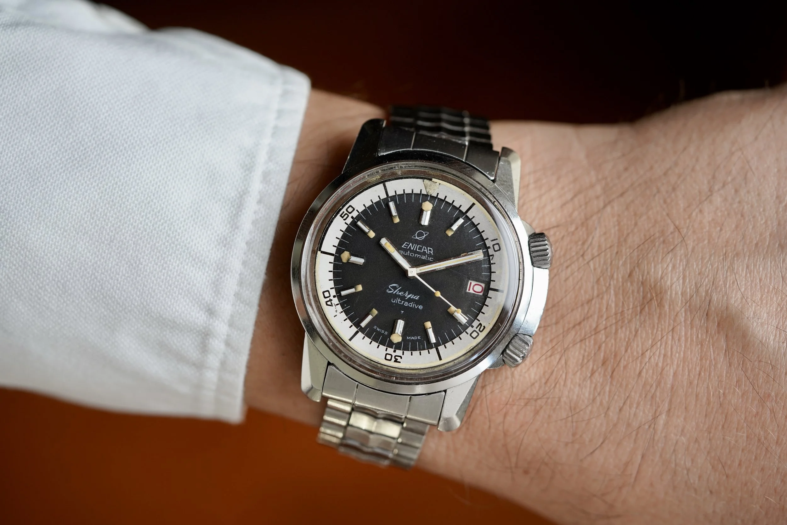 I’m obsessed with dual-crown watches. This interest began with Jaeger-LeCoultre Memovox alarm watches, and the aesthetic has remained a fixture in my collection since I started. I may be one of the only people in history to look at the 1960s Rolex Submariner and think “That’s great, but just imagine if it had a second crown!” My list of favorite watches consists of several dual-crown models such as the legendary LeCoultre Deep Sea Alarm reference E 857, my Jaeger-LeCoultre Memovox reference E 850 and the iconic Jaeger-LeCoultre Memovox reference E 855. This genre is not exclusively alarm watches. One of these less obvious dive watches that has remained on my mind over the years is none other than the Enicar Sherpa Ultradive reference 144/35/03.