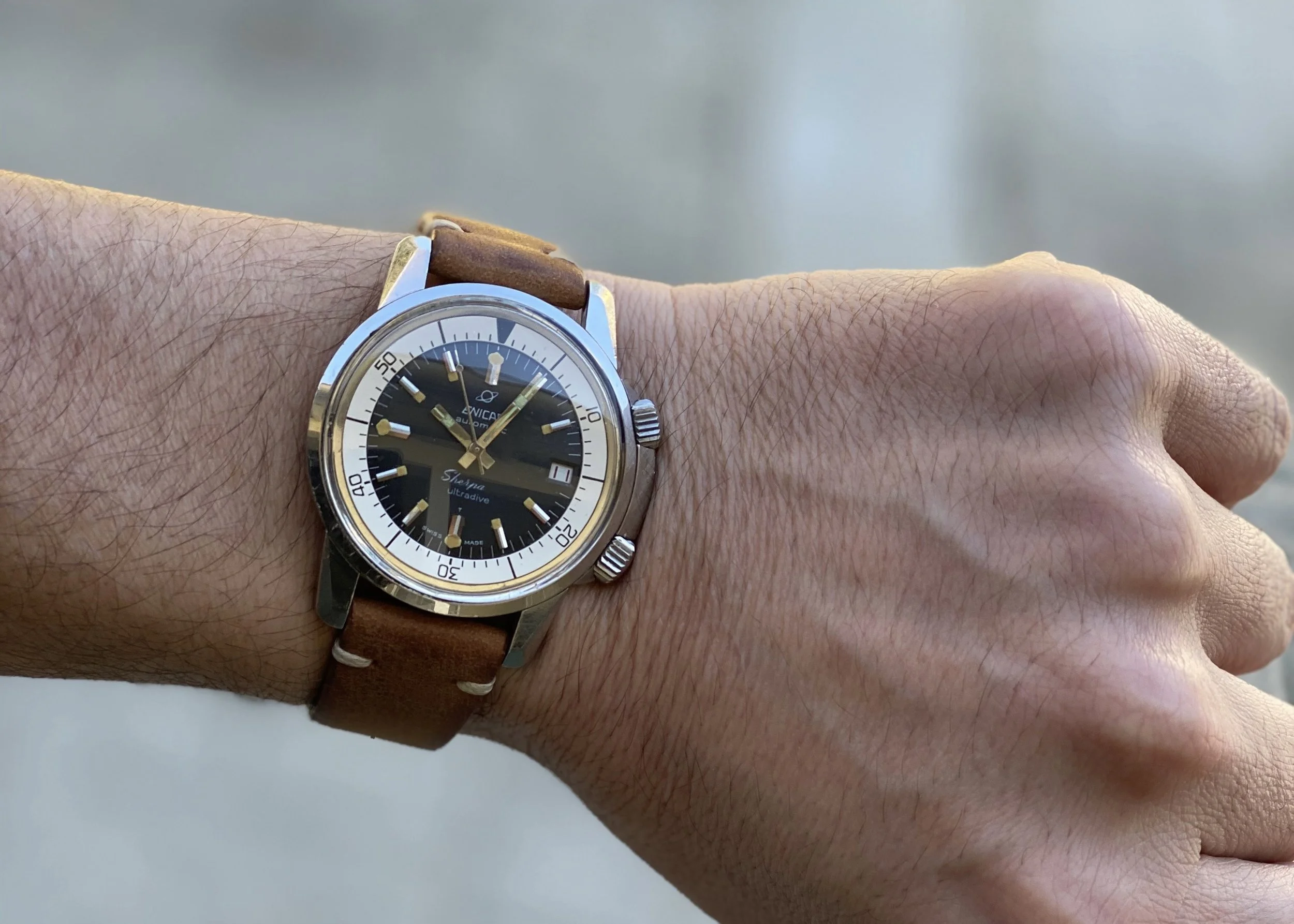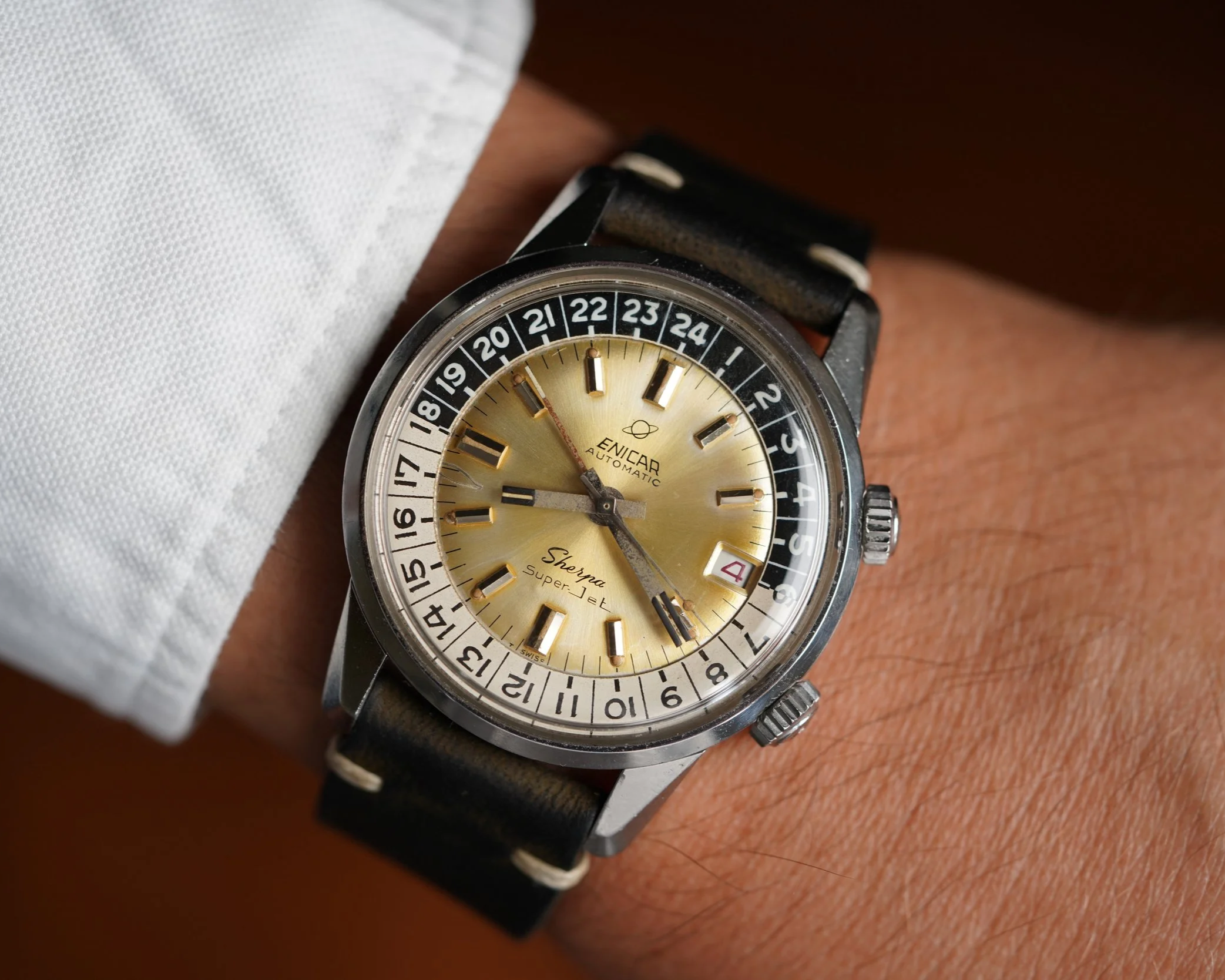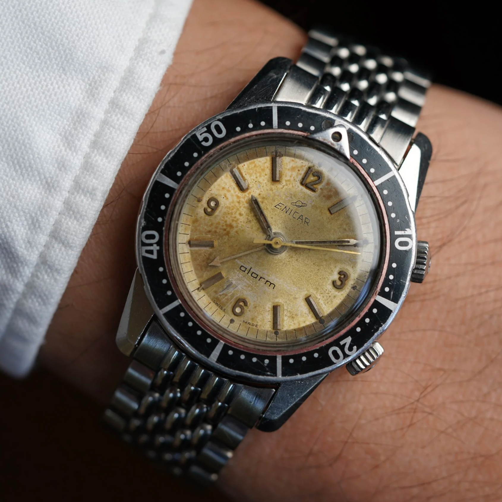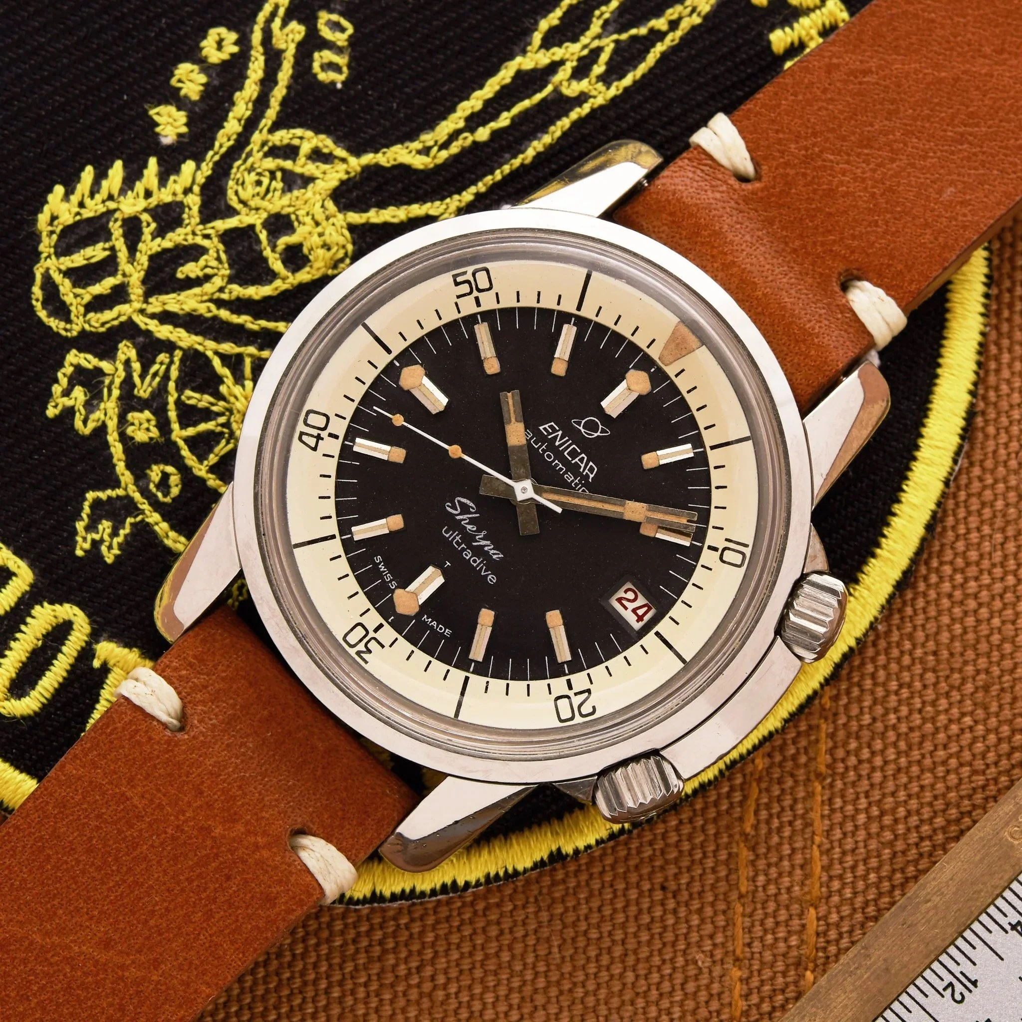I’m obsessed with dual-crown watches. This interest began with Jaeger-LeCoultre Memovox alarm watches, and the aesthetic has remained a fixture in my collection since I started. I may be one of the only people in history to look at the 1960s Rolex Submariner and think “That’s great, but just imagine if it had a second crown!” My list of favorite watches consists of several dual-crown models such as the legendary LeCoultre Deep Sea Alarm reference E 857, my Jaeger-LeCoultre Memovox reference E 850 and the iconic Jaeger-LeCoultre Memovox reference E 855. This genre is not exclusively alarm watches. One of these less obvious dive watches that has remained on my mind over the years is none other than the Enicar Sherpa Ultradive reference 144/35/03.